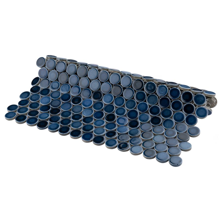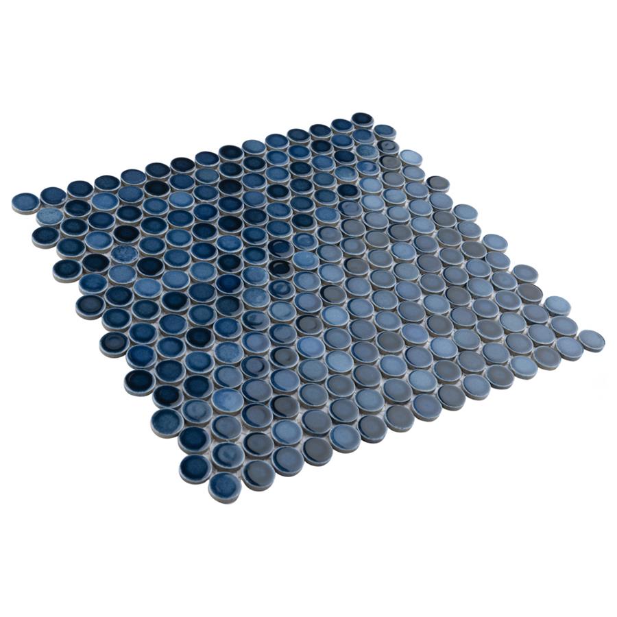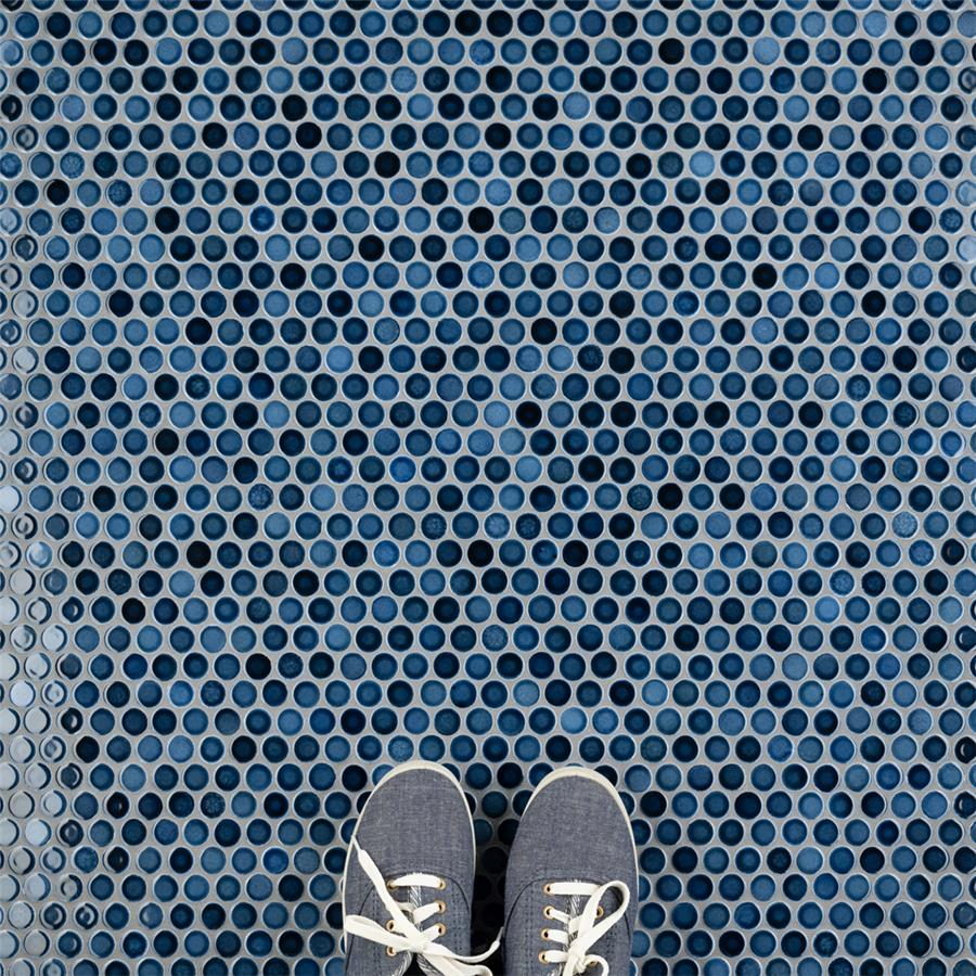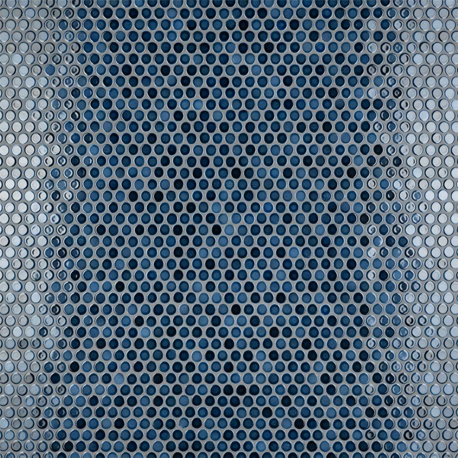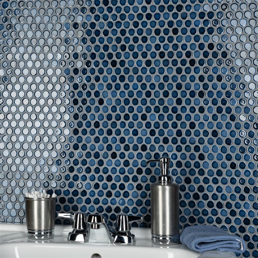 Our Hudson Penny Round Glacier 12 in. x 12-5/8 in. Porcelain Floor and Wall Mosaic Tile is a beautifully tranquil update on the timeless penny round design. Featuring a reactive glaze with an eye-drop effect, these tiles have soothing hues of light and dark blue that blend to white around the edges. This mosaic creates a uniquely sporadic design through a pleasing mixture of cool-toned tints with additional dimension added by the smooth, high-gloss finish. Its impervious and frost-resistant features make this penny tile an ideal choice for indoor and outdoor floor and wall installations including kitchen backsplashes, bathroom showers and accent walls. This penny round tile can be used as a whole sheet or cut into smaller strips as an accent piece. It is a perfect choice on its own or coordinated with other colors in our Hudson Penny Round series. Tile is the better choice for your space. This tile is made from natural ingredients, making it a healthy choice as it is free from allergens, VOCs, formaldehyde and PVC.