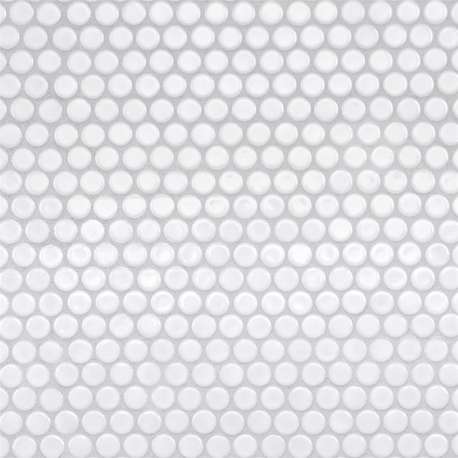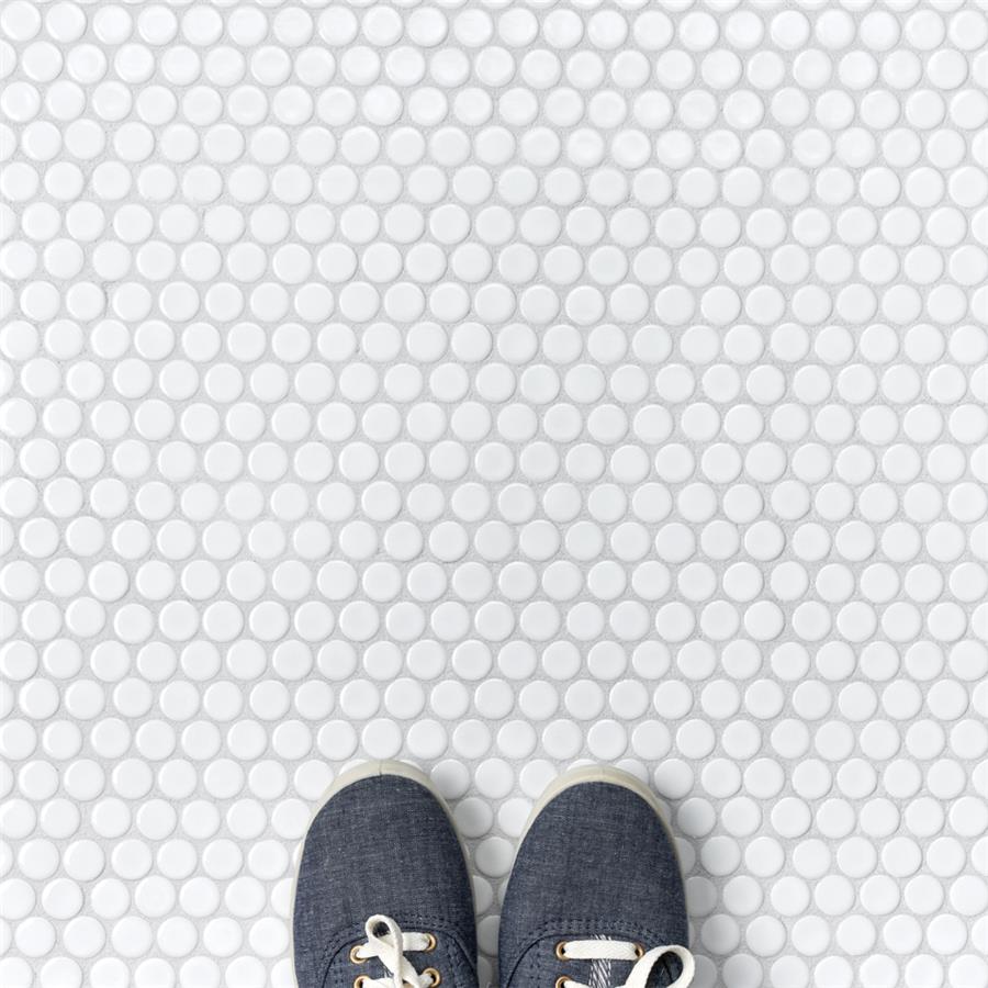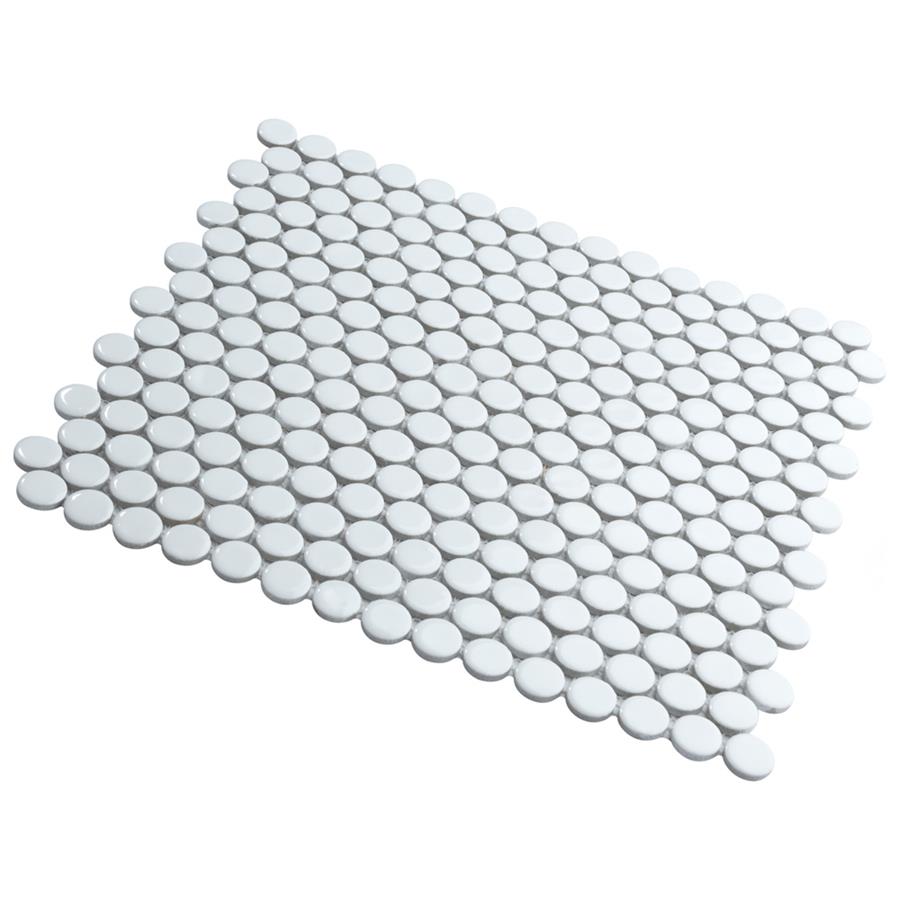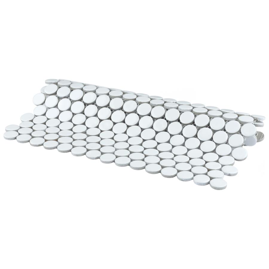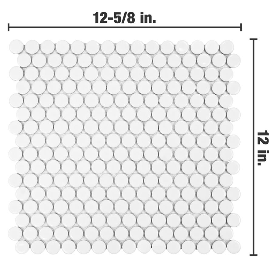 Our Hudson Penny Round Glossy White 12 in. x 12-5/8 in. x 5 mm Porcelain Mosaic Tile lends a refreshing aesthetic to the classic penny round shape.This mosaic tile features a uniformly glazed surface with a smooth texture and a glossy white color tone. It offers a versatile appearance thatis unique yet simplistic enough to integrate into any design, ranging from traditional style renovations to modern home projects.Its impervious and frost-resistant features make this penny tile an ideal choice for indoor and outdoor floor and wall installations including, kitchen backsplashes, bathroom showers and accent walls. This penny round tile can be used as a whole sheet or cut into smaller strips as an accent piece. It is a perfect choice on its own or coordinated with other colors in our Hudson Penny Round series. Tile is the better choice for your space. This tile is made from natural ingredients, making it a healthy choice as it is free from allergens, VOCs, formaldehyde and PVC.