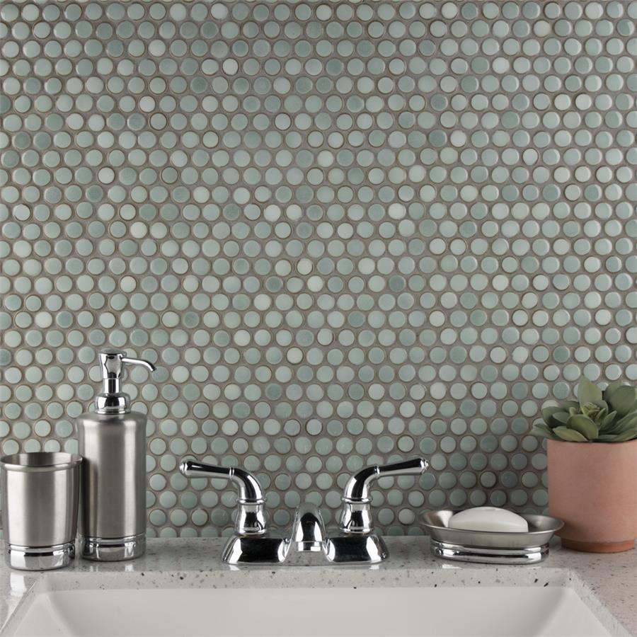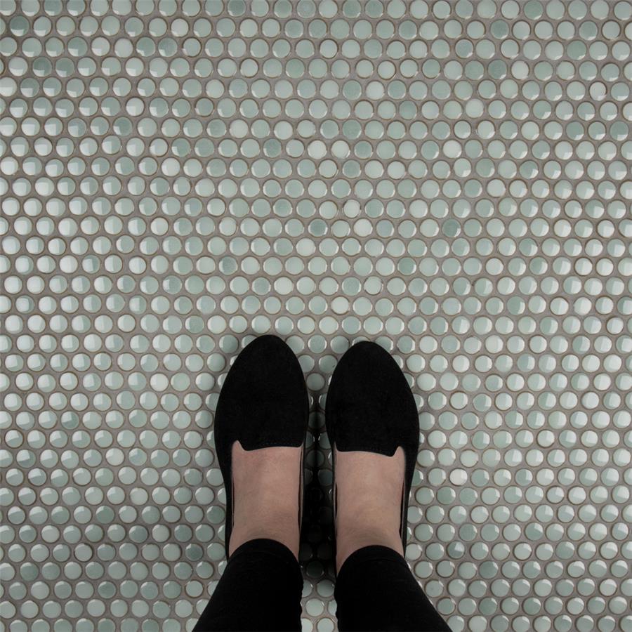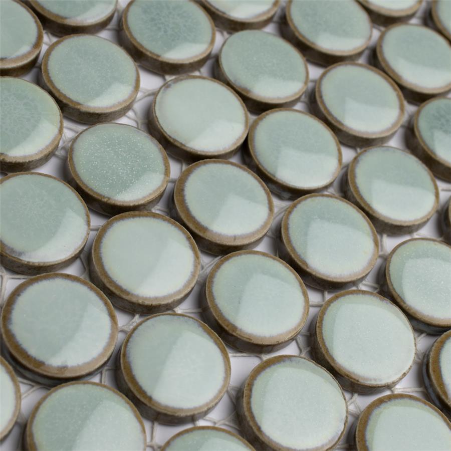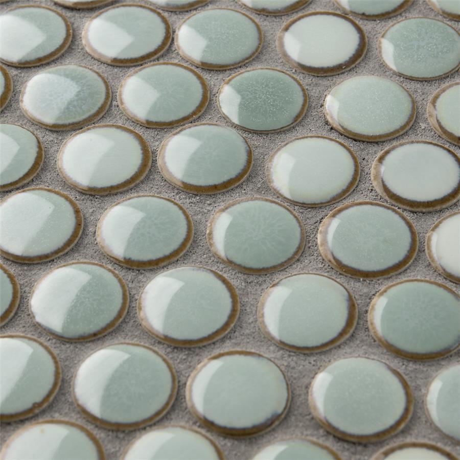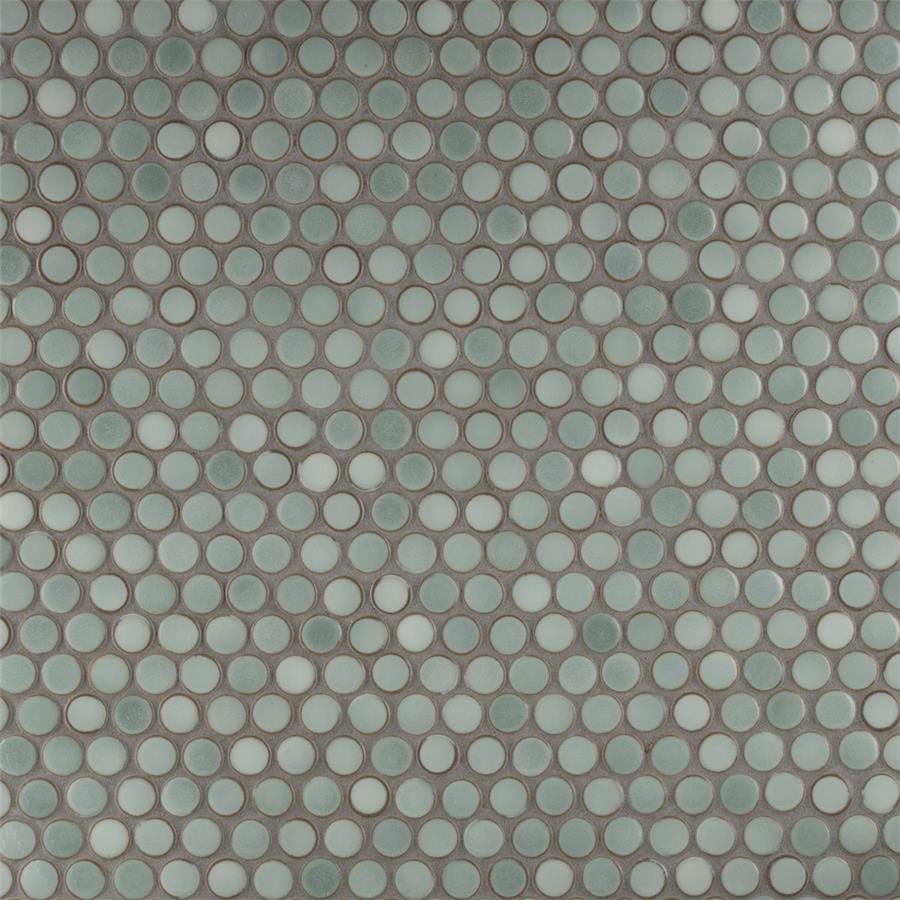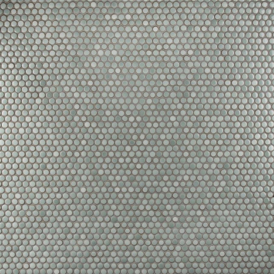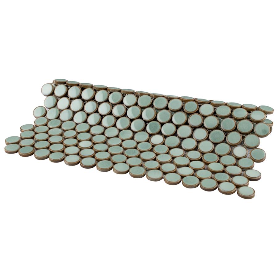 Our Hudson Penny Round Mint Green 12 in. x 12-5/8 in. x 5 mm Porcelain Mosaic Tile is a beautifully tranquil update on the timeless penny round design. Featuring a reactive glaze with an eye-drop effect, these tiles have varying shades of mint and pastel green that blend to taupe around the edges. This mosaic creates a uniquely sporadic design through a pleasing mixture of cool-toned tints with additional dimension added by the smooth, high-gloss finish. Its impervious and frost-resistant features make this penny tile an ideal choice for indoor and outdoor floor and wall installations including, kitchen backsplashes, bathroom showers and accent walls. This penny round tile can be used as a whole sheet or cut into smaller strips as an accent piece. It is a perfect choice on its own or coordinated with other colors in our Hudson Penny Round series. Tile is the better choice for your space. This tile is made from natural ingredients, making it a healthy choice as it is free from allergens, VOCs, formaldehyde and PVC.