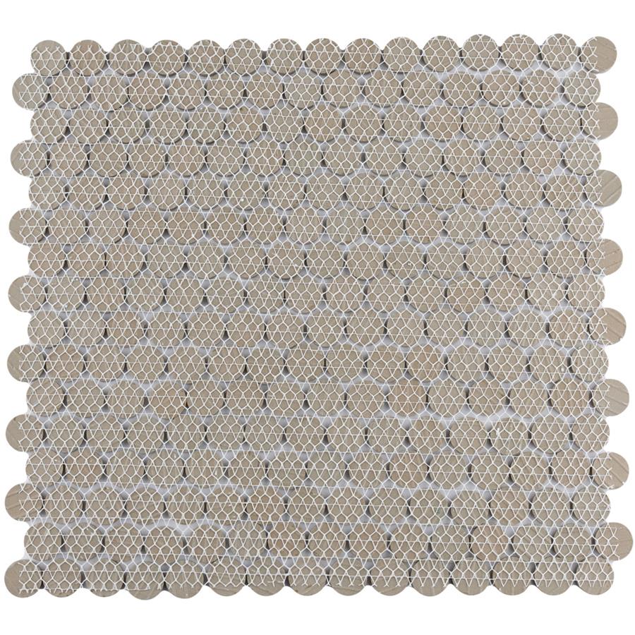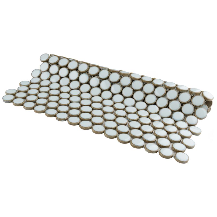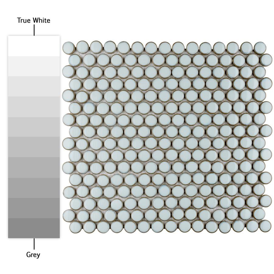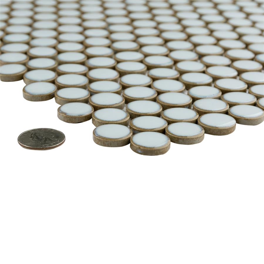 Our Hudson Penny Round Silk White 12 in. x 12-5/8 in. x 5 mm Porcelain Mosaic Tile is a beautifully tranquil update on the timeless penny round design. Featuring a reactive glaze with an eye-drop effect, these tiles have soft, silk white color tone that blend to taupe around the edges. This mosaic is a pleasing mixture of cool-toned tints with additional dimension added by the smooth, high-gloss finish. Its impervious and frost-resistant features make this penny tile an ideal choice for indoor and outdoor floor and wall installations including, kitchen backsplashes, bathroom showers and accent walls. This penny round tile can be used as a whole sheet or cut into smaller strips as an accent piece. It is a perfect choice on its own or coordinated with other colors in our Hudson Penny Round series. Tile is the better choice for your space. This tile is made from natural ingredients, making it a healthy choice as it is free from allergens, VOCs, formaldehyde and PVC.