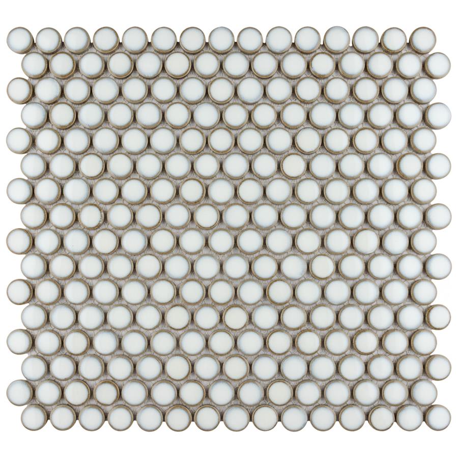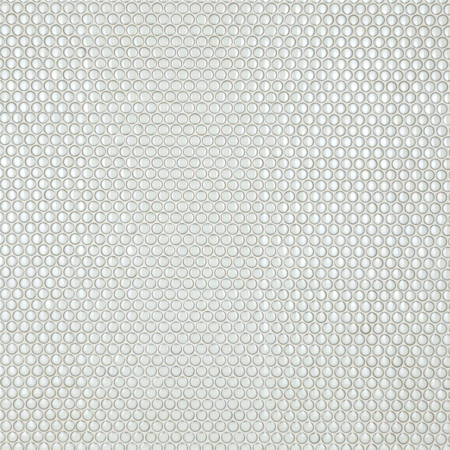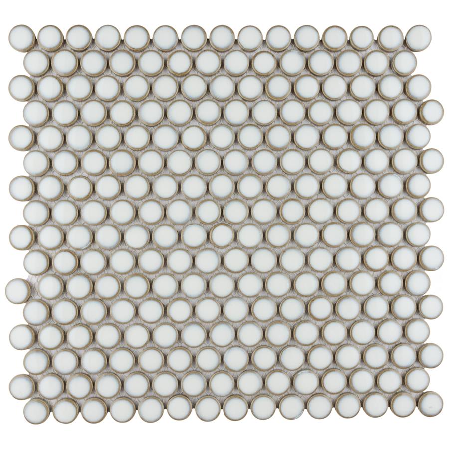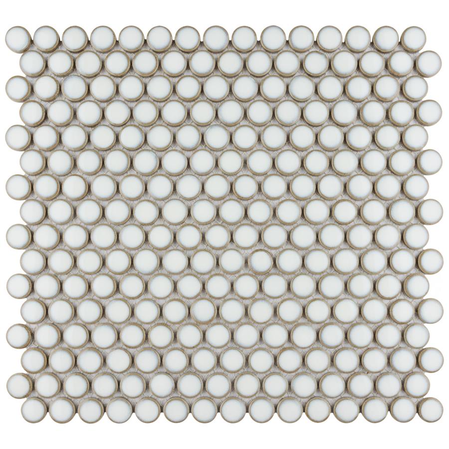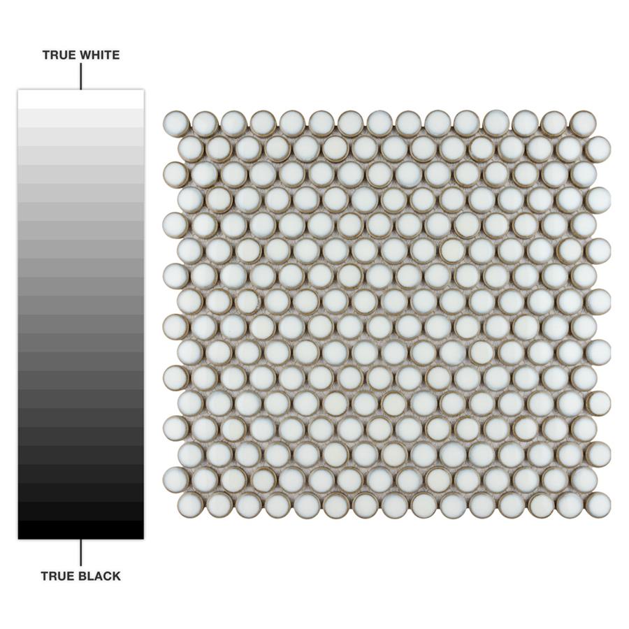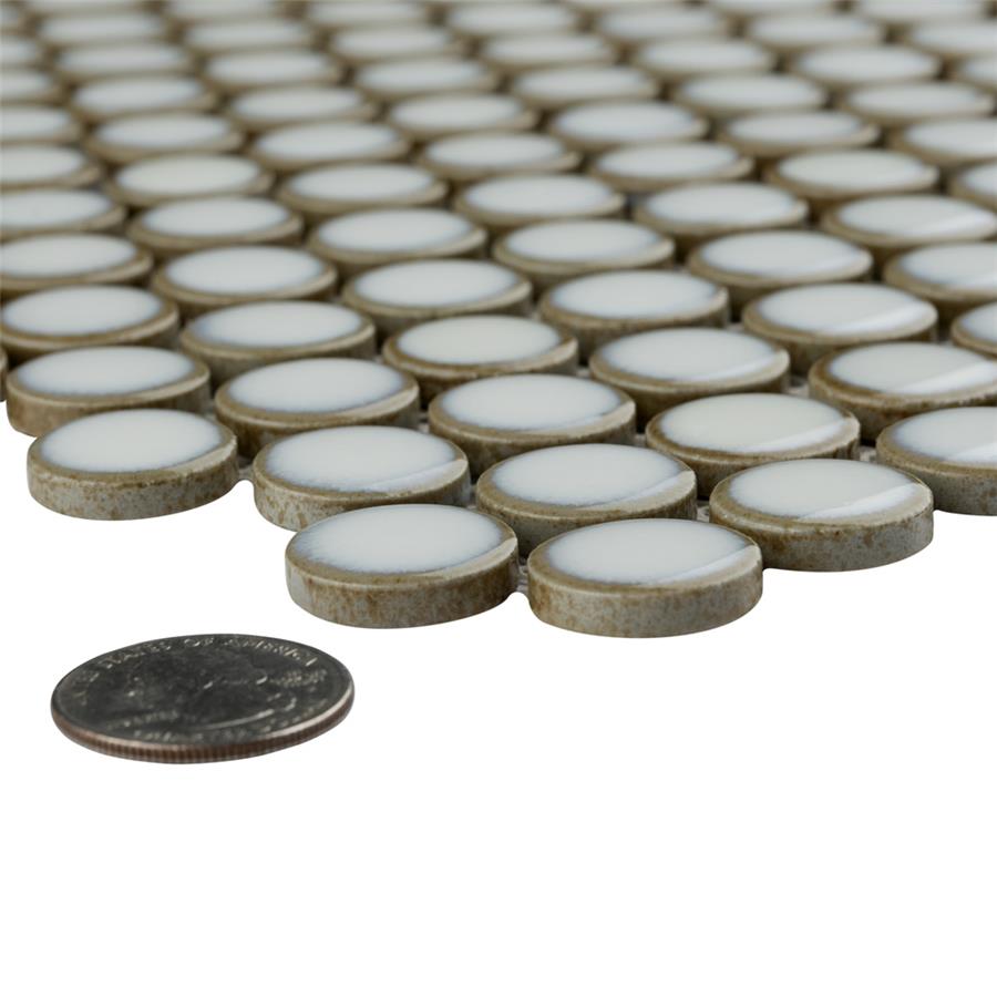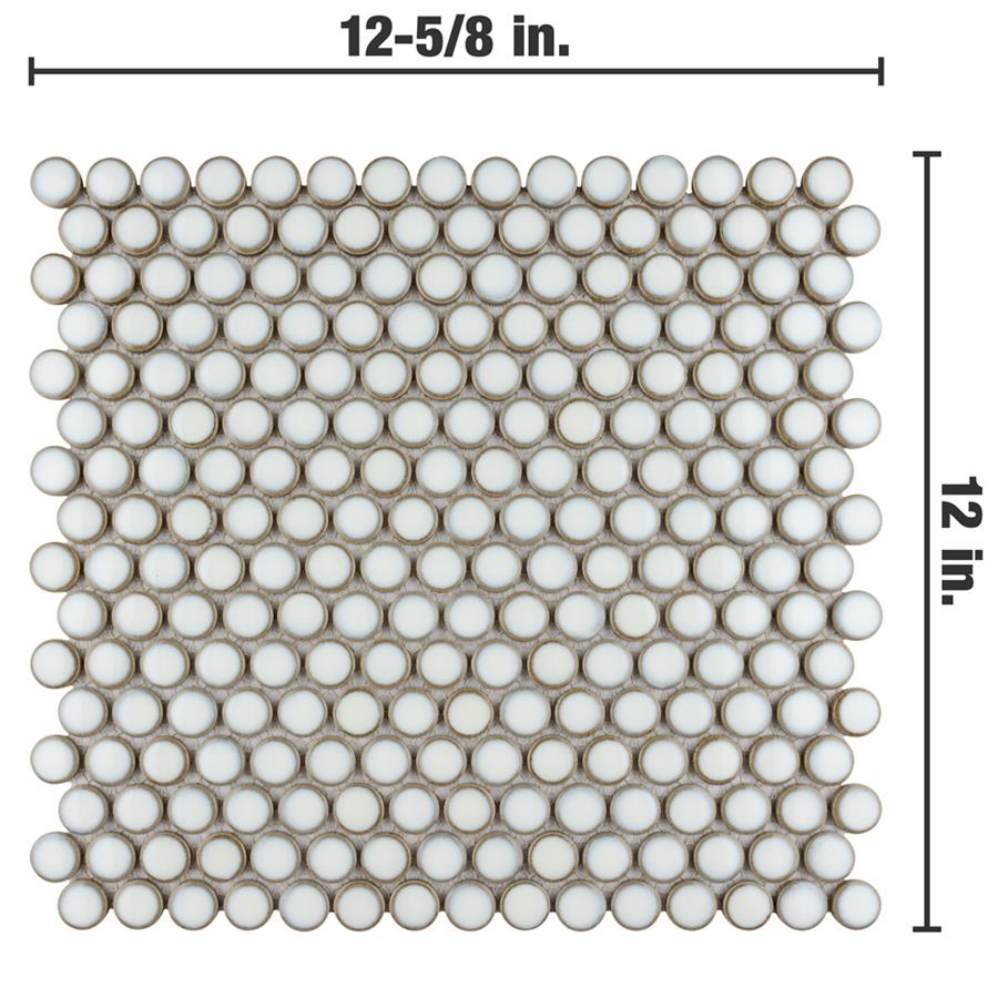 Our Hudson Penny RoundSnowcap White12 in. x 12-5/8 in. x 5 mm Porcelain Mosaic Tile is a beautifully tranquil update on the timeless penny round design. Featuring a reactive glaze with an eye-drop effect, these tiles have a classic white color tone that blend to sepia around the edges. This mosaic creates a uniquely sporadic design through a pleasing mixture of neutral hues with additional dimension added by the smooth, high-gloss finish. Its impervious and frost-resistant features make this penny tile an ideal choice for indoor and outdoor floor and wall installations including, kitchen backsplashes, bathroom showers and accent walls. This penny round tile can be used as a whole sheet or cut into smaller strips as an accent piece. It is a perfect choice on its own or coordinated with other colors in our Hudson Penny Round series. Tile is the better choice for your space. This tile is made from natural ingredients, making it a healthy choice as it is free from allergens, VOCs, formaldehyde and PVC.