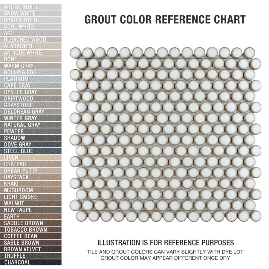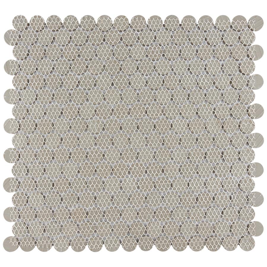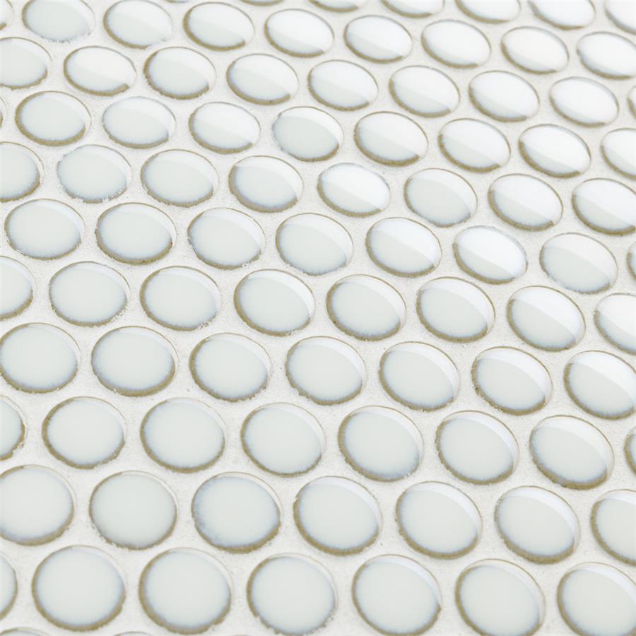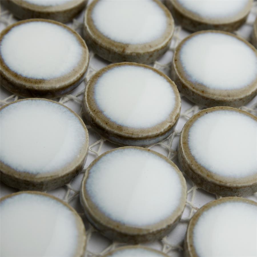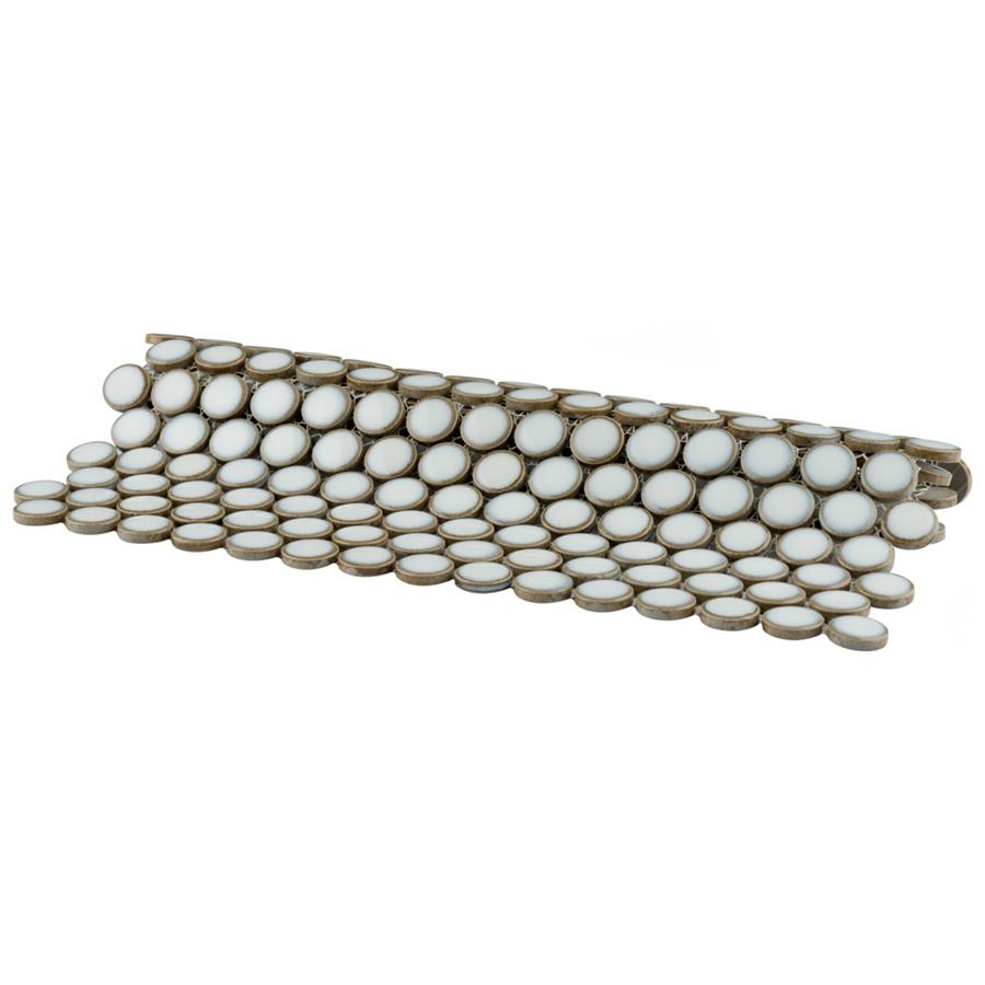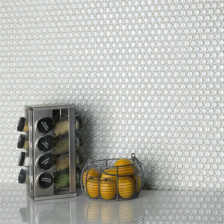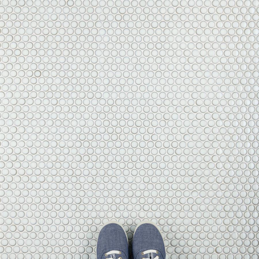 Our Hudson Penny RoundSnowcap White12 in. x 12-5/8 in. x 5 mm Porcelain Mosaic Tile is a beautifully tranquil update on the timeless penny round design. Featuring a reactive glaze with an eye-drop effect, these tiles have a classic white color tone that blend to sepia around the edges. This mosaic creates a uniquely sporadic design through a pleasing mixture of neutral hues with additional dimension added by the smooth, high-gloss finish. Its impervious and frost-resistant features make this penny tile an ideal choice for indoor and outdoor floor and wall installations including, kitchen backsplashes, bathroom showers and accent walls. This penny round tile can be used as a whole sheet or cut into smaller strips as an accent piece. It is a perfect choice on its own or coordinated with other colors in our Hudson Penny Round series. Tile is the better choice for your space. This tile is made from natural ingredients, making it a healthy choice as it is free from allergens, VOCs, formaldehyde and PVC.