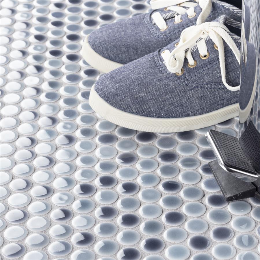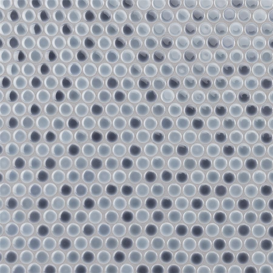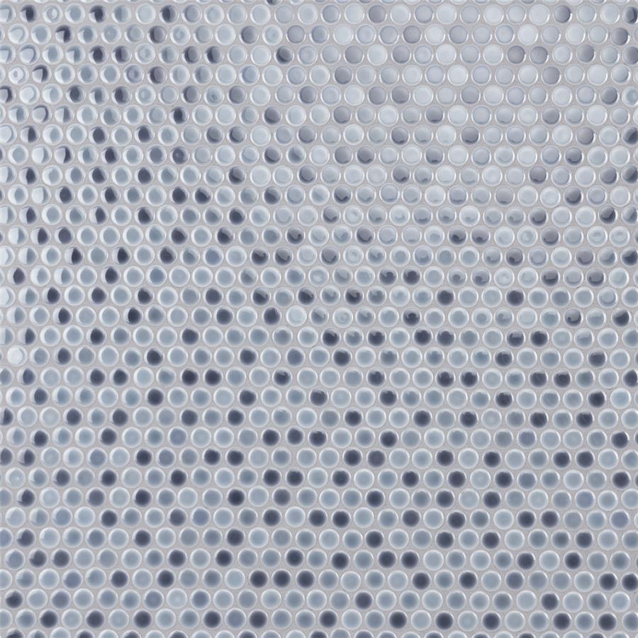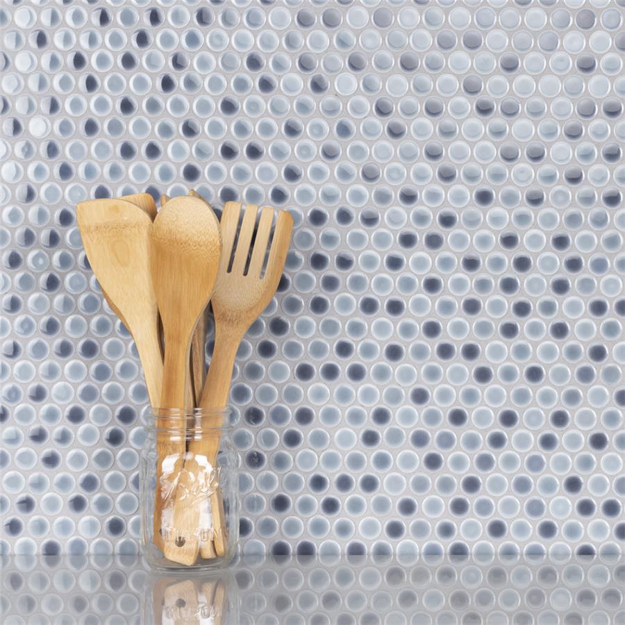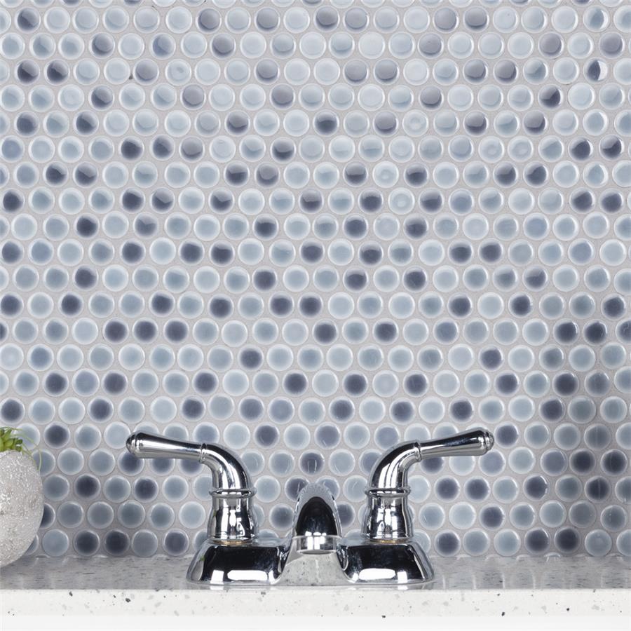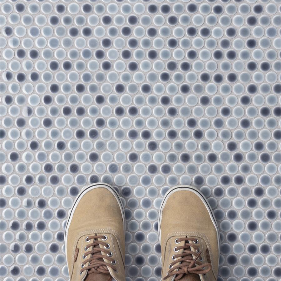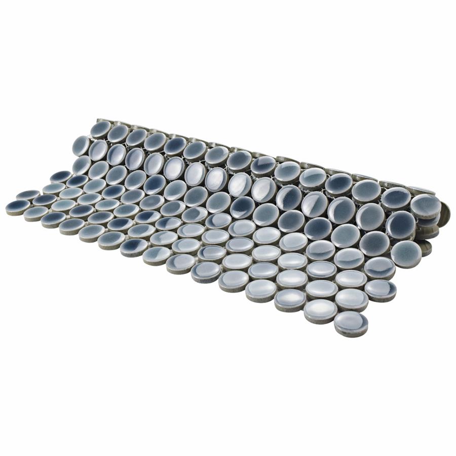 Our Hudson Penny Round Stillwater 12 in. x 12-5/8 in. x 5 mm Porcelain Mosaic Tile is a beautifully tranquil update on the timeless penny round design. Featuring a reactive glaze with an eye-drop effect, these tiles have varying shades of grey, ranging from slate grey to a dark cloudy grey, that blend to white on the edges. This mosaic creates a uniquely sporadic design through a pleasing mixture of cool-toned tints with additional dimension added by the smooth, high-gloss finish. Its impervious and frost-resistant features make this penny tile an ideal choice for indoor and outdoor floor and wall installations including, kitchen backsplashes, bathroom showers and accent walls. This penny round tile can be used as a whole sheet or cut into smaller strips as an accent piece. It is a perfect choice on its own or coordinated with other colors in our Hudson Penny Round series. Tile is the better choice for your space. This tile is made from natural ingredients, making it a healthy choice as it is free from allergens, VOCs, formaldehyde and PVC.