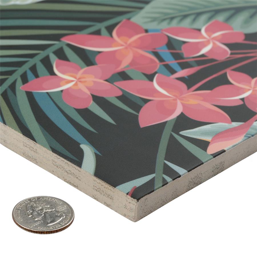 Featuring tropical floral imagery, our Imagine Botanical Paradise 19-3/8″ x 19-3/8″ Porcelain Floor and Wall Tile mimics the appearance of traditional decorative wallpaper in a hygienic, long-lasting and versatile material. This square matte tile effortlessly brings the beauty of the outdoors into any space through visually rich botanical patterns in vibrant pink and green tones that are set on a charcoal black base glaze. These large format tiles undergo a unique third firing process, which ensures color consistency to help create a seamless design for your installation. This tile offers infinite design possibilities and has the ability to reinvent spaces. Its impervious and frost-resistant features make this an ideal choice for indoor and outdoor installations including kitchens, bathrooms, backsplashes, showers, entryways, patios, pools and fireplace facades. Tile is the better choice for your space. This tile is made from natural ingredients, making it a healthy choice as it is free from allergens, VOCs, formaldehyde and PVC.Try out our grout test below to determine which grout color suits your design preferences.