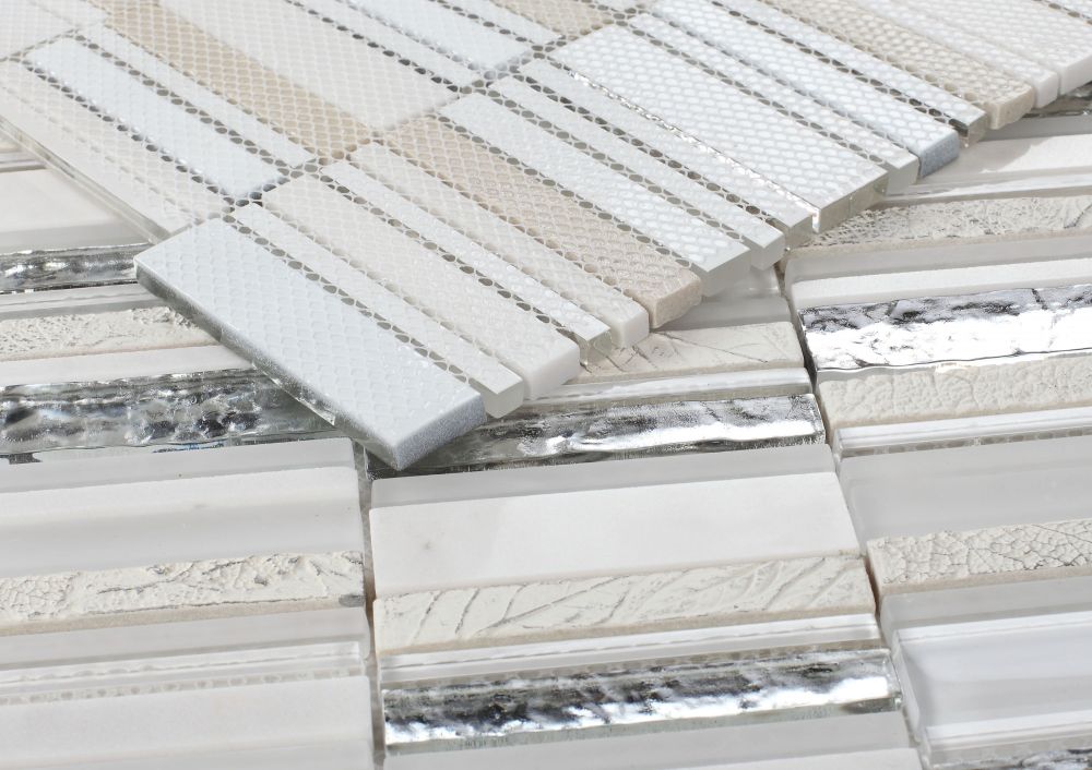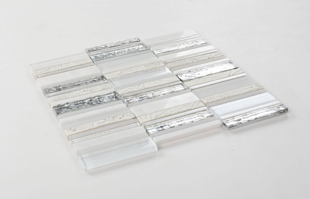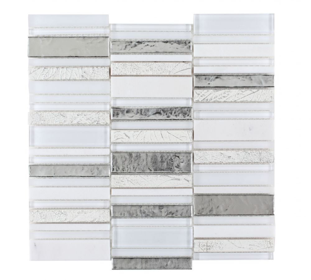 Product Sold By The SheetInga Snow–White marble, Clear white glass and silver glass & white resin deco in slim staggered pattern.Suggested Grout Color: Bostik Dimension Diamond H600WARNING: This product can expose you to chemicals including crystalline silica (airborne particles of respirable size) in dust created during fabrication/installation if the product is dry cut/ground or pulverized, which are known to the State of California to cause cancer. For more information, go to https://www.p65warnings.ca.gov/.
