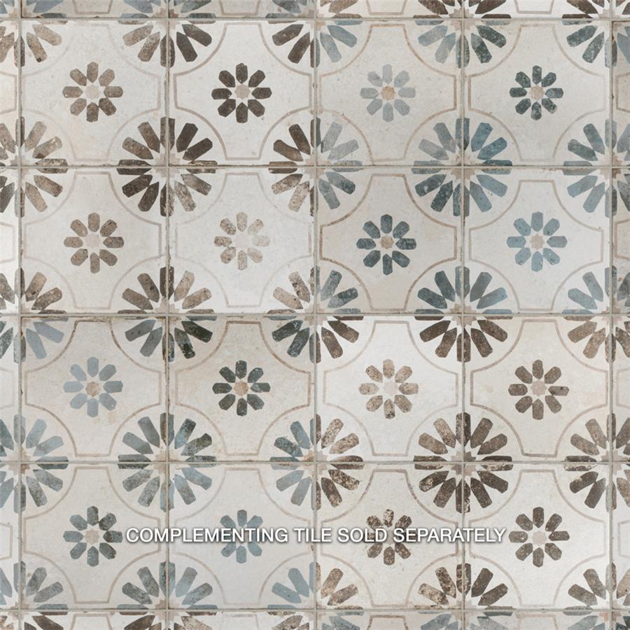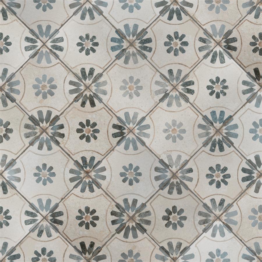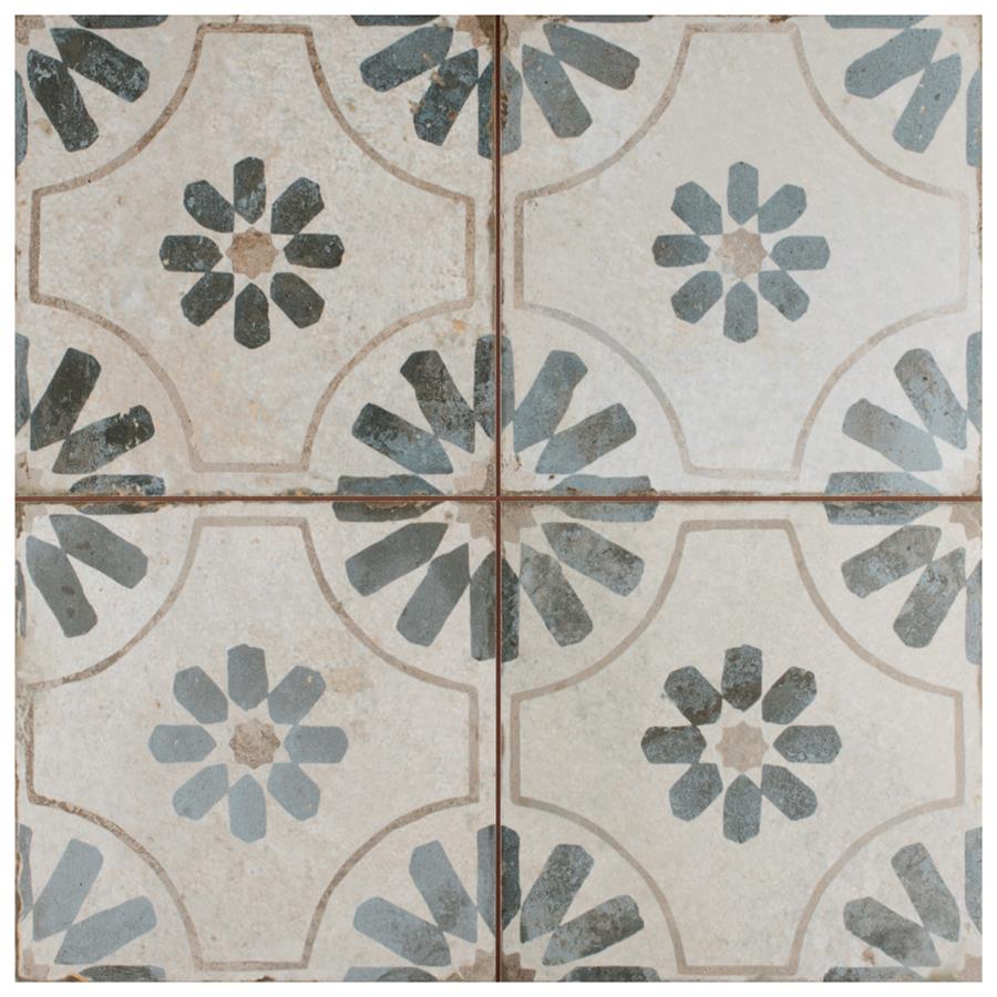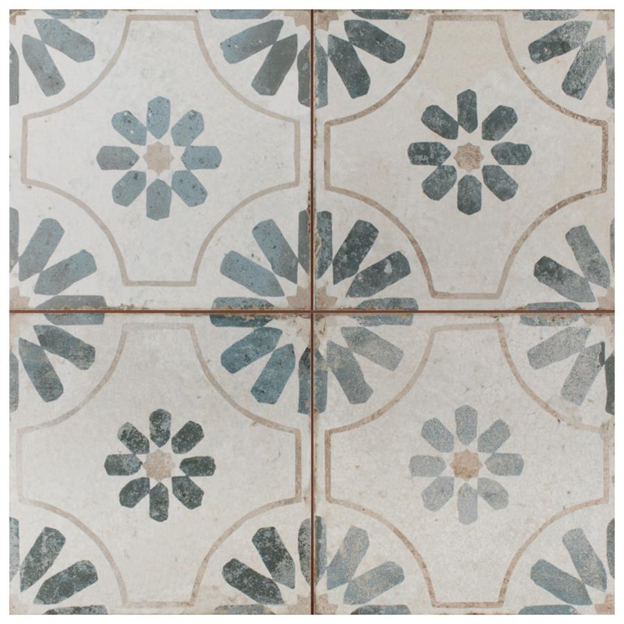 Modern and vintage design elements blend together to create our Kings Blume Blue 17-5/8 in. x 17-5/8 in. Ceramic Floor and Wall Tile. Featuring a worn cement appearance, this tile is a subtle statement piece created by floral motifs in faded shades of denim blue set on an antique white base glaze. Designed by interior architect and furniture designer Francisco Segarra, this tile is a true reflection of vintage industrial design. Realistic imitations of scuffs and spots that are the marks of well-loved, worn, century-old tile bring rustic charm to any interior setting. Available in 7 print variations that are randomly scattered throughout each case, the variation throughout each tile mimics an authentic aged appearance. Save time and labor spent arranging smaller square tiles and instead install these durable porcelain slabs, which have four 8-3/4 in. squares separated by scored grout lines.The scored grout lines can be grouted with the color of your choice to further customize your installation. Its durable, ADA-compliant and glazed features make this tile an ideal choice for indoor residential use, including kitchen backsplashes, bathrooms and showers.Tile is the better choice for your space. This tile is made from natural ingredients, making it a healthy choice as it is free from allergens, VOCs, formaldehyde and PVC.