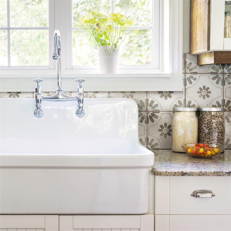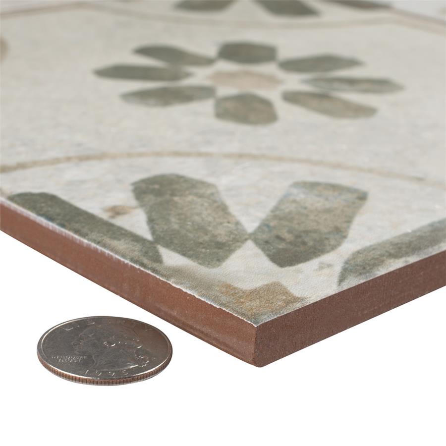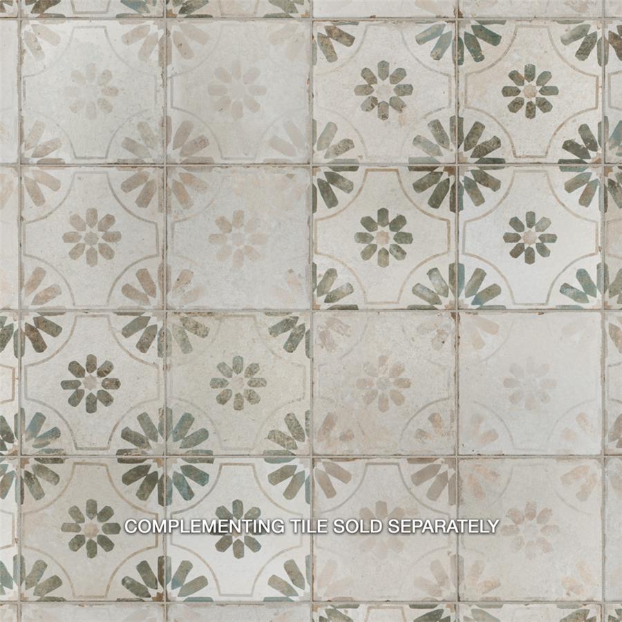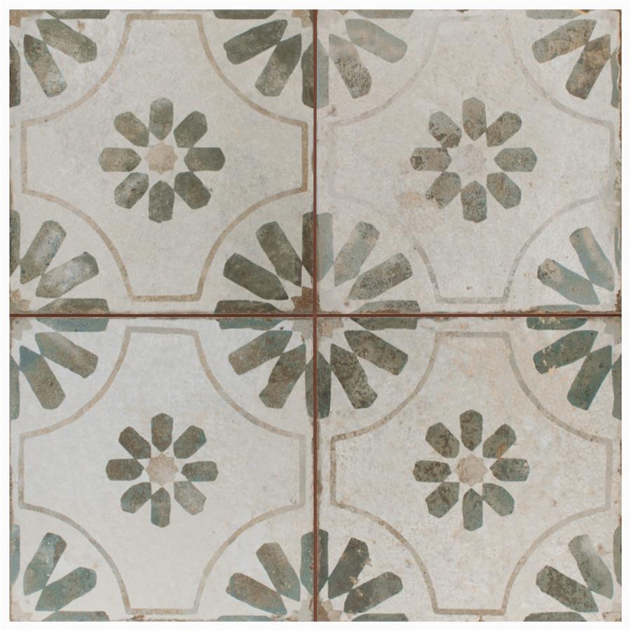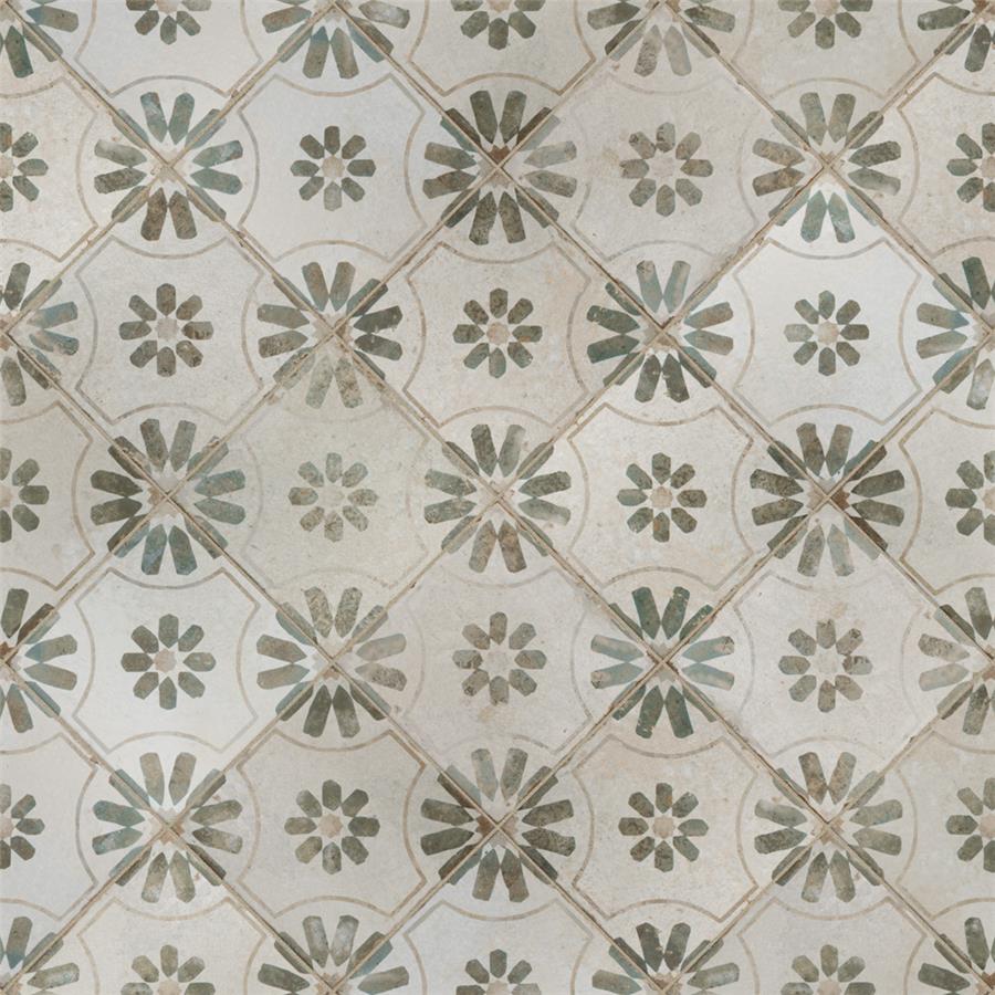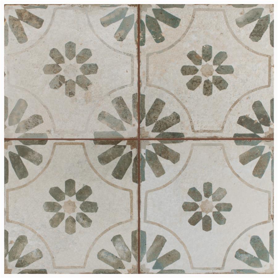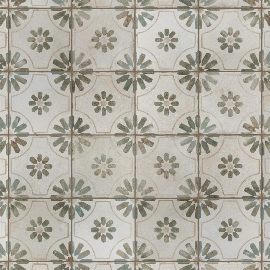 Modern and vintage design elements blend together to create our Kings Blume Sage 17-5/8 in. x 17-5/8 in. Ceramic Floor and Wall Tile. Featuring a worn cement appearance, this tile is a subtle statement piece created by floral motifs in faded shades of sage green set on an antique white base glaze. Designed by interior architect and furniture designer Francisco Segarra, this tile is a true reflection of vintage industrial design. Realistic imitations of scuffs and spots that are the marks of well-loved, worn, century-old tile bring rustic charm to any interior setting. Available in 7 print variations that are randomly scattered throughout each case, the variation throughout each tile mimics an authentic aged appearance. Save time and labor spent arranging smaller square tiles and instead install these durable porcelain slabs, which have four 8-3/4 in. squares separated by scored grout lines.The scored grout lines can be grouted with the color of your choice to further customize your installation.Its durable, ADA-compliant and glazed features make this tile an ideal choice for indoor residential use, including kitchen backsplashes, bathrooms and showers.Tile is the better choice for your space. This tile is made from natural ingredients, making it a healthy choice as it is free from allergens, VOCs, formaldehyde and PVC.