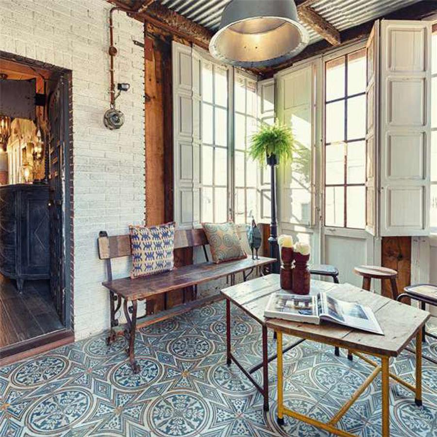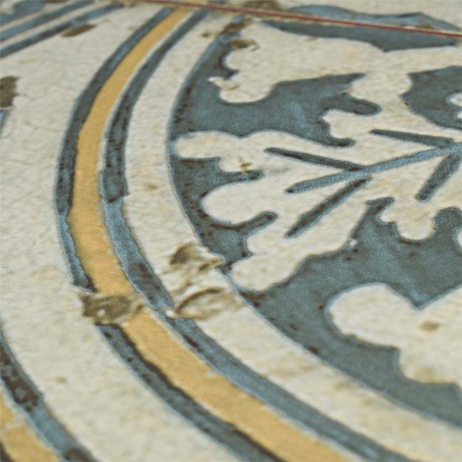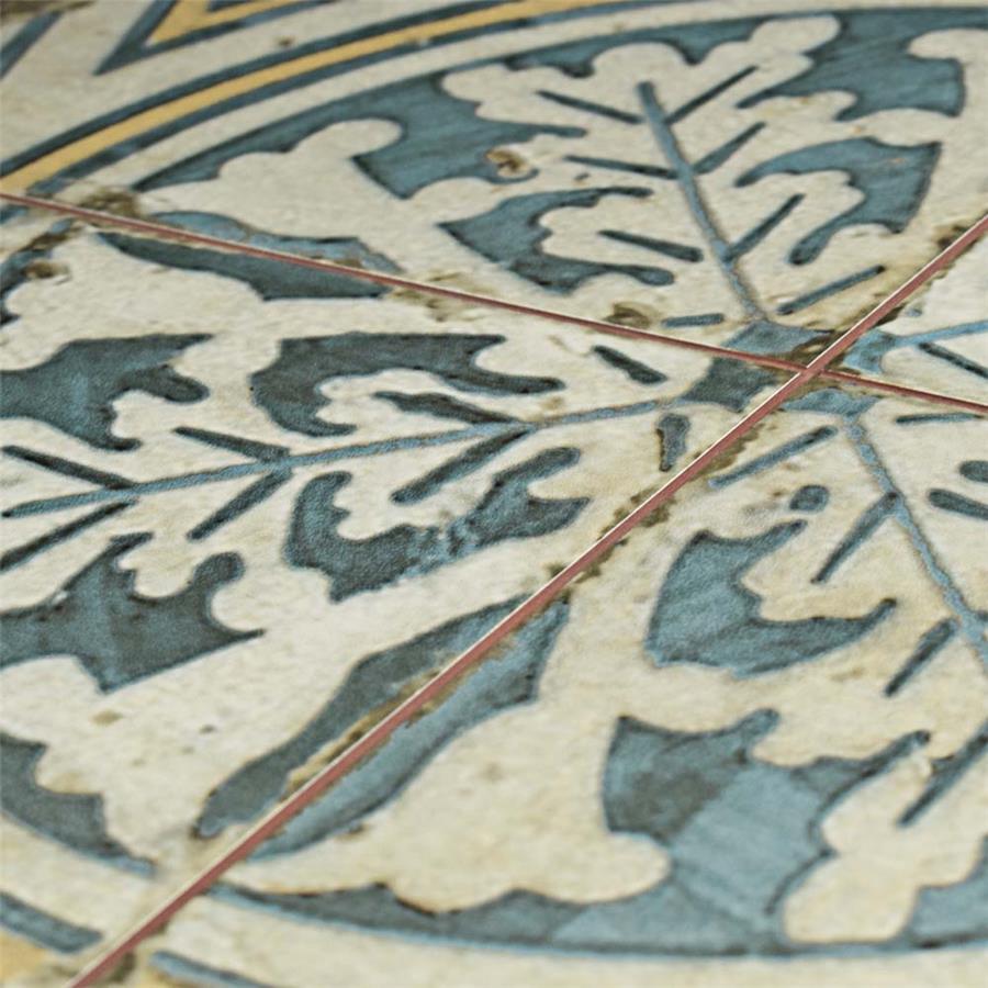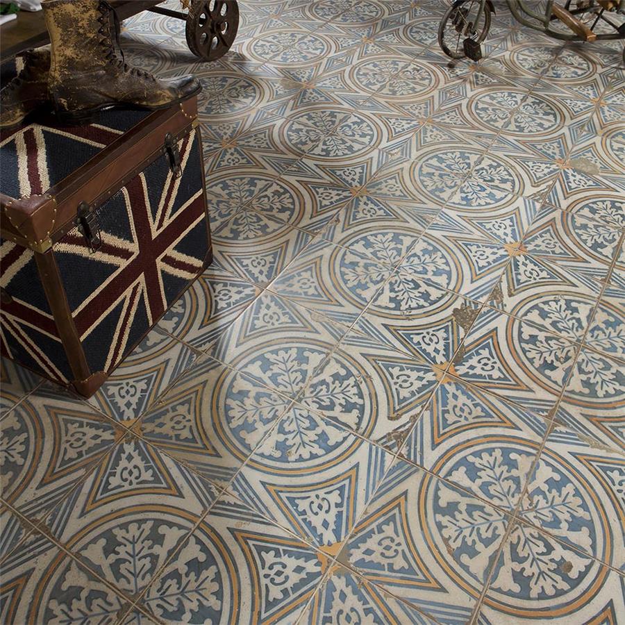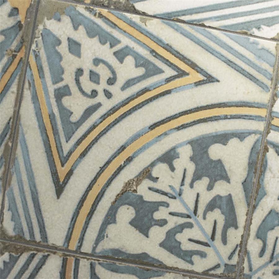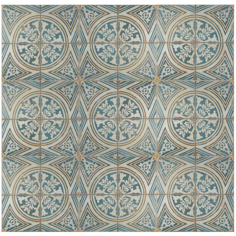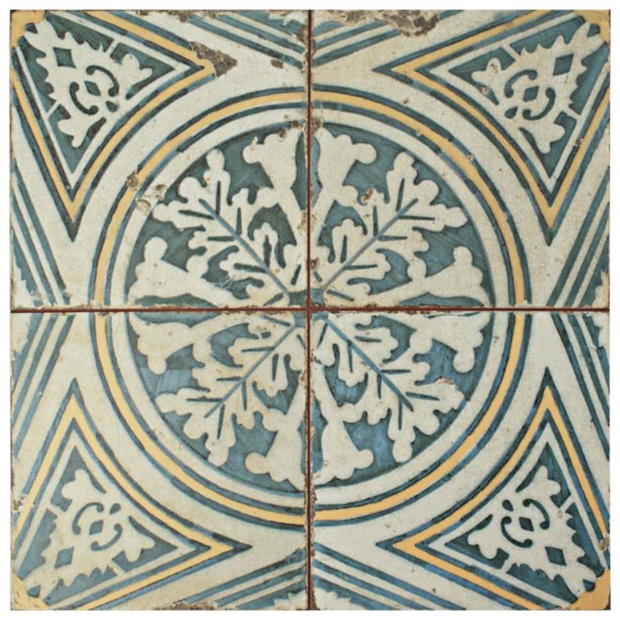 Old-world European elegance radiates from our Kings Flatlands 17-5/8 in. x 17-5/8 in. Ceramic Floor and Wall Tile. Save time and labor spent arranging smaller square tiles and instead install these durable ceramic slabs, which have four 8-3/4 in. squares separated by scored grout lines. The defining feature of this encaustic-inspired tile is the unique, low-sheen glaze. The union of sharp angles and simplistic curves are offset by the pattern in the center, an intriguing hybrid of floral designs and a snowflake, all in faded blue and golden-yellow. Designed by interior architect and furniture designer Francisco Segarra, this tile is a true reflection of vintage industrial design. Imitations of scuffs and spots that are the marks of well-loved, worn, century-old tile bring rustic charm to your interior. There are 10 different variations of this tile randomly scattered throughout each case. The scored grout lines can be grouted with the color of your choice to further customize your installation.