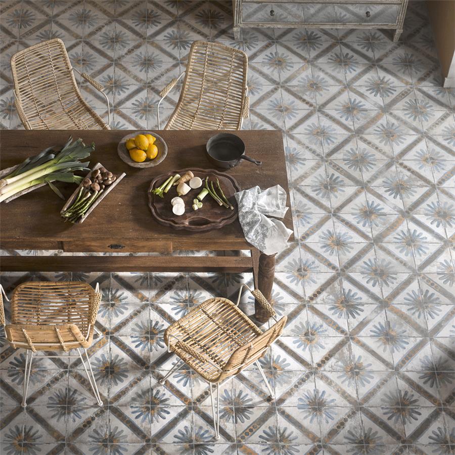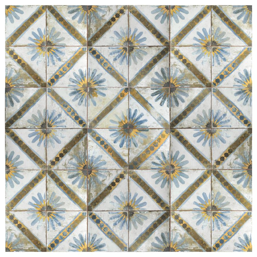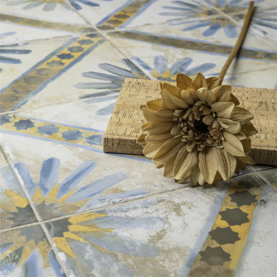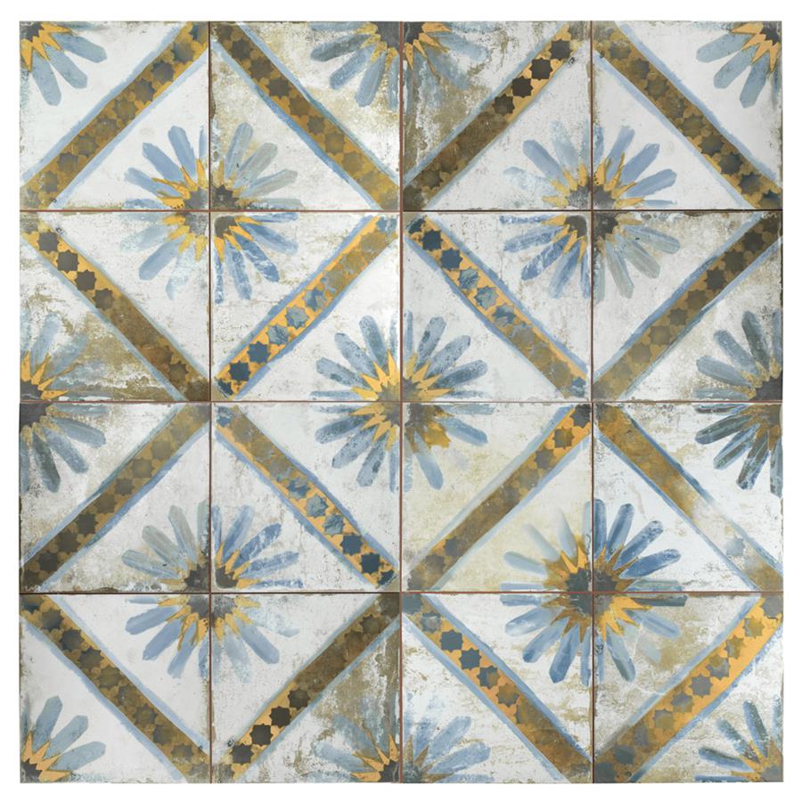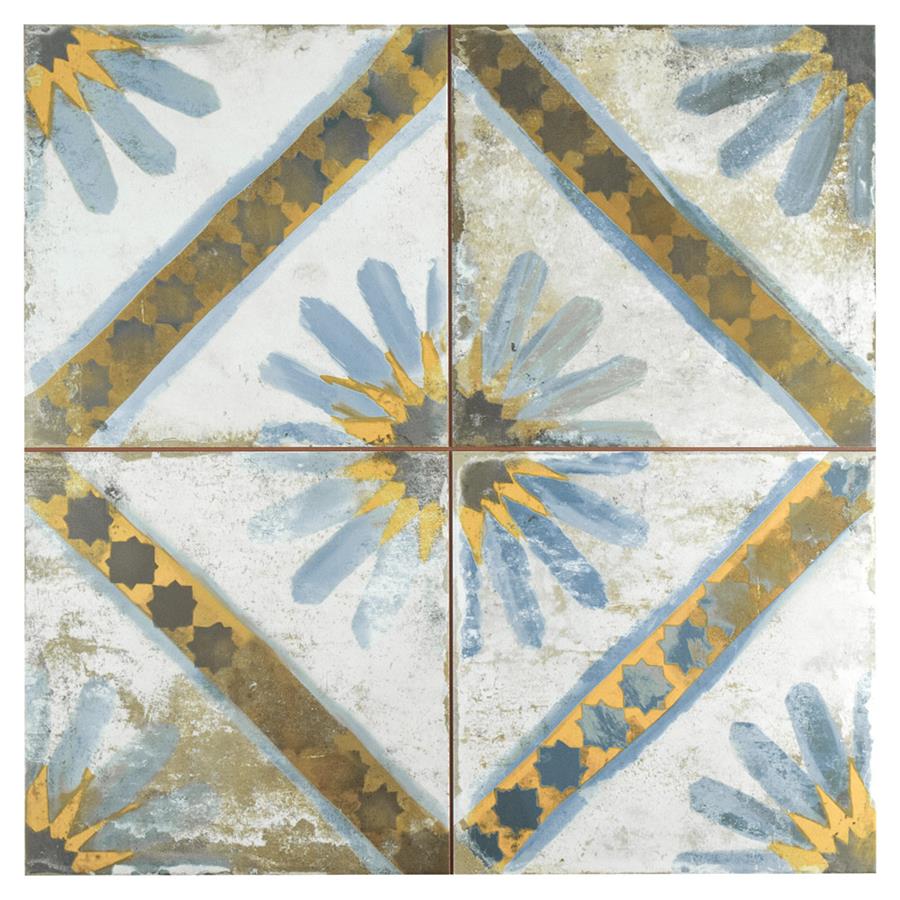 Named after the iconic Moroccan city, our Kings Marrakech Blue 17-5/8 in. x17-5/8 in. Ceramic Floor and Wall Tile radiates old-world charm. Save time and labor spent arranging smaller square tiles and instead install these durable ceramic slabs, which have four 8-3/4 in. squares separated by scored grout lines. The defining feature of this encaustic-inspired tile is the unique, low-sheen glaze in beige tones with a hand-painted looking floral design in muted charcoal, cornflower blue and marigold tones. Available in seven print variations that are randomly scattered throughout each case, the variation throughout each tile mimics an authentic aged appearance. Designed by interior architect and furniture designer Francisco Segarra, this tile is a true reflection of vintage industrial design. Realistic imitations of scuffs and spots that are the marks of well-loved, worn, century-old tile bring rustic charm to your interior. The scored grout lines can be grouted with the color of your choice to further customize your installation.