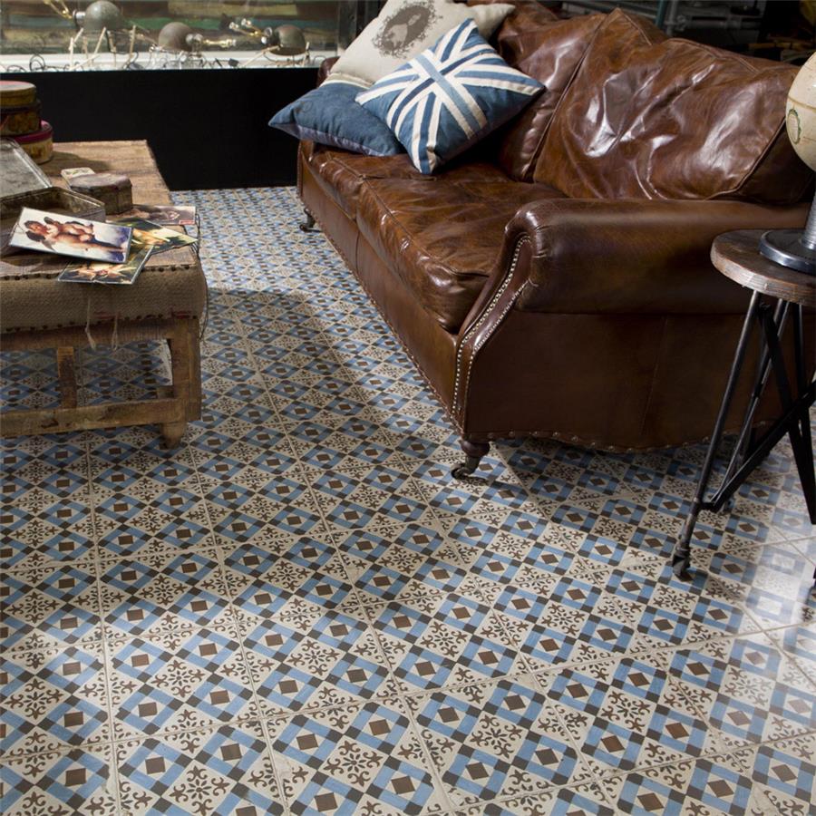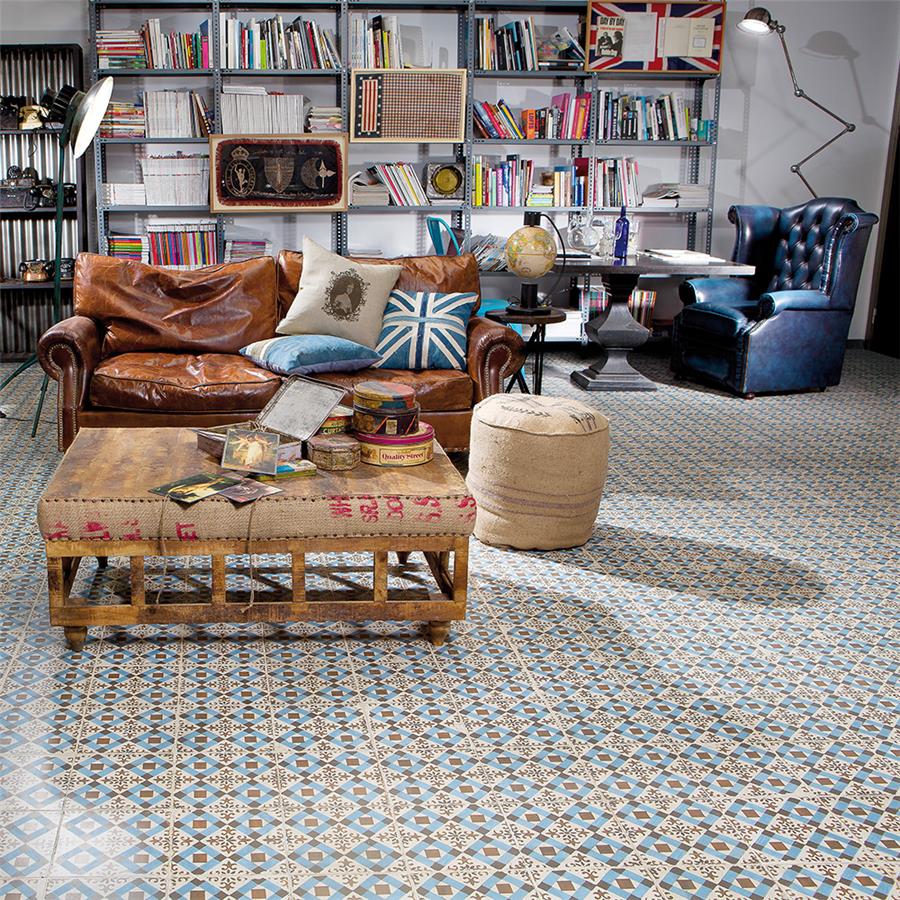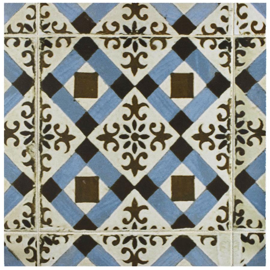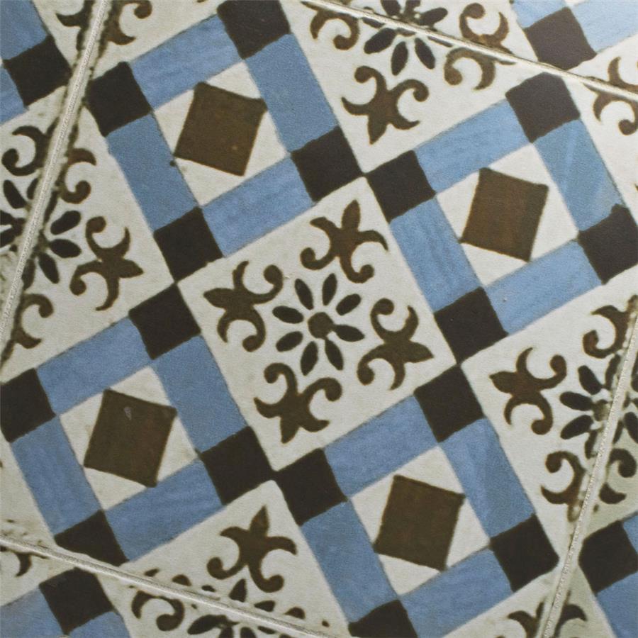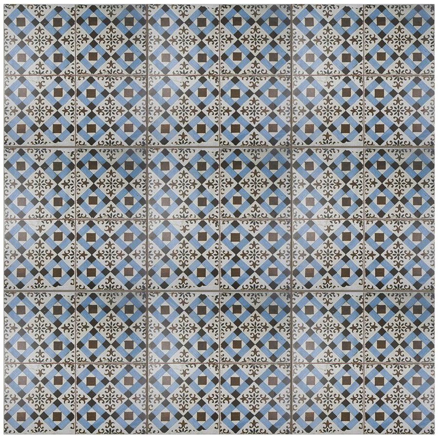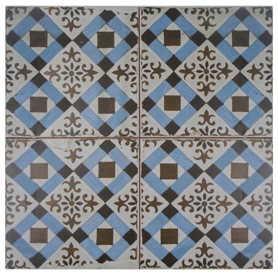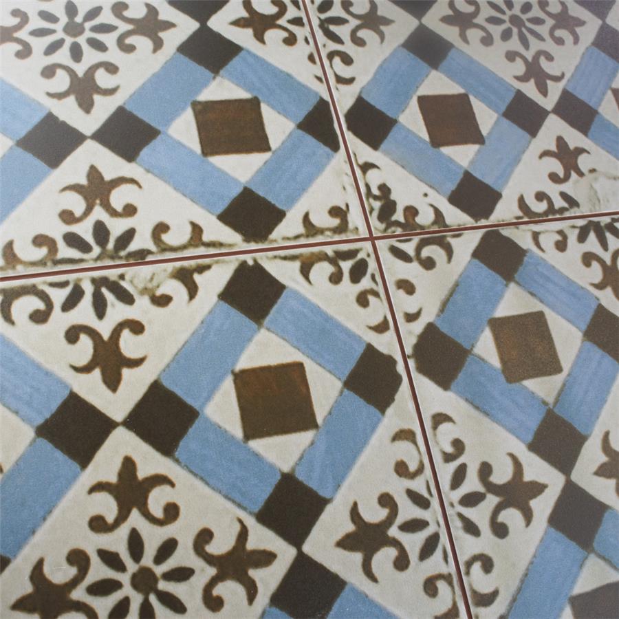 Old-world European elegance radiates from our Kings Millbasin 17-5/8 in. x 17-5/8 in. Ceramic Floor and Wall Tile, imported from Spain. Save time and labor spent arranging smaller square tiles and instead install these durable ceramic slabs, which have four 8-3/4 in. squares separated by scored grout lines. The defining feature on this encaustic-inspired tile is the unique, low-sheen glaze in chocolate brown and sky blue, adorned with floral patterns and squares that have a distinctive hand-painted look. Designed by interior architect and furniture designer Francisco Segarra, this tile is a true reflection of vintage industrial design. Imitations of scuffs and spots that are the marks of well-loved, worn, century-old tile bring rustic charm to your interior. There are 5 different variations available that are randomly scattered throughout each case. The scored grout lines can be grouted with the color of your choice to further customize your installation.