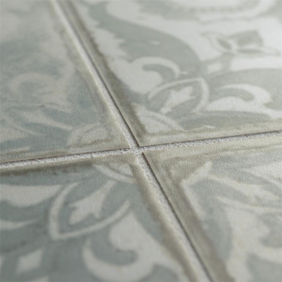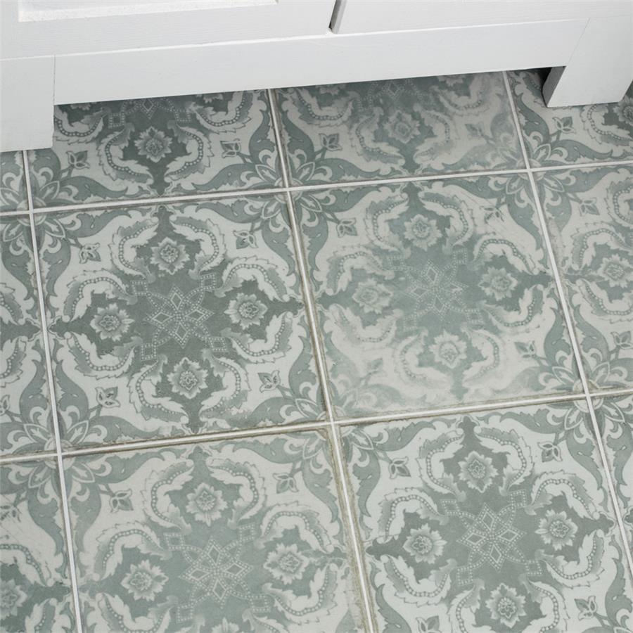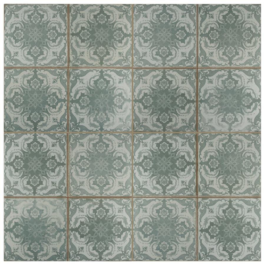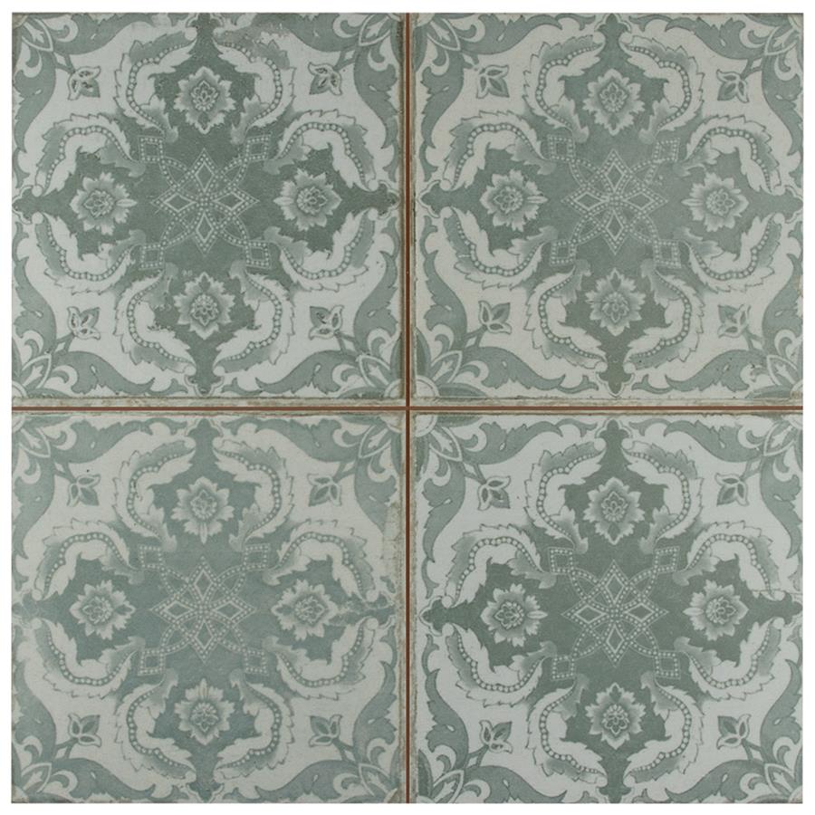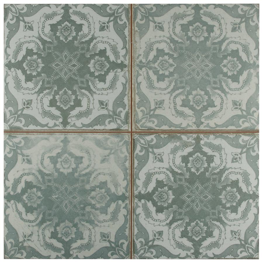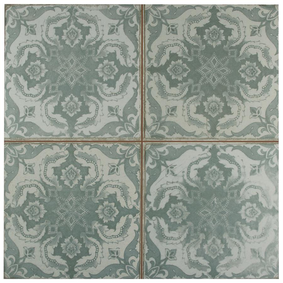 Ancient exotic elegance radiates from our Kings Seagate 17-5/8 in. x 17-5/8 in. Ceramic Floor and Wall Tile, imported from Spain. Save time and labor spent arranging smaller square tiles and instead install these durable ceramic slabs, which have four 8-3/4 in. squares separated by scored grout lines. The defining feature of this encaustic-inspired tile is the unique, low-sheen glaze in a faded teal shade. A hybrid of floral designs and curves comprise this delicate pattern, which has distinctive south Asian flair. Designed by interior architect and furniture designer Francisco Segarra, this tile is a true reflection of vintage industrial design. Imitations of scuffs and spots that are the marks of well-loved, worn, century-old tile bring rustic charm to your interior. There are 8 different variations available that are randomly scattered throughout each case. The scored grout lines can be grouted with the color of your choice to further customize your installation.