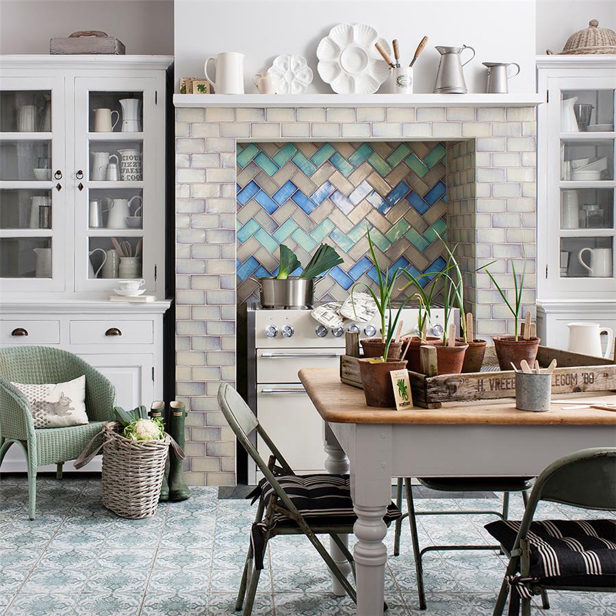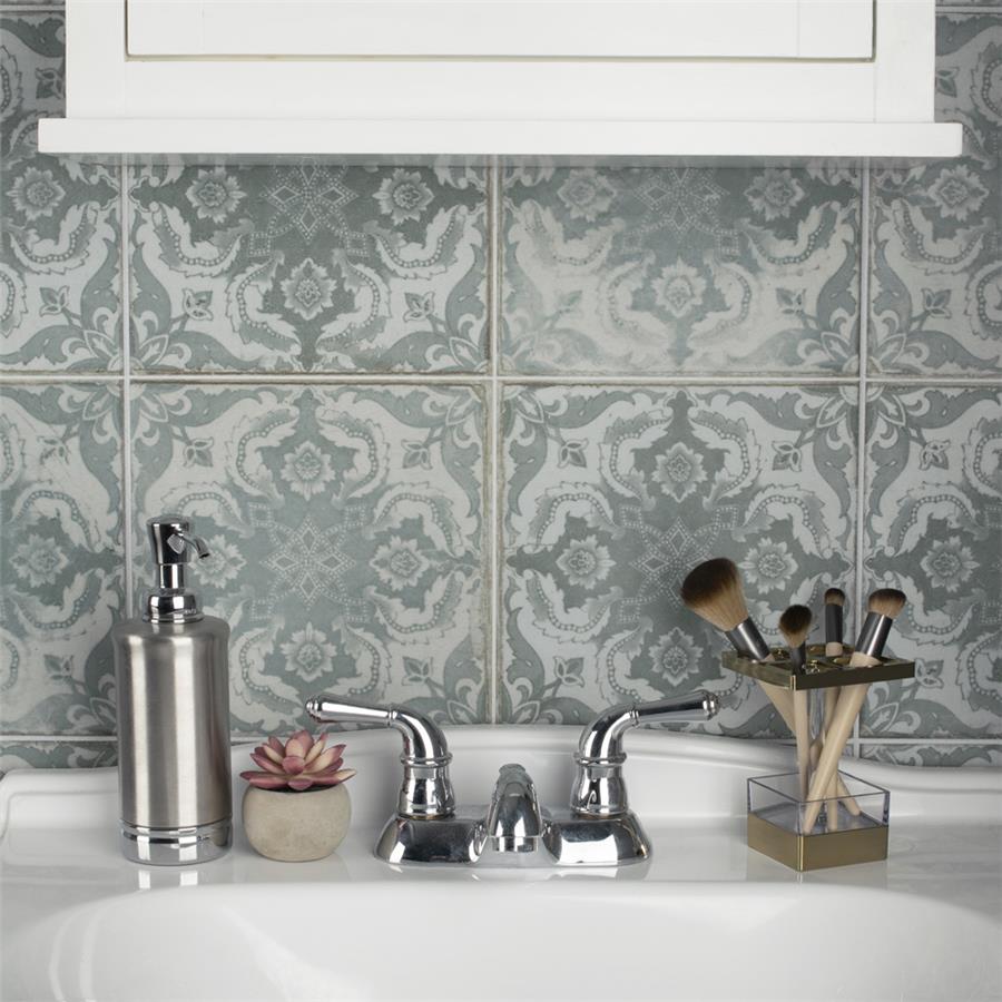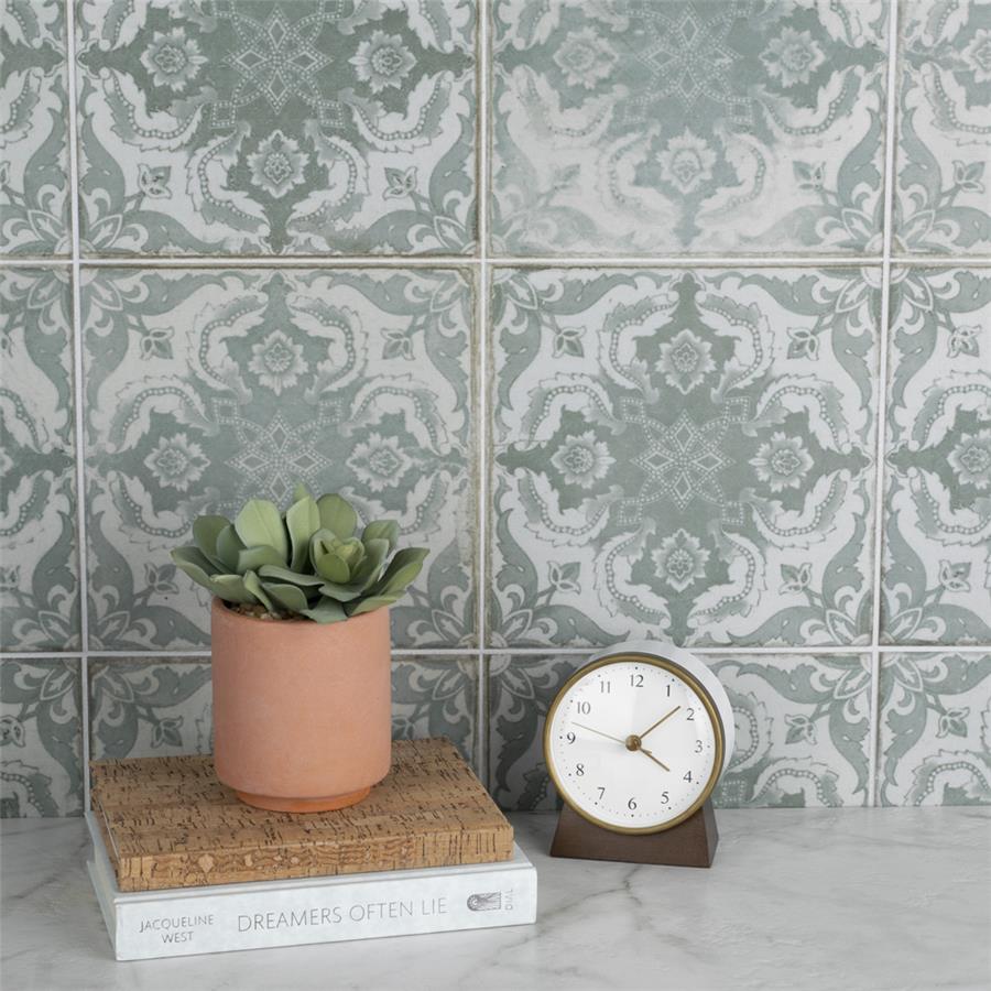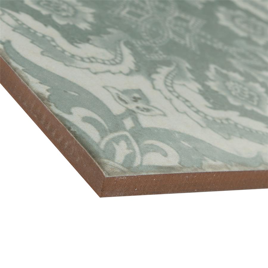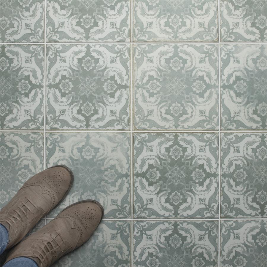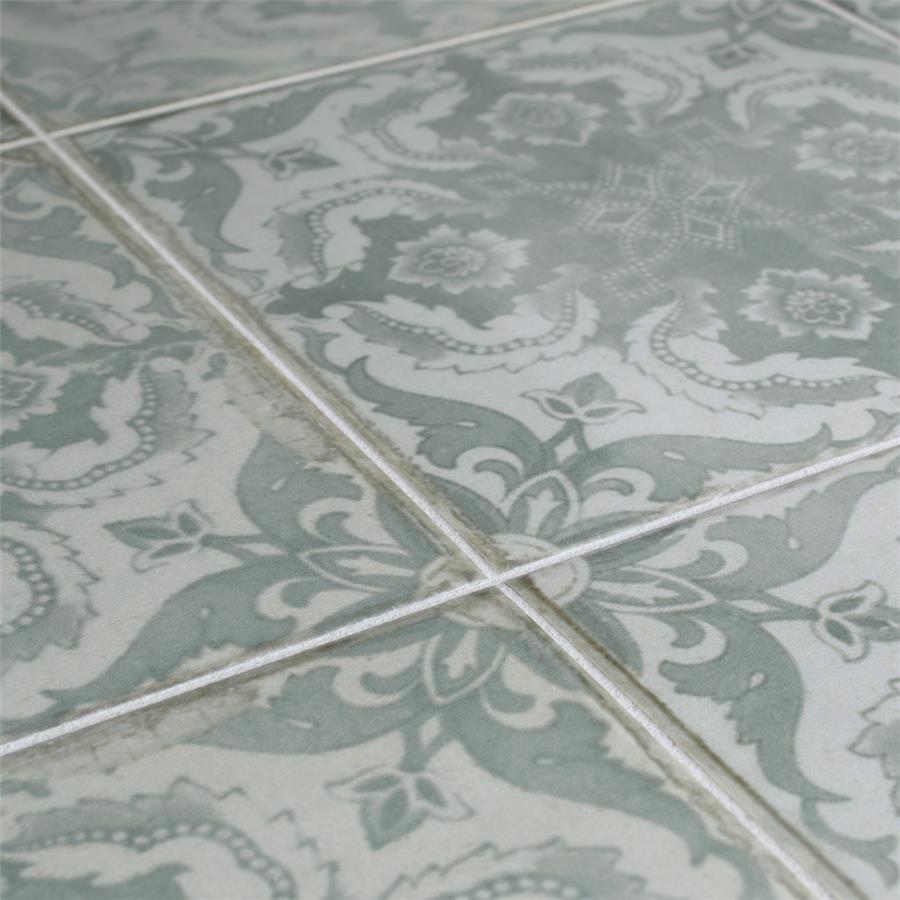 Ancient exotic elegance radiates from our Kings Seagate 17-5/8 in. x 17-5/8 in. Ceramic Floor and Wall Tile, imported from Spain. Save time and labor spent arranging smaller square tiles and instead install these durable ceramic slabs, which have four 8-3/4 in. squares separated by scored grout lines. The defining feature of this encaustic-inspired tile is the unique, low-sheen glaze in a faded teal shade. A hybrid of floral designs and curves comprise this delicate pattern, which has distinctive south Asian flair. Designed by interior architect and furniture designer Francisco Segarra, this tile is a true reflection of vintage industrial design. Imitations of scuffs and spots that are the marks of well-loved, worn, century-old tile bring rustic charm to your interior. There are 8 different variations available that are randomly scattered throughout each case. The scored grout lines can be grouted with the color of your choice to further customize your installation.