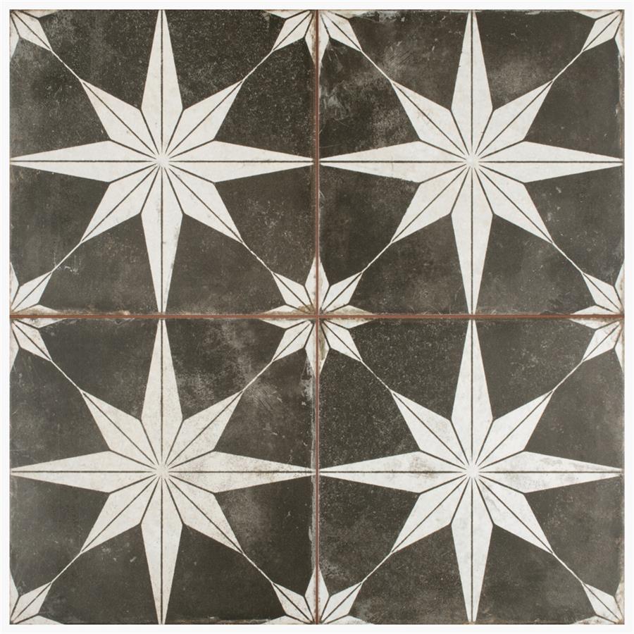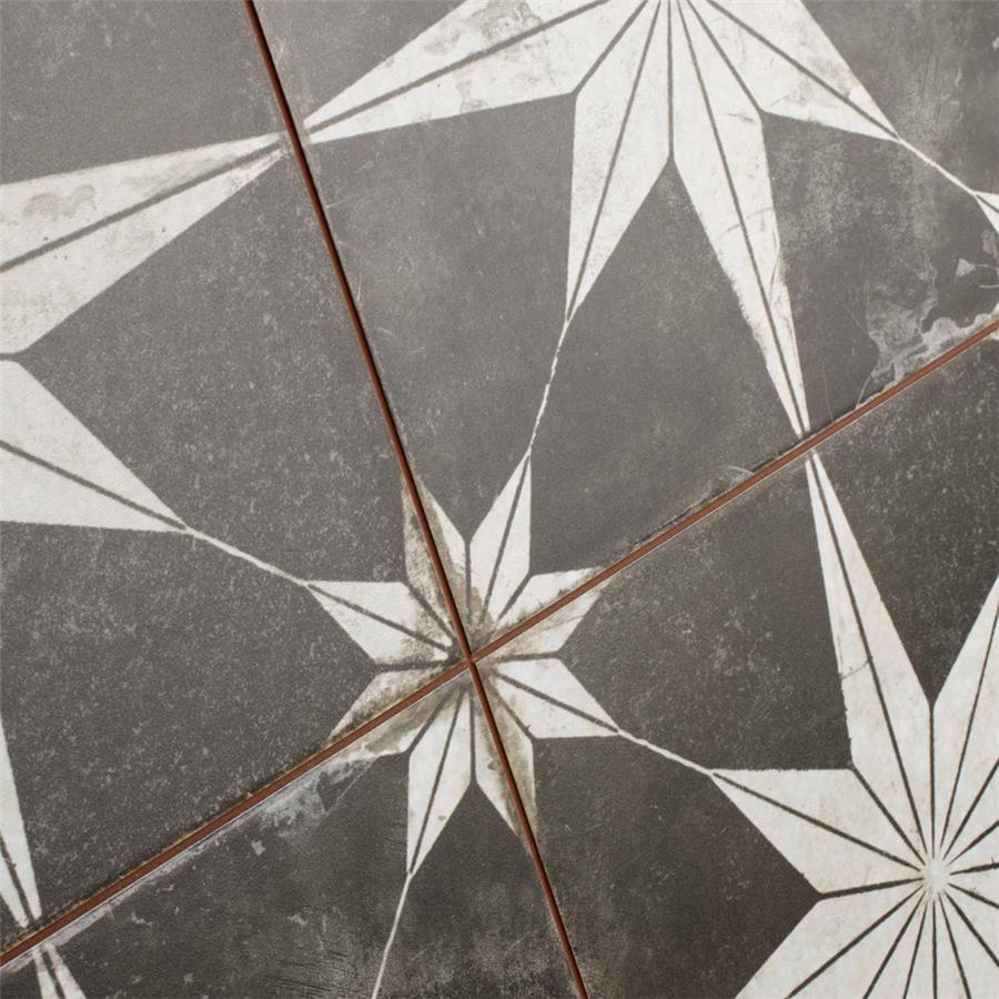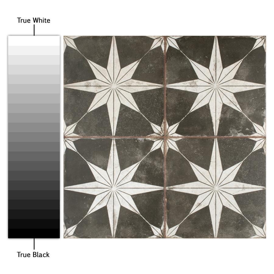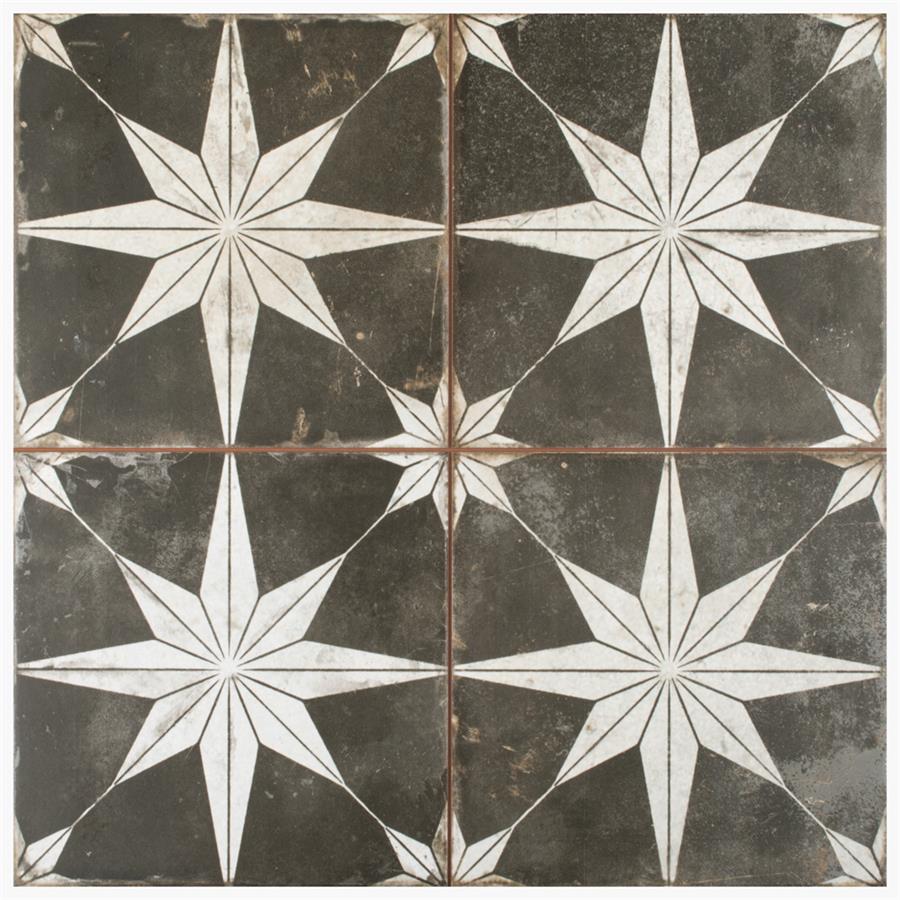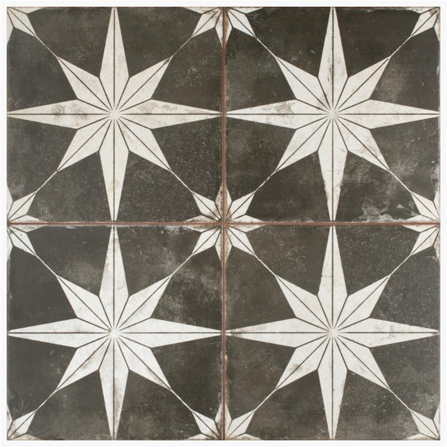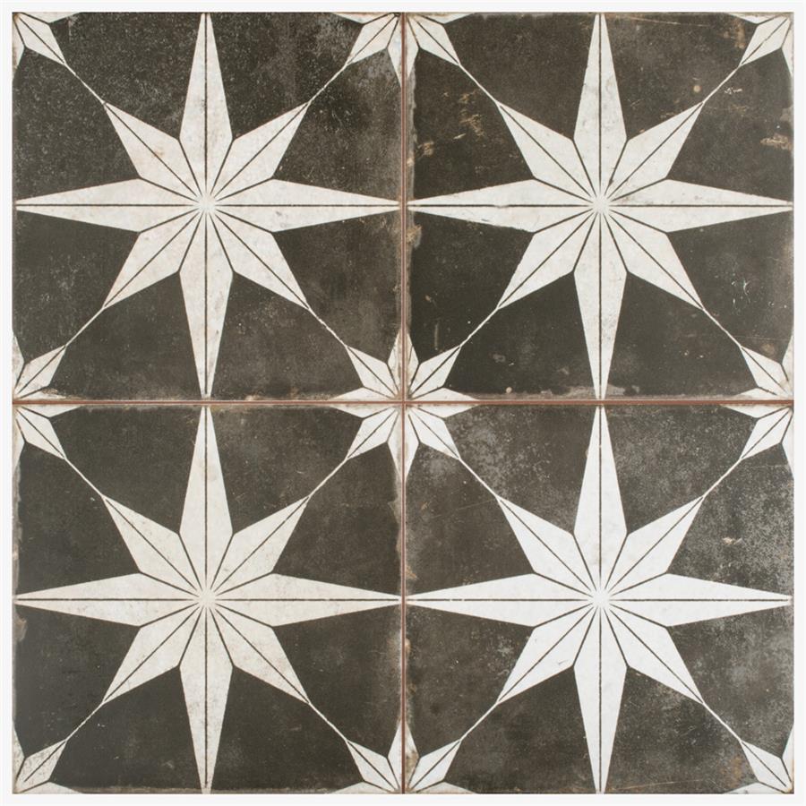 Imported from Spain, our Kings Star Night 17-5/8 in. x 17-5/8 in. Ceramic Floor and Wall Tile radiates old-world European elegance. This encaustic-inspired tile features a unique, low-sheen glaze in faded charcoal black tones with centered antique white star patterns in each square. Designed by interior architect and furniture designer Francisco Segarra, this tile is a true reflection of vintage industrial design. Realistic imitations of scuffs and spots that are the marks of well-loved, worn, century-old tile bring rustic charm to any interior setting. These rustic scuffs and spots convince that this tile is truly aged. Available in 7 print variations that are randomly scattered throughout each case, the variation throughout each tile mimics an authentic aged appearance. Save time and labor spent arranging smaller square tiles and instead install these durable porcelain slabs, which have four 8-3/4 in. squares separated by scored grout lines. The scored grout lines can be grouted with the color of your choice to further customize your installation. It’s durable, ADA-compliant and glazed features make this tile an ideal choice for indoor residential use, including kitchen backsplashes, bathrooms and showers. Tile is the better choice for your space. This tile is made from natural ingredients, making it a healthy choice as it is free from allergens, VOCs, formaldehyde and PVC.Try out our grout test below to determine which grout color suits your design preferences.