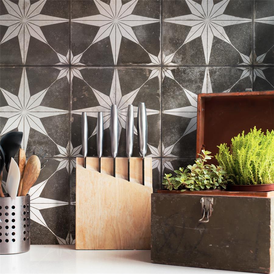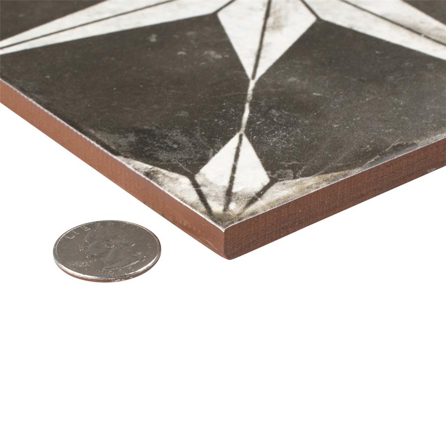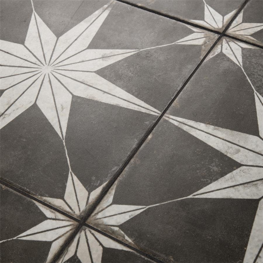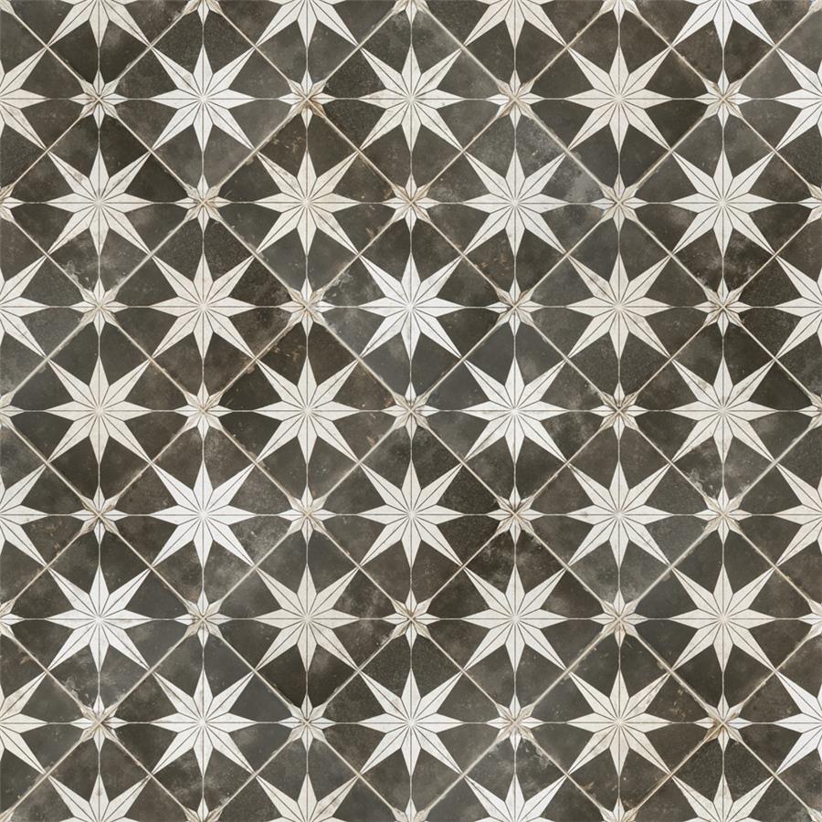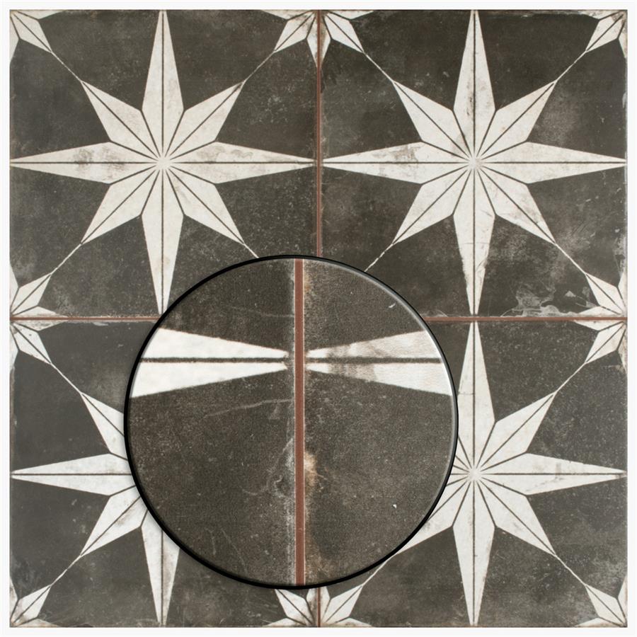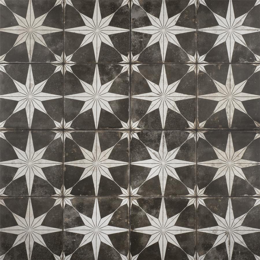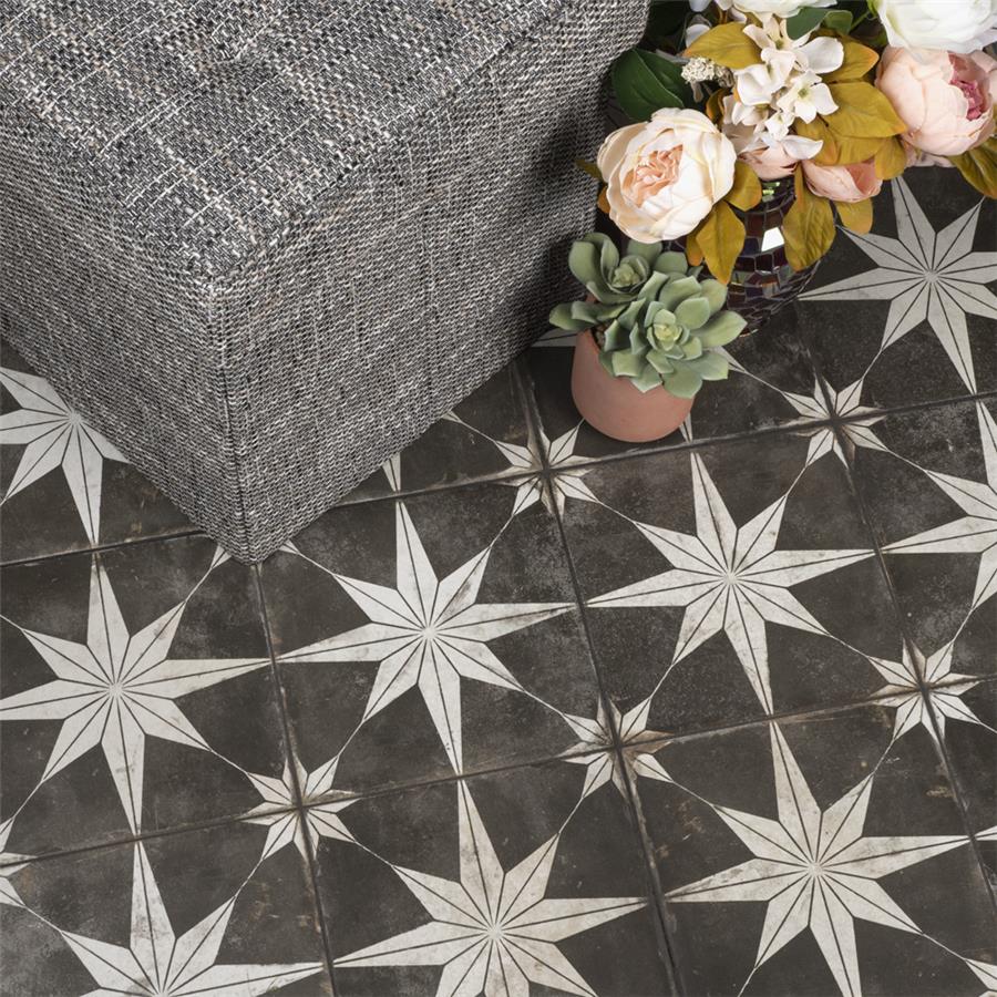 Imported from Spain, our Kings Star Night 17-5/8 in. x 17-5/8 in. Ceramic Floor and Wall Tile radiates old-world European elegance. This encaustic-inspired tile features a unique, low-sheen glaze in faded charcoal black tones with centered antique white star patterns in each square. Designed by interior architect and furniture designer Francisco Segarra, this tile is a true reflection of vintage industrial design. Realistic imitations of scuffs and spots that are the marks of well-loved, worn, century-old tile bring rustic charm to any interior setting. These rustic scuffs and spots convince that this tile is truly aged. Available in 7 print variations that are randomly scattered throughout each case, the variation throughout each tile mimics an authentic aged appearance. Save time and labor spent arranging smaller square tiles and instead install these durable porcelain slabs, which have four 8-3/4 in. squares separated by scored grout lines. The scored grout lines can be grouted with the color of your choice to further customize your installation. It’s durable, ADA-compliant and glazed features make this tile an ideal choice for indoor residential use, including kitchen backsplashes, bathrooms and showers. Tile is the better choice for your space. This tile is made from natural ingredients, making it a healthy choice as it is free from allergens, VOCs, formaldehyde and PVC.Try out our grout test below to determine which grout color suits your design preferences.
