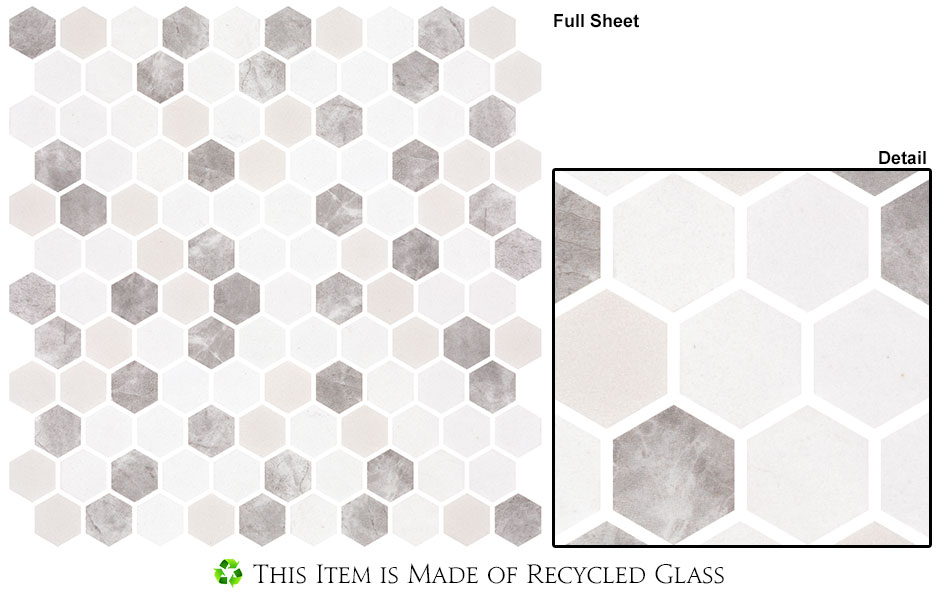 Tile Size: 1″ HexSheet Size: 11 1/2″x 11 13/16″Sheet Coverage: .943 SQFRows Per Sheet: 12Tiles Per Sheet: 120Sheets Per Box: 6Cut into Borders: Every 2 rowsTile Thickness: 5/32″ (4mm)Grout Joint: 1/16″ (2mm)Mesh Mounted: YesSold in box quantities onlyThis Item is Made of Recycled GlassDue to the variance in installation methods, grout colors, lighting, image variances and computer monitor settings; the images above may not accurately represent the true color of the products after installation.Therefore Glazzio Tiles always recommends that tiles not be purchased from an image of any kind.