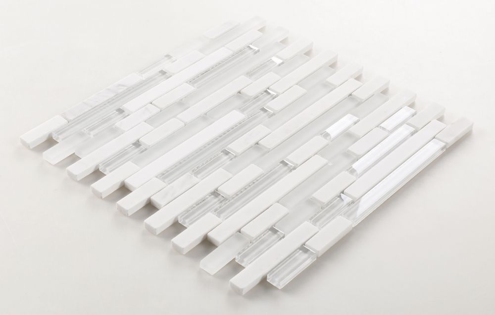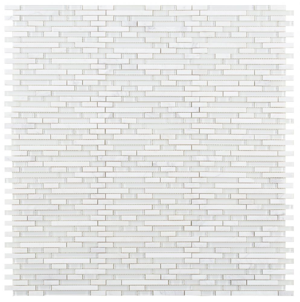 Product Sold By The SheetLinear Series: Linear Victory New 11.75 x 12. Volakas marble mixed with white glass in offset layout pattern.Suggested Grout Color: Bostik Dimension Diamond H600WARNING: This product can expose you to chemicals including crystalline silica (airborne particles of respirable size) in dust created during fabrication/installation if the product is dry cut/ground or pulverized, which are known to the State of California to cause cancer. For more information, go to https://www.p65warnings.ca.gov/.