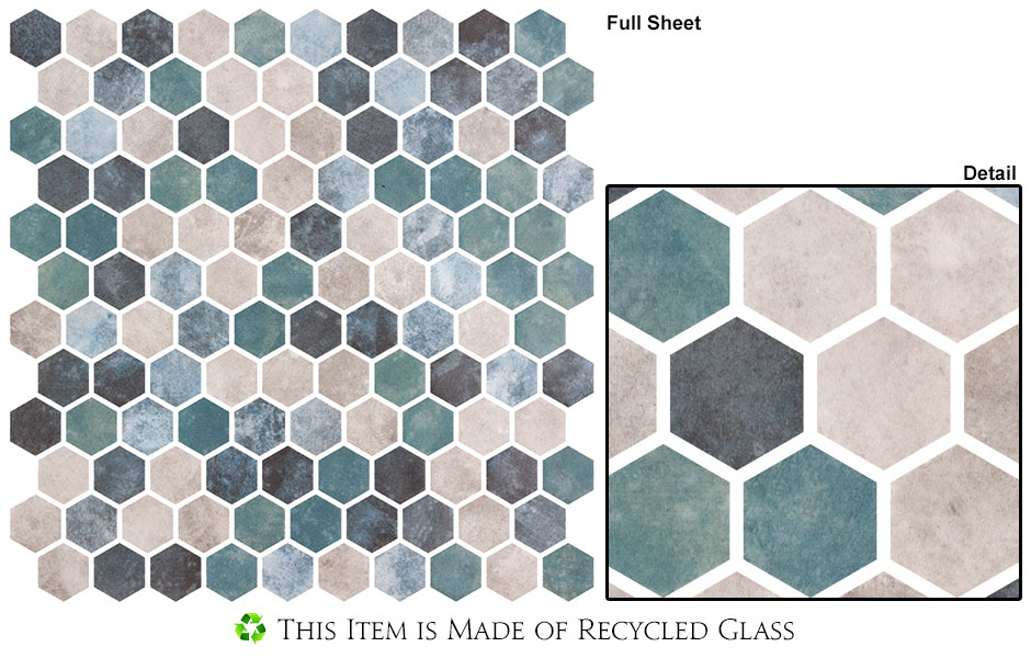 Tile Size: 1″ HexSheet Size: 11 1/2″x 11 13/16″Sheet Coverage: .943 SQFRows Per Sheet: 12Tiles Per Sheet: 120Sheets Per Box: 6Cut into Borders: Every 2 rowsTile Thickness: 5/32″ (4mm)Grout Joint: 1/16″ (2mm)Mesh Mounted: YesSold in box quantities onlyThis Item is Made of Recycled GlassDue to the variance in installation methods, grout colors, lighting, image variances and computer monitor settings; the images above may not accurately represent the true color of the products after installation.Therefore Glazzio Tiles always recommends that tiles not be purchased from an image of any kind.