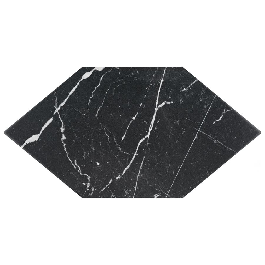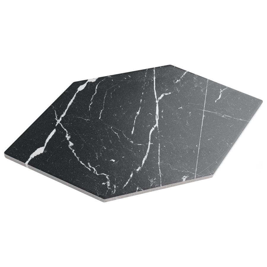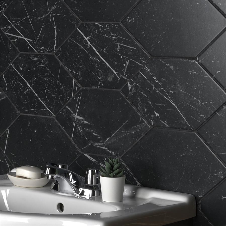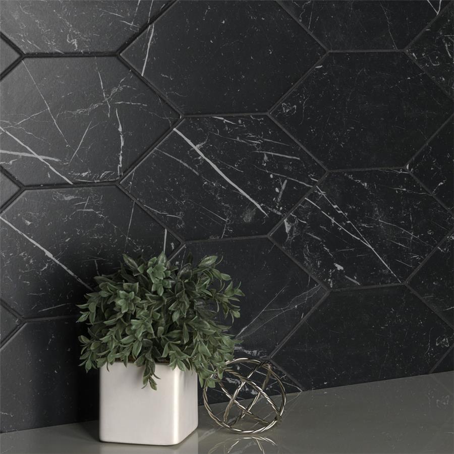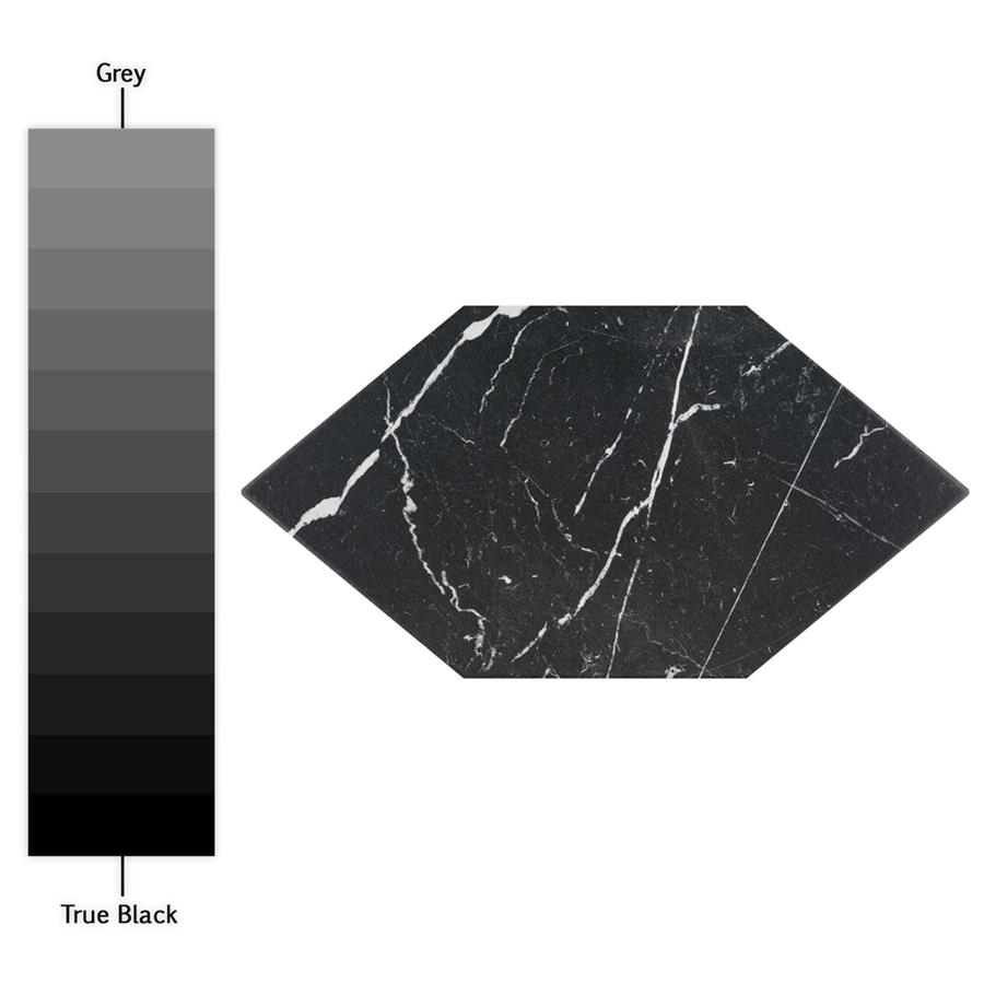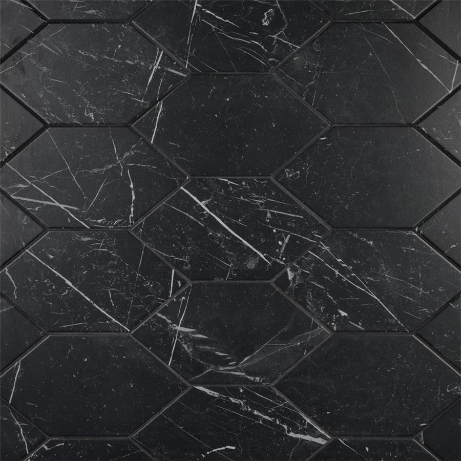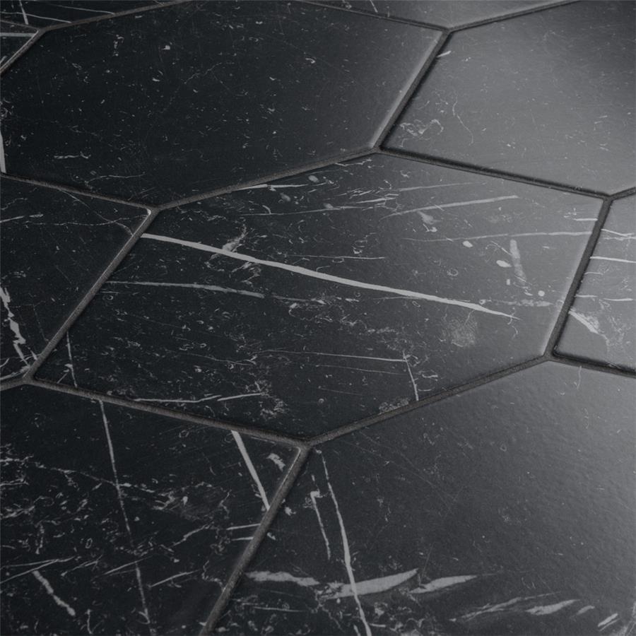 Emulating the timeless beauty of marble in a reimagined geometric format, Marquina Kayak Black 7″ x 13″ Porcelain Floor and Wall Tile provides playful visual appeal in any space. This marble-look tile offers a fresh approach to the classic hexagon silhouette with its unique elongated shape. Set on a smooth, matte black base glaze, this tile is complemented with white veining striations that sporadically flow throughout the design for added authenticity. This trendsetting display of sophisticated geometric design is visually appealing and versatile, and blends beautifully with a range of styles from traditional to modern day. Available in 23 different print variations that are randomly distributed throughout each case, this tile offers a one-of-a-kind look. Its impervious and frost-resistant features make it an ideal choice for indoor and outdoor installations including kitchens, bathrooms, backsplashes, showers, entryways and patios. Tile is the better choice for your space. This tile is made from natural ingredients, making it a healthy choice as it is free from allergens, VOCs, formaldehyde and PVC.Try out our grout test below to determine which grout color suits your design preferences.