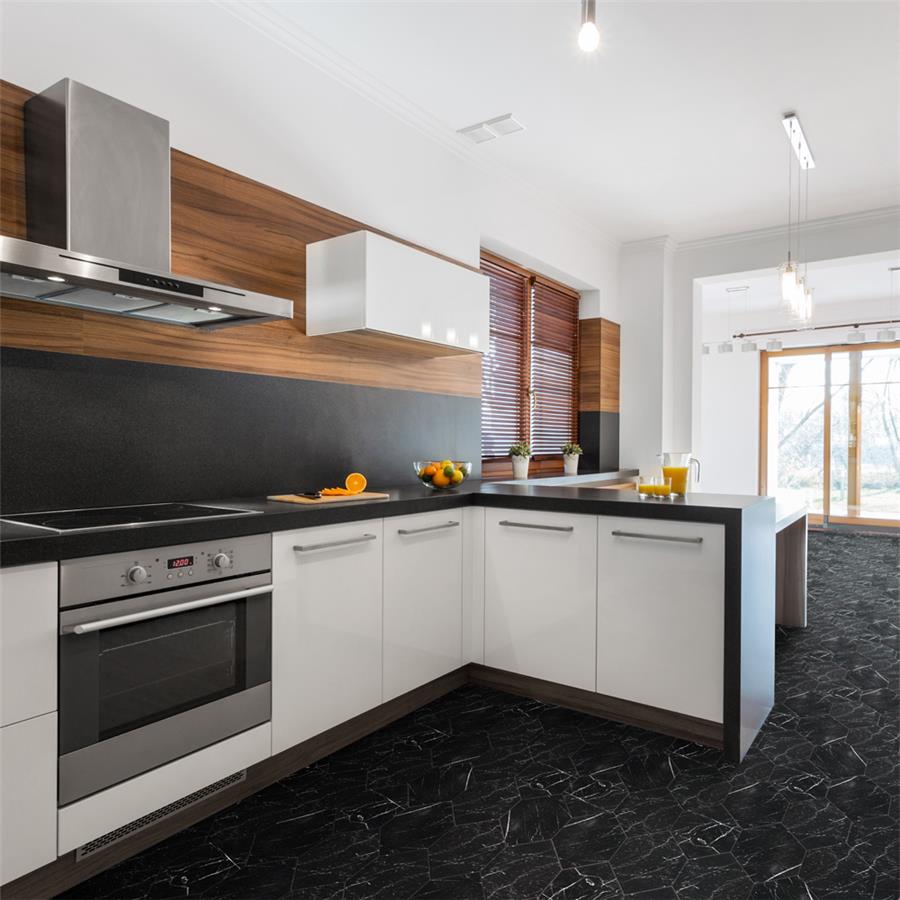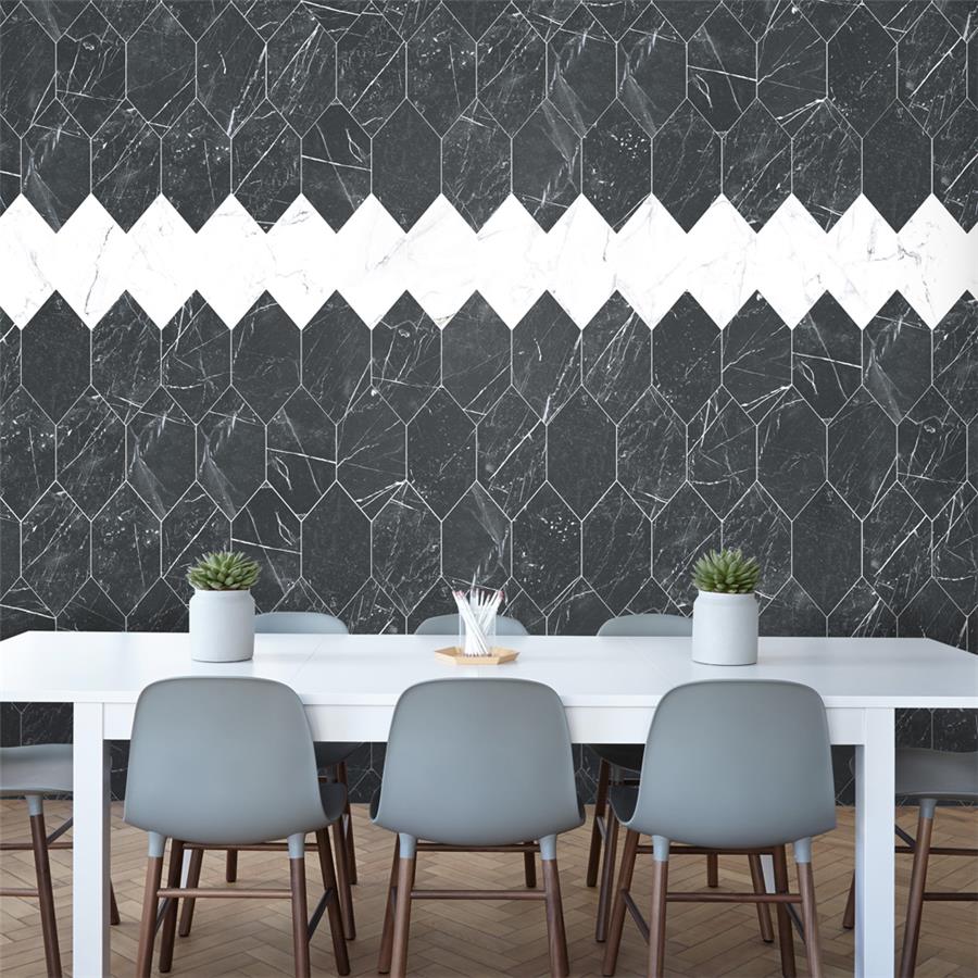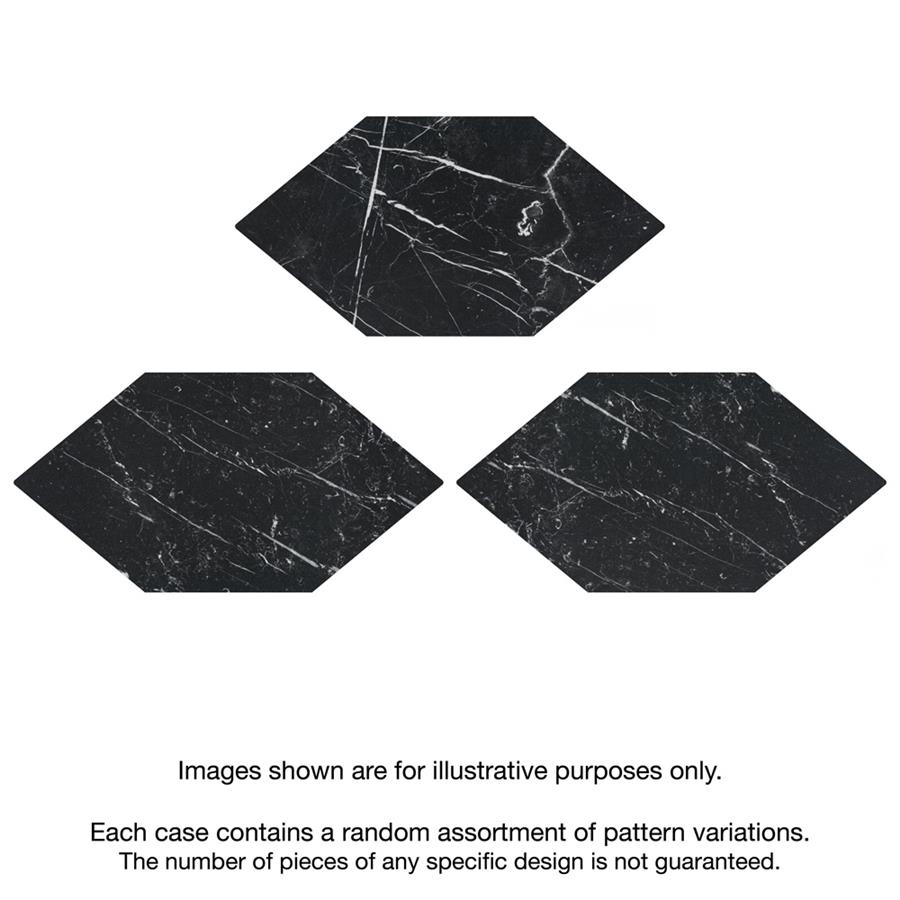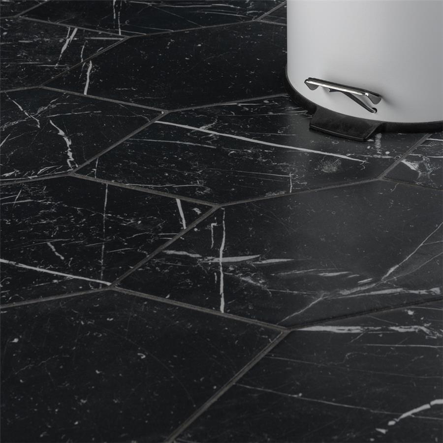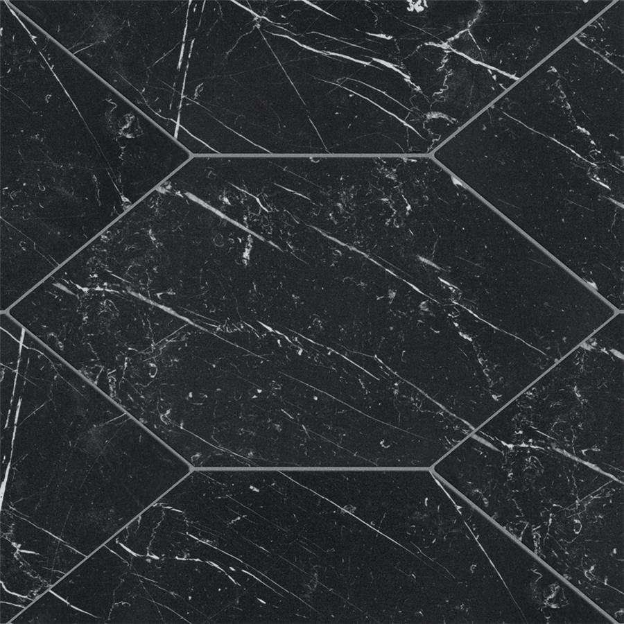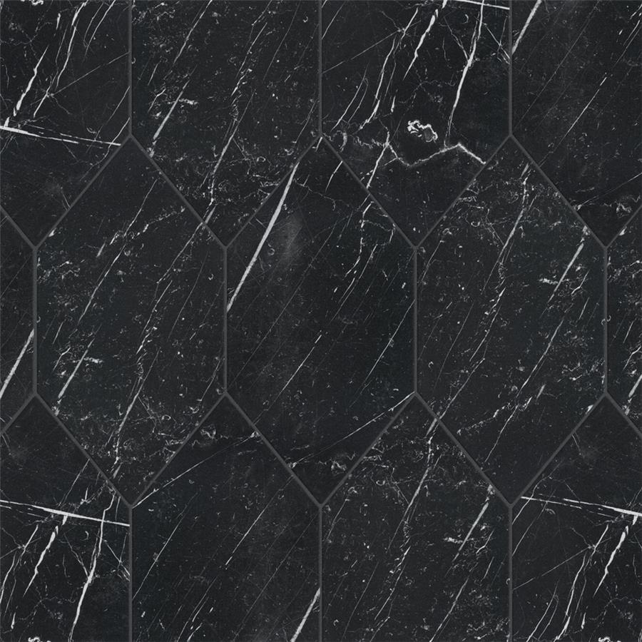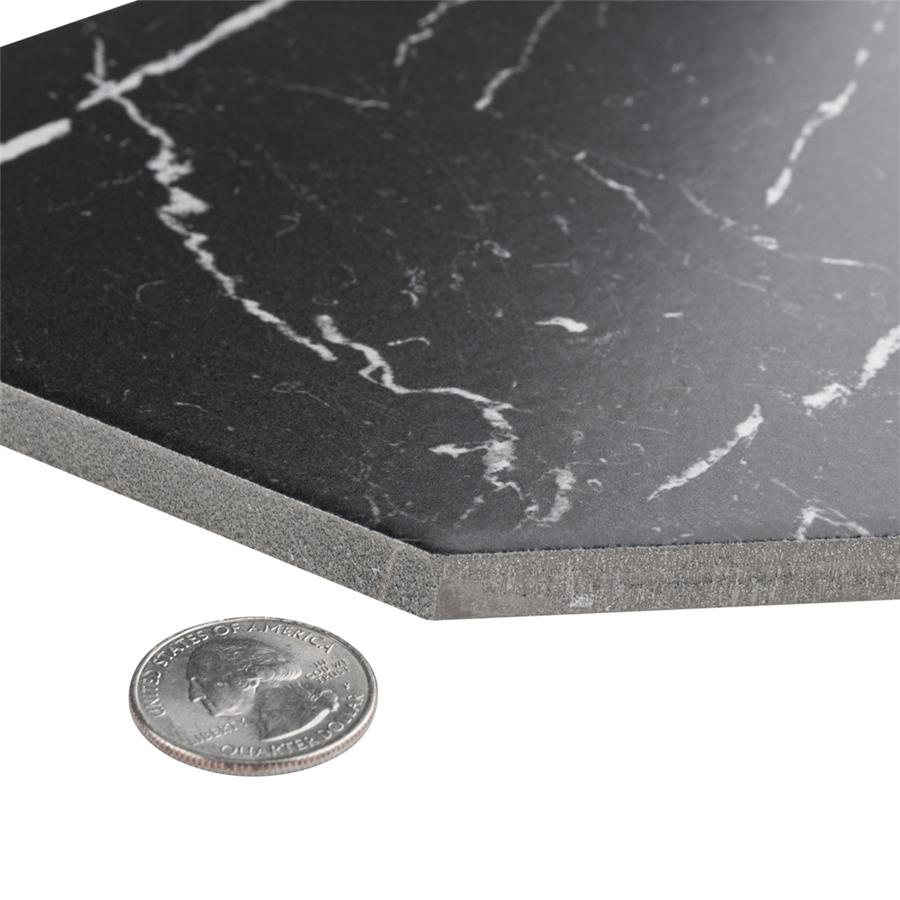 Emulating the timeless beauty of marble in a reimagined geometric format, Marquina Kayak Black 7″ x 13″ Porcelain Floor and Wall Tile provides playful visual appeal in any space. This marble-look tile offers a fresh approach to the classic hexagon silhouette with its unique elongated shape. Set on a smooth, matte black base glaze, this tile is complemented with white veining striations that sporadically flow throughout the design for added authenticity. This trendsetting display of sophisticated geometric design is visually appealing and versatile, and blends beautifully with a range of styles from traditional to modern day. Available in 23 different print variations that are randomly distributed throughout each case, this tile offers a one-of-a-kind look. Its impervious and frost-resistant features make it an ideal choice for indoor and outdoor installations including kitchens, bathrooms, backsplashes, showers, entryways and patios. Tile is the better choice for your space. This tile is made from natural ingredients, making it a healthy choice as it is free from allergens, VOCs, formaldehyde and PVC.Try out our grout test below to determine which grout color suits your design preferences.