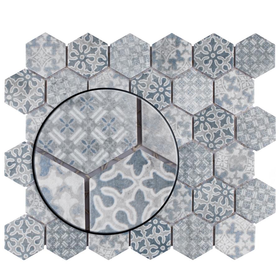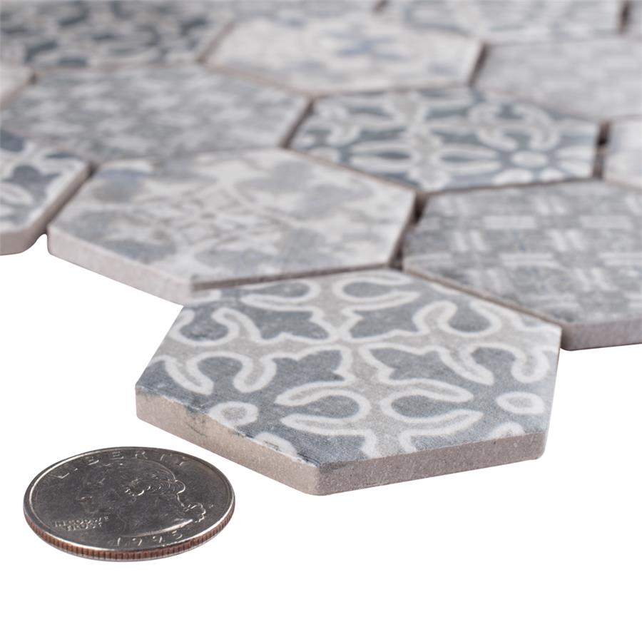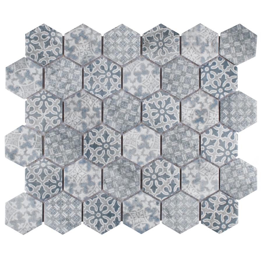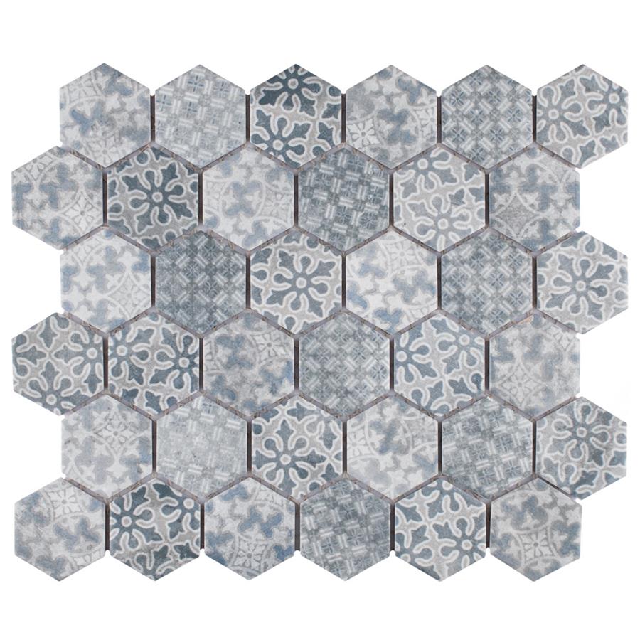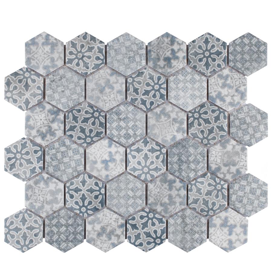 Our Medley Hex Slate Blue 11 in. x 12-5/8 in. Porcelain Floor and Wall Tile ties together the intricate look of individual tiles with the easy installation of a mosaic. This geometric patchwork mosaic features four varying old-world designs in slate grey and blue tones with a slightly textured surface. This multi-patterned tile puts a contemporary twist on the traditional simplistic nature of hexagon tile. Matte hexagons are arranged on an interlocking mesh to create a seamless installation. This tile replicates the natural appeal of stone with imitation scuffs and spots that suit a variety of looks, including vintage, natural and modern. Its impervious, frost resistant and durable features make this an ideal choice for both indoor and outdoor commercial and residential installations including, kitchens, bathrooms, entryways and patios.Tile is the better choice for your space. This tile is made from natural ingredients, making it a healthy choice as it is free from allergens, VOCs, formaldehyde and PVC.