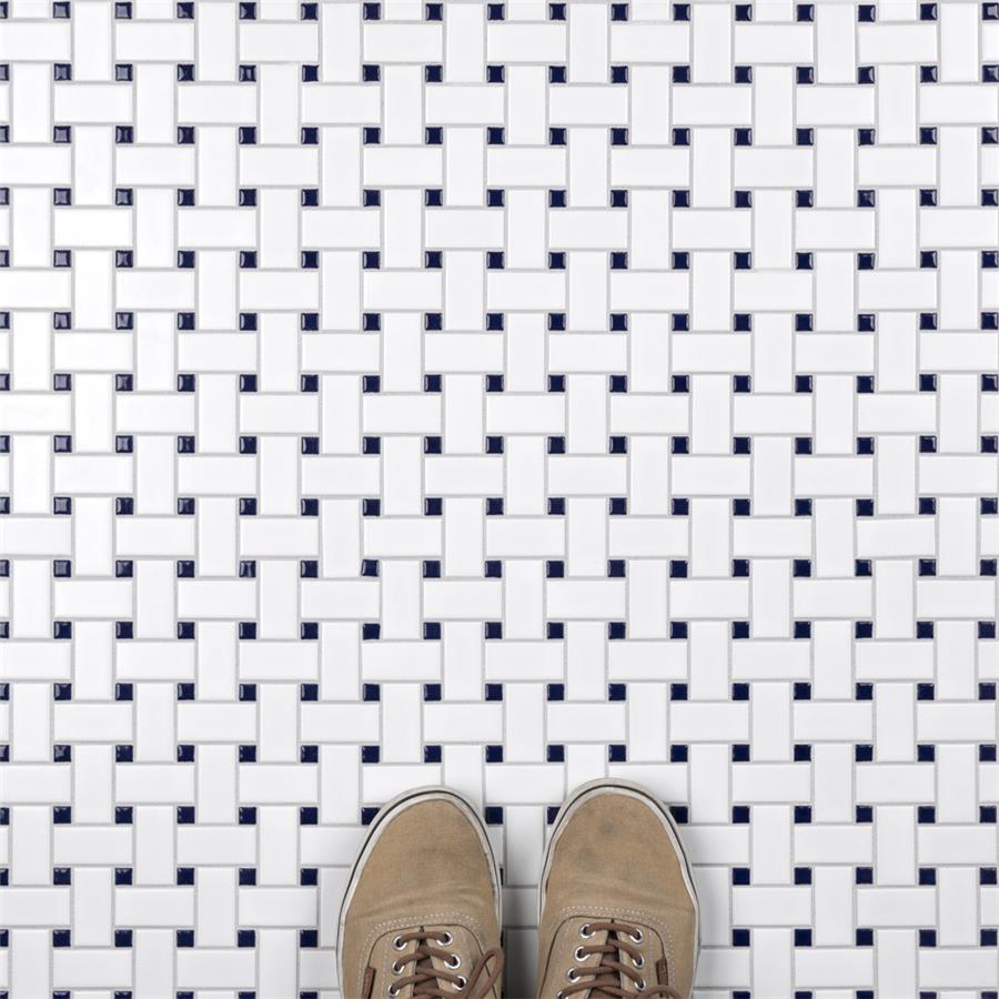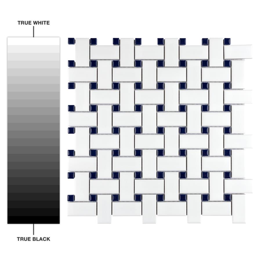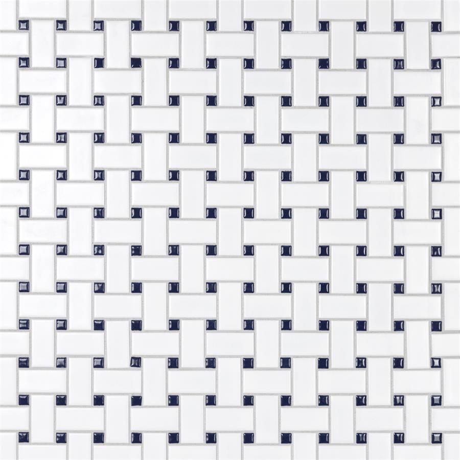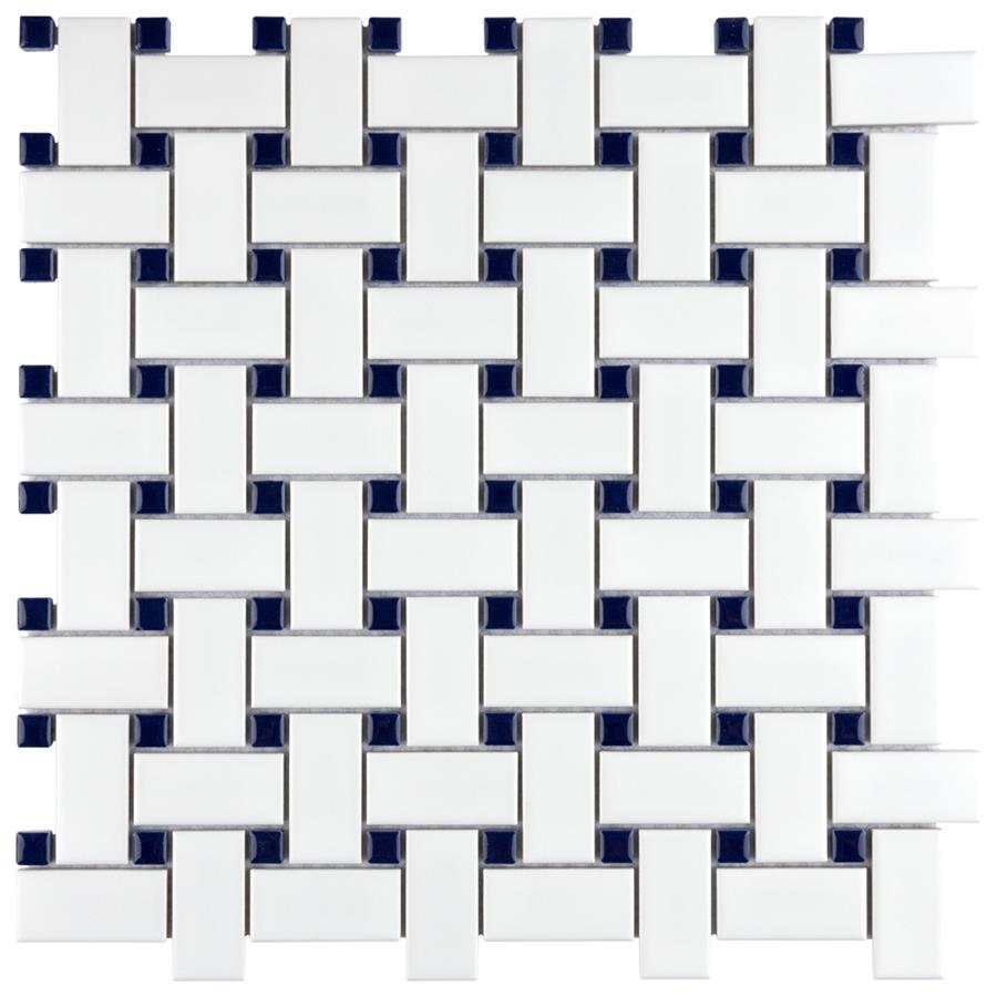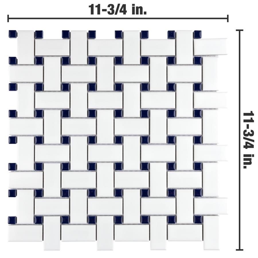 Transform your space into a tribute to retro design with our Metro Basketweave Matte White with Glossy Cobalt Blue Dot 11-3/4 in. x 11-3/4 in. Porcelain Mosaic Floor and Wall Tile. As a modern deviation from the classic mosaic, this tile option is a throwback to traditional retro design with a contemporary feel. Matte white chips are accentuated by small glossy cobalt blue dots that provide a woven illusion. These mosaic chips are precisely arranged on an interlocking mesh to create a seamless installation. This minimalistic geometric porcelain mosaic is unique yet simplistic enough to integrate into any design, ranging from traditional style renovations to modern home projects. Its impervious and glazed features make this an ideal tile for indoor residential use, including backsplashes, bathrooms, showers and kitchens. Tile is the better choice for your space. This tile is made from natural ingredients, making it a healthy choice as it is free from allergens, VOCs, formaldehyde and PVC.