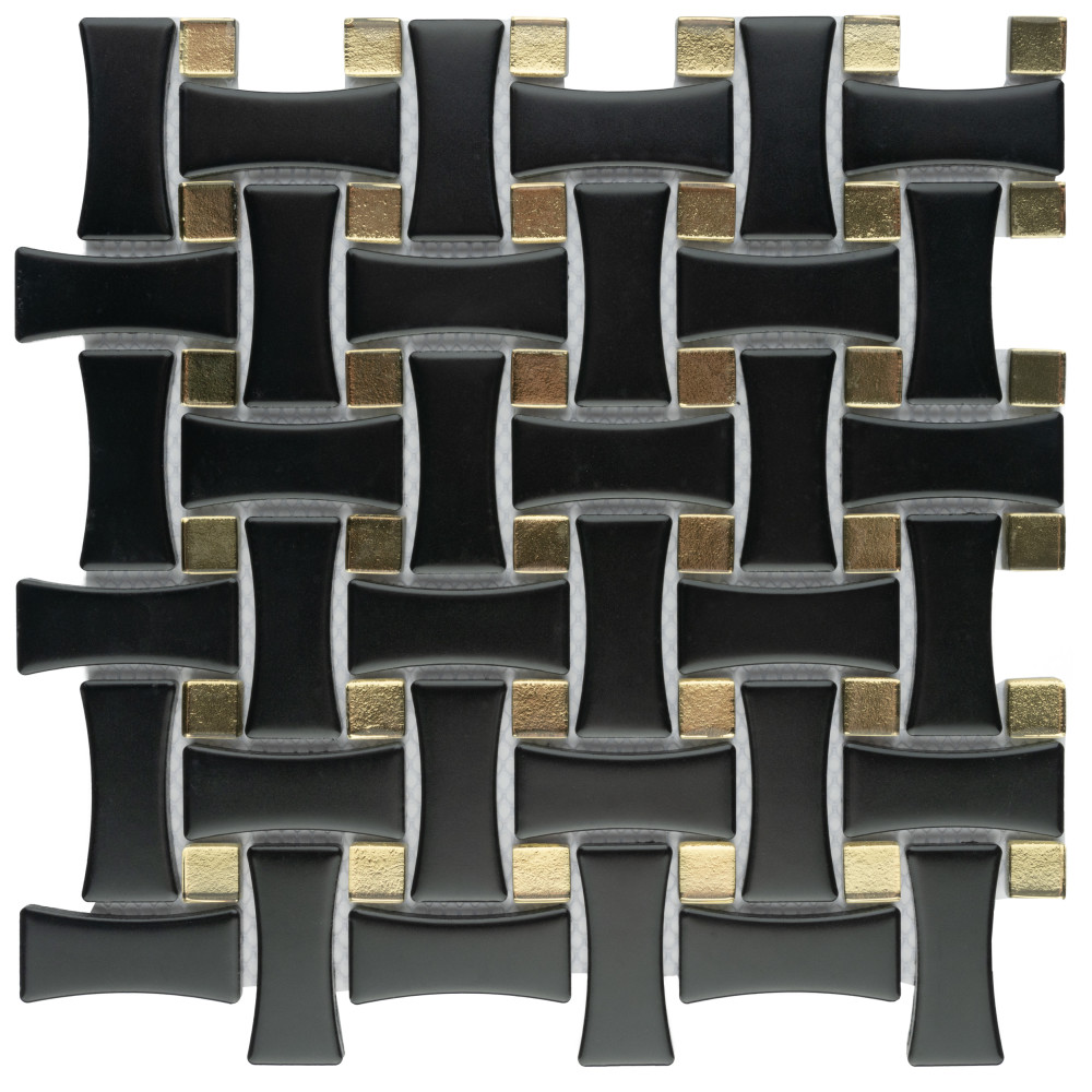 Metro Dog Bone Basketweave Matte Black w/Glass Gold Dot 10 in. x 10 in. Porcelain Mosaic Tile