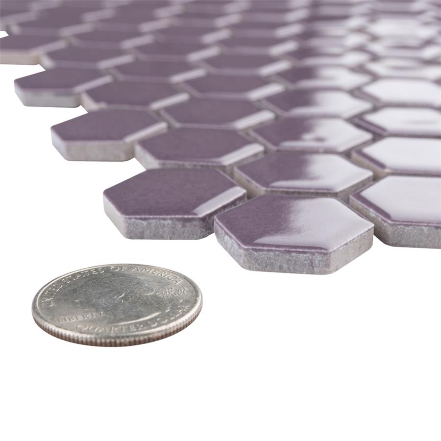 Transform your space into a tribute to retro design with our Metro Hex 1 in. Glossy Purple 11-7/8 in. x 10-1/4 in. Porcelain Floor and Wall Mosaic Tile. As a modern deviation from the classic mosaic, this fresh option is a throwback to traditional retro design with a contemporary feel. Glossy purple hexagons are arranged on an interlocking mesh to create a seamless installation. This minimalistic geometric porcelain mosaic is unique yet simplistic enough to integrate into any design, ranging from traditional style renovations to modern home projects. Its impervious and frost resistant features make this an ideal tile for indoor and outdoor use, including backsplashes, bathrooms, showers, kitchens and fireplace facades.Tile is the better choice for your space. This tile is made from natural ingredients, making it a healthy choice as it is free from allergens, VOCs, formaldehyde and PVC.