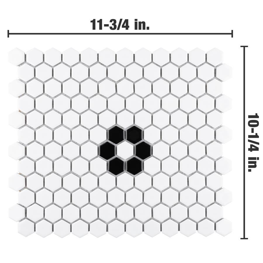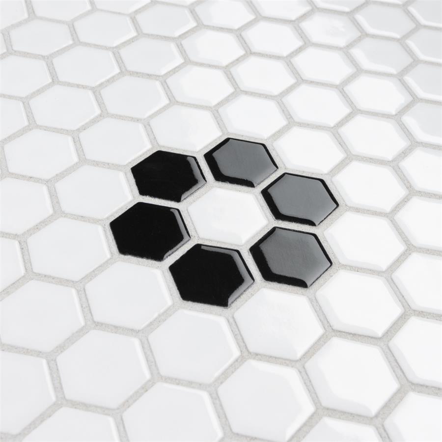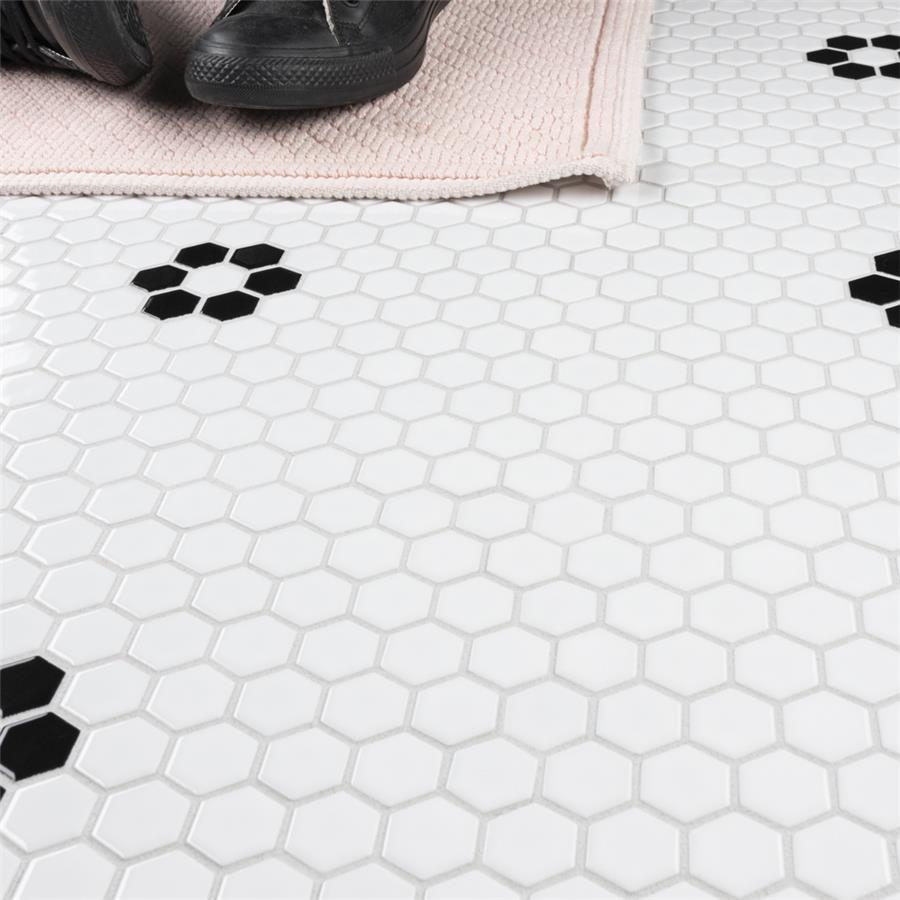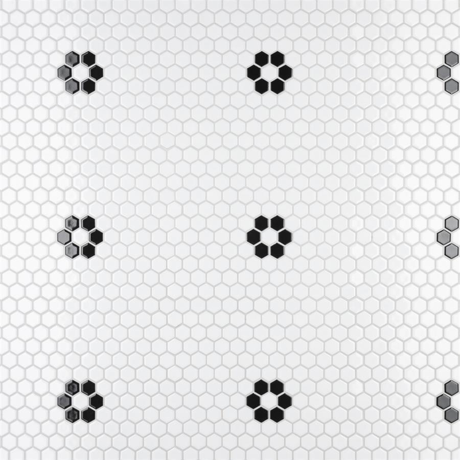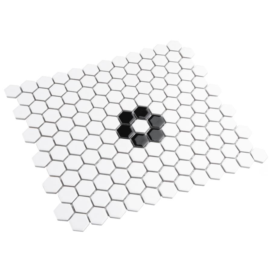 Transform your space into a tribute to retro design with our Metro Hex Glossy White with Single Flower 10-1/4” x 11-7/8” Porcelain Floor and Wall Mosaic Tile. As a modern deviation from the classic mosaic, this fresh option is a throwback to traditional retro design with a contemporary feel. Glossy white hexagons are accented by contrasting glossy black hexagons arranged into the shape of a flower on an interlocking mesh to create a seamless installation. This minimalistic geometric porcelain mosaic is unique yet simplistic enough to integrate into any design, ranging from traditional style renovations to modern home projects. Its impervious and frost-resistant features make this an ideal tile for both indoor and outdoor residential use, including backsplashes, bathrooms, showers, kitchens and fireplace facades. This tile is a perfect choice on its own or paired with other products in the Metro Collection. Tile is the better choice for your space. This tile is made from natural ingredients, making it a healthy choice as it is free from allergens, VOCs, formaldehyde and PVC.