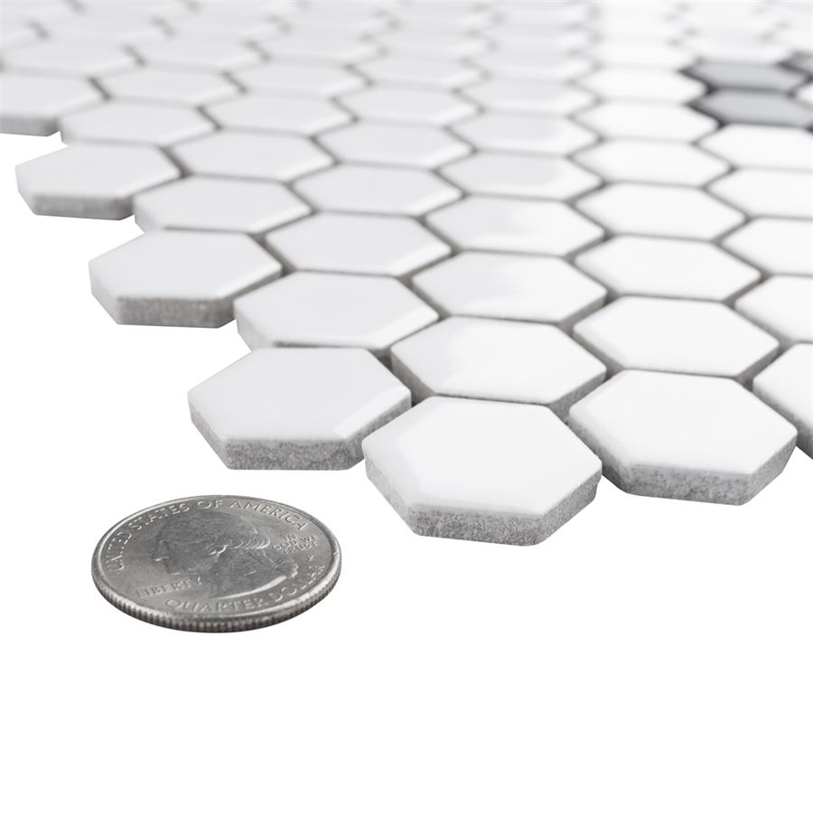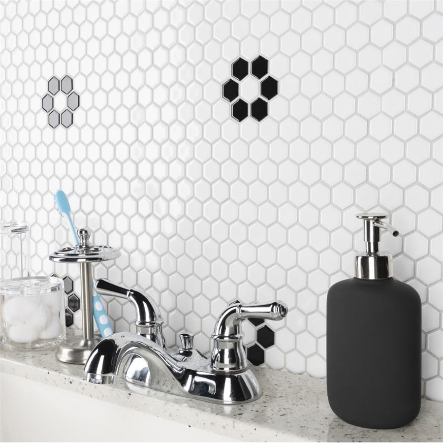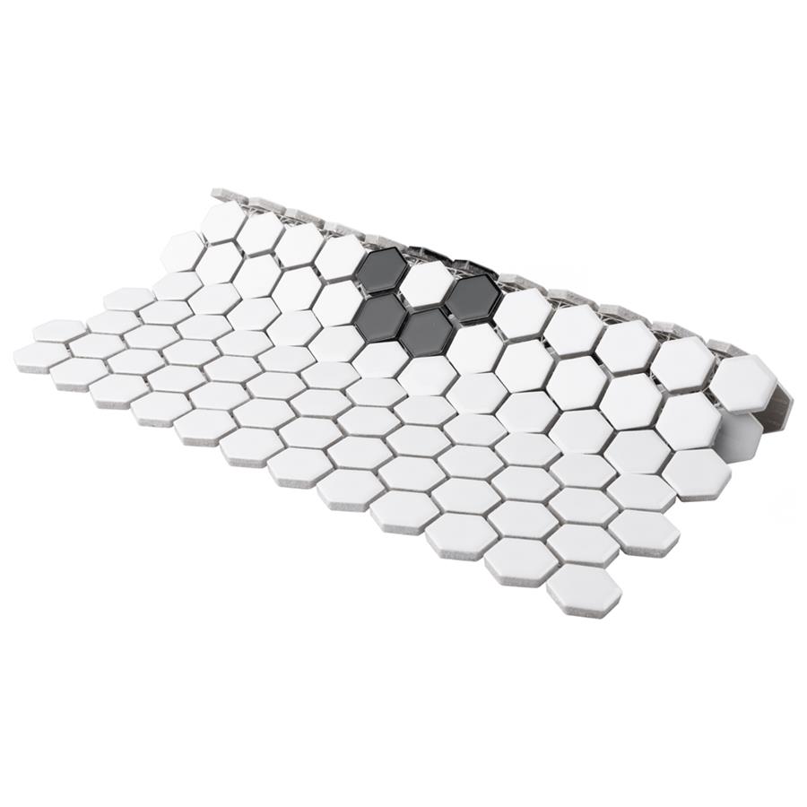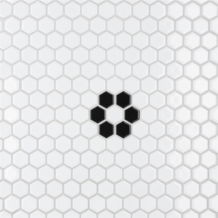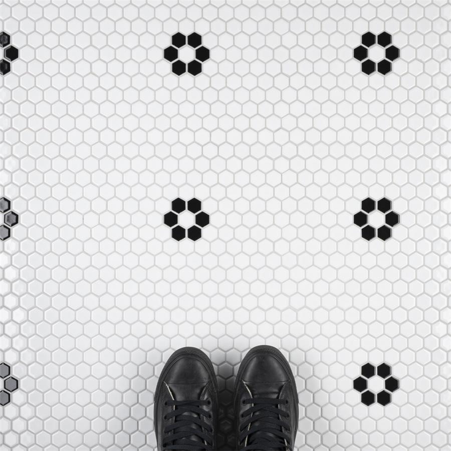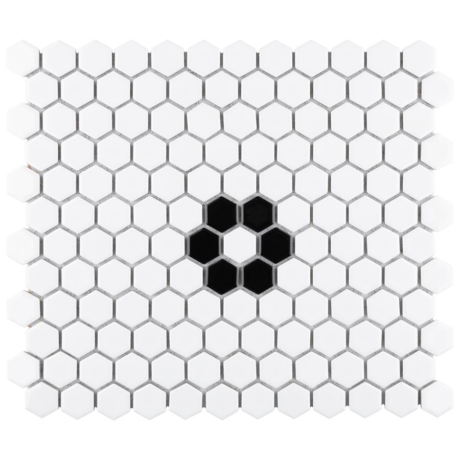 Transform your space into a tribute to retro design with our Metro Hex Glossy White with Single Flower 10-1/4” x 11-7/8” Porcelain Floor and Wall Mosaic Tile. As a modern deviation from the classic mosaic, this fresh option is a throwback to traditional retro design with a contemporary feel. Glossy white hexagons are accented by contrasting glossy black hexagons arranged into the shape of a flower on an interlocking mesh to create a seamless installation. This minimalistic geometric porcelain mosaic is unique yet simplistic enough to integrate into any design, ranging from traditional style renovations to modern home projects. Its impervious and frost-resistant features make this an ideal tile for both indoor and outdoor residential use, including backsplashes, bathrooms, showers, kitchens and fireplace facades. This tile is a perfect choice on its own or paired with other products in the Metro Collection. Tile is the better choice for your space. This tile is made from natural ingredients, making it a healthy choice as it is free from allergens, VOCs, formaldehyde and PVC.