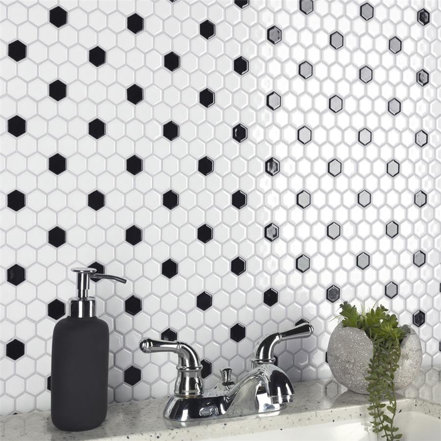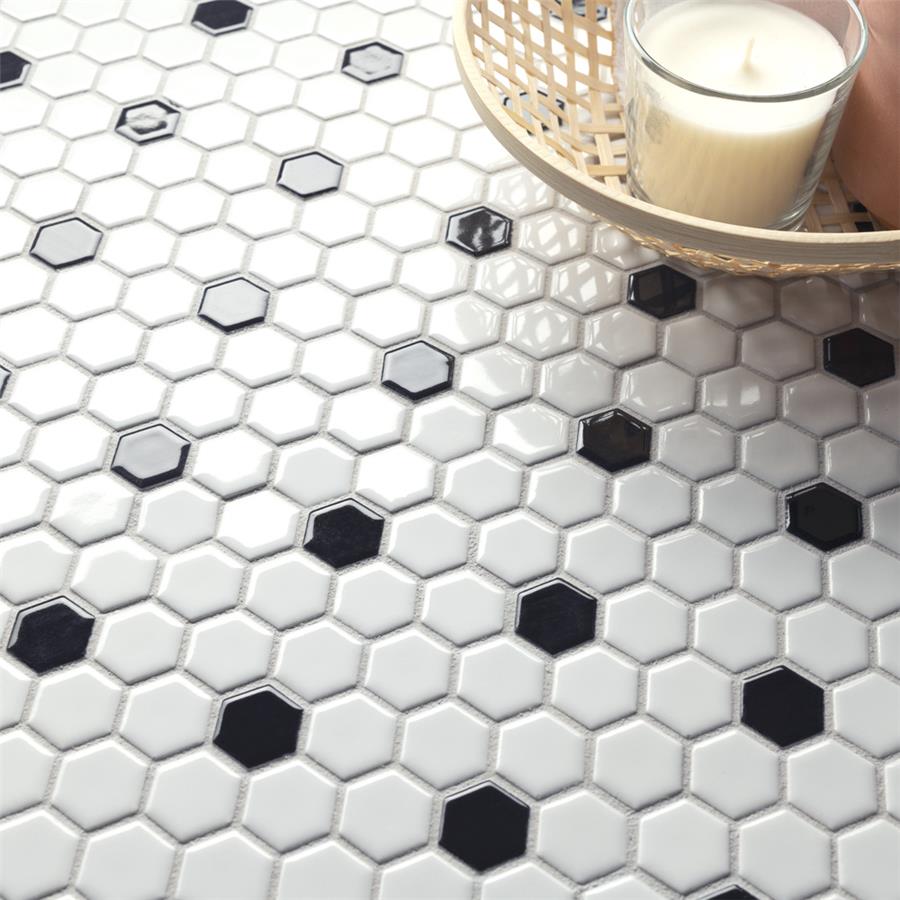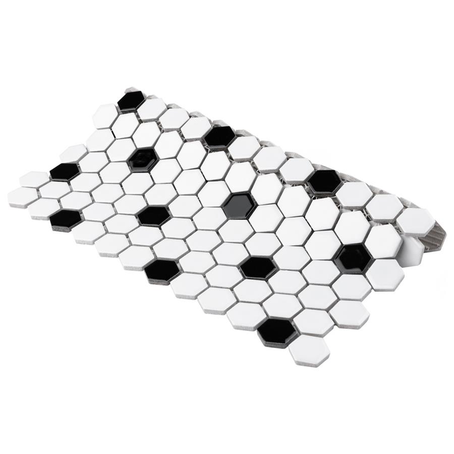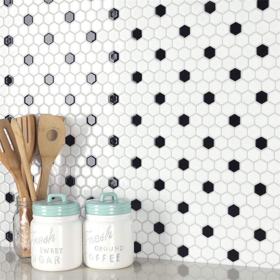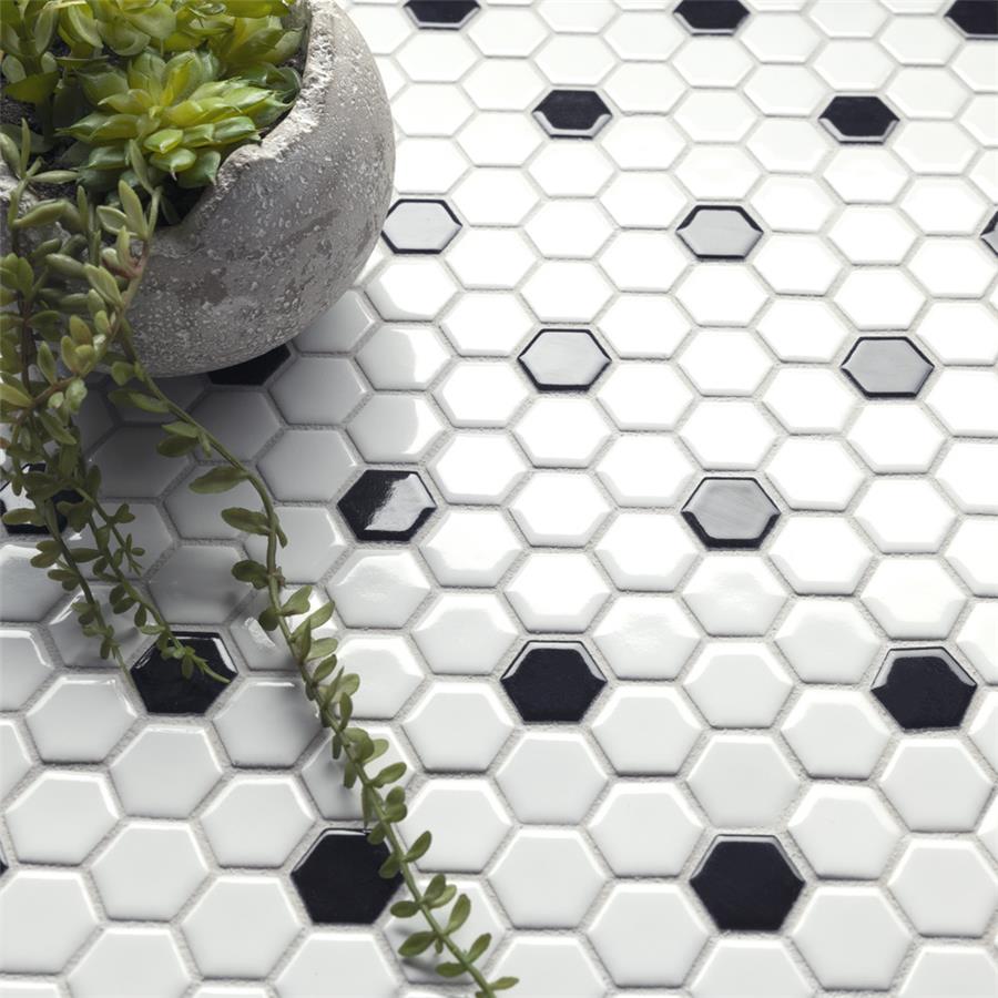 Transform your space into a tribute to retro design with our Metro Hex Glossy White with Black Dot 10-1/4 in. x 11-3/4 in. Porcelain Mosaic Floor and Wall Tile. As a modern deviation from the classic hexagon mosaic, this tile option is a throwback to traditional retro design with a contemporary feel. Glossy white hexagons are accented by contrasting black chips and precisely arranged on an interlocking mesh to create a seamless installation. This minimalistic geometric porcelain mosaic is unique yet simplistic enough to integrate into any design, ranging from traditional style renovations to modern home projects. Its impervious and frost-resistant features make this an ideal tile for both indoor and outdoor residential use, including backsplashes, bathrooms, showers and kitchens. This tile is a perfect choice on its own or paired with other products in the Metro Hex Collection.Tile is the better choice for your space. This tile is made from natural ingredients, making it a healthy choice as it is free from allergens, VOCs, formaldehyde and PVC.