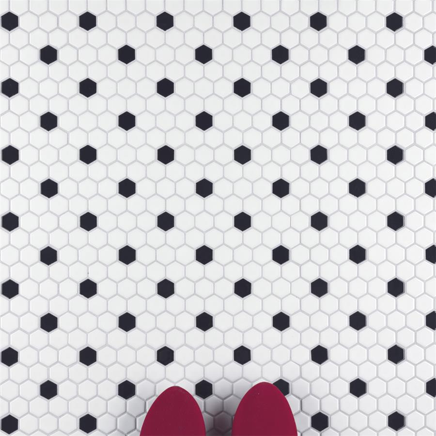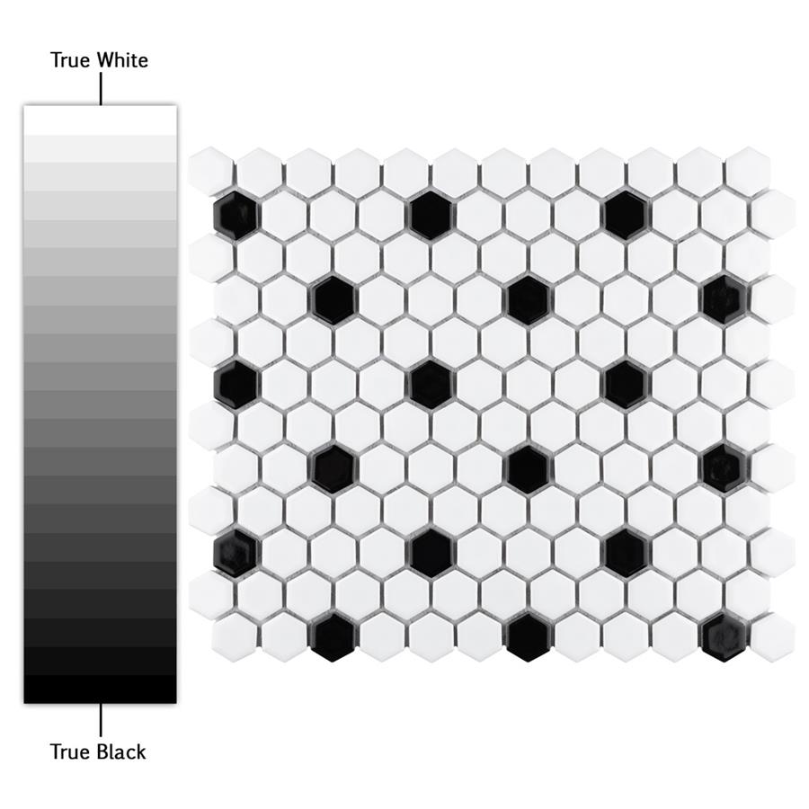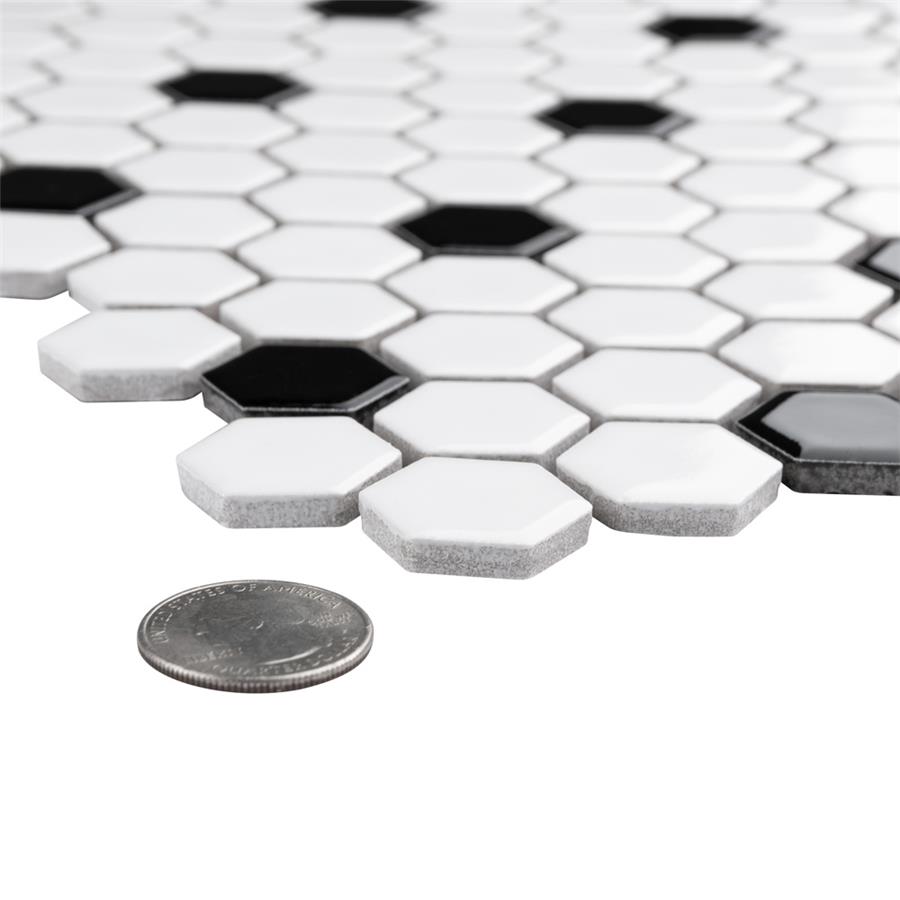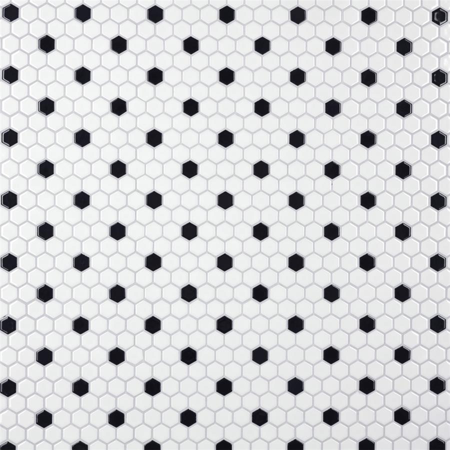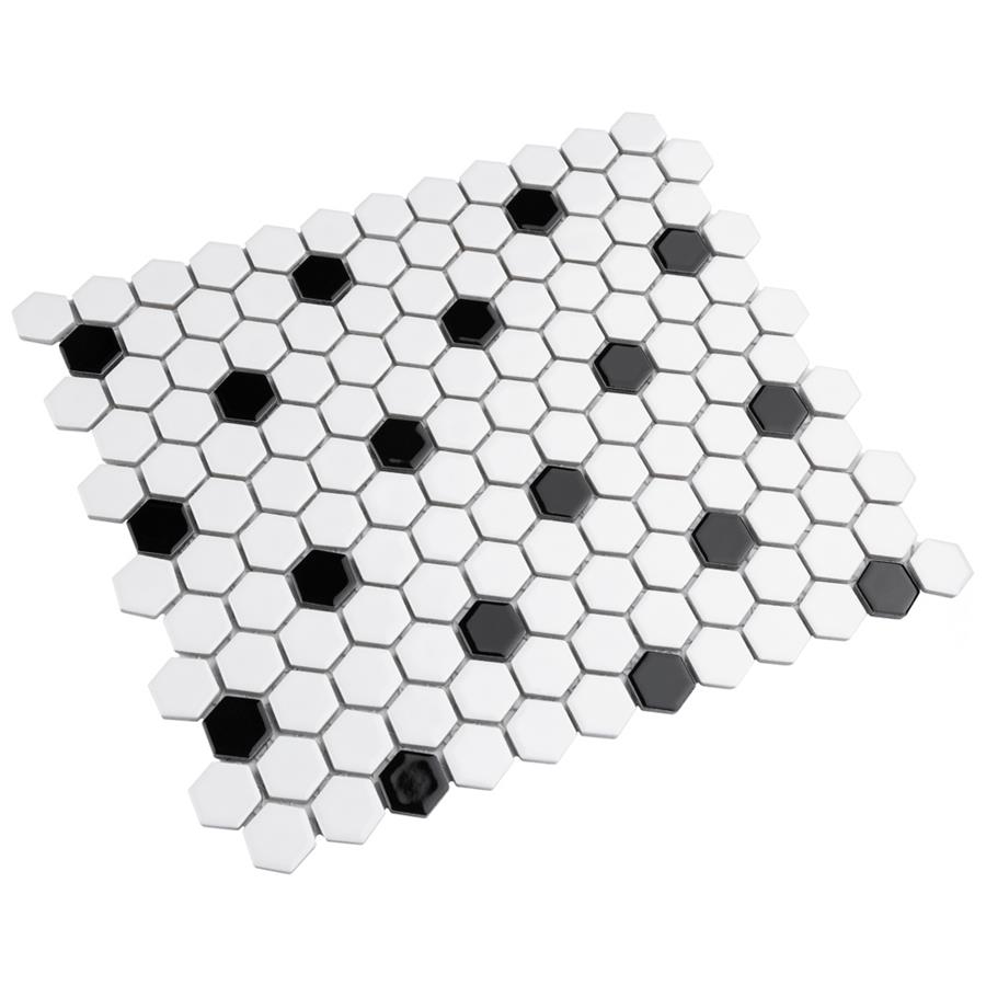 Transform your space into a tribute to retro design with our Metro Hex Glossy White with Black Dot 10-1/4 in. x 11-3/4 in. Porcelain Mosaic Floor and Wall Tile. As a modern deviation from the classic hexagon mosaic, this tile option is a throwback to traditional retro design with a contemporary feel. Glossy white hexagons are accented by contrasting black chips and precisely arranged on an interlocking mesh to create a seamless installation. This minimalistic geometric porcelain mosaic is unique yet simplistic enough to integrate into any design, ranging from traditional style renovations to modern home projects. Its impervious and frost-resistant features make this an ideal tile for both indoor and outdoor residential use, including backsplashes, bathrooms, showers and kitchens. This tile is a perfect choice on its own or paired with other products in the Metro Hex Collection.Tile is the better choice for your space. This tile is made from natural ingredients, making it a healthy choice as it is free from allergens, VOCs, formaldehyde and PVC.