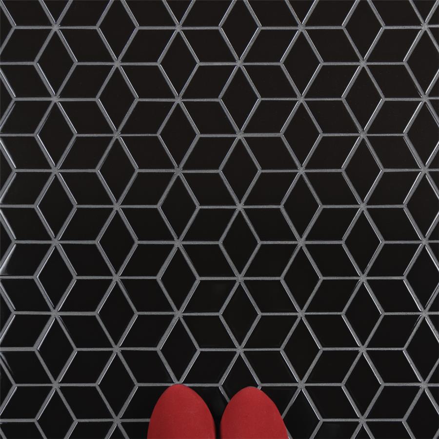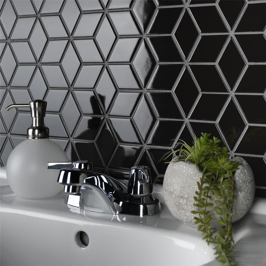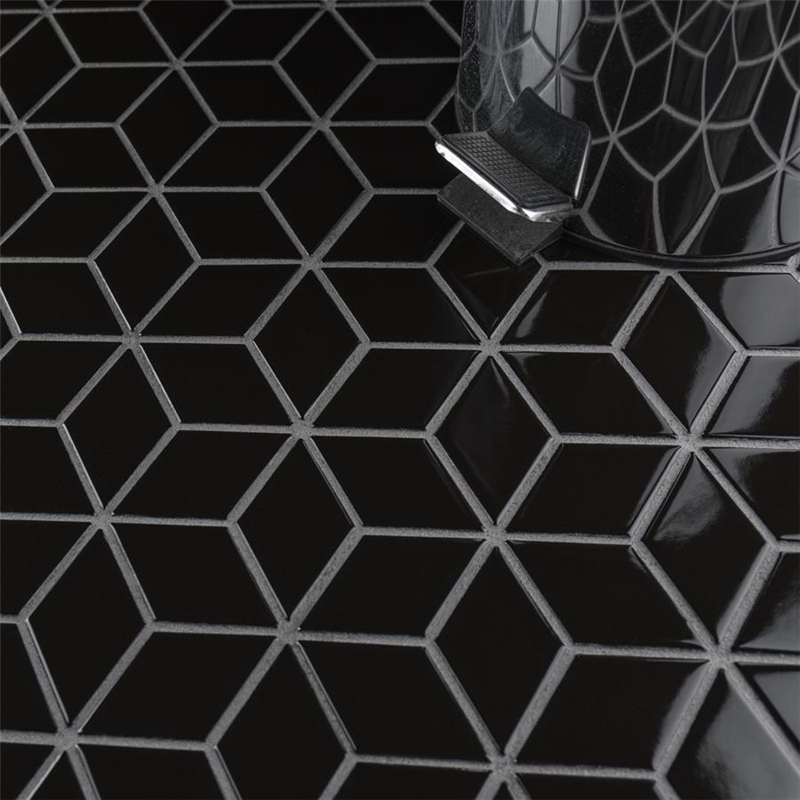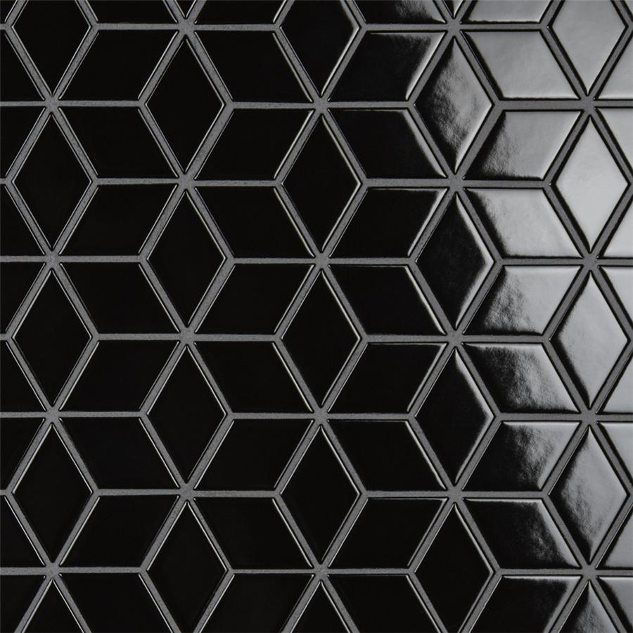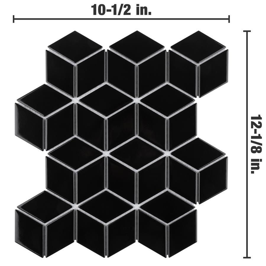 Our Metro Rhombus Glossy Black 10-1/2 in. x 12-1/8 in. Porcelain Mosaic Floor and Wall Tile instantly elevates spaces through a refreshing dose of geometric design. As an innovative twist on the classic mosaic, this product is comprised of diamond shaped chips in black with a smooth surface. Glossy diamonds are arranged on an interlocking mesh to create a seamless installation. This minimalistic geometric porcelain mosaic is unique yet simplistic enough to integrate into any design, ranging from traditional style renovations to modern home projects. Its impervious and frost-resistant features make this an ideal tile for both indoor and outdoor residential use, including backsplashes, bathrooms, showers and kitchens. This tile is a perfect choice on its own or paired with other products in the Metro Rhombus Collection.Tile is the better choice for your space. This tile is made from natural ingredients, making it a healthy choice as it is free from allergens, VOCs, formaldehyde and PVC.