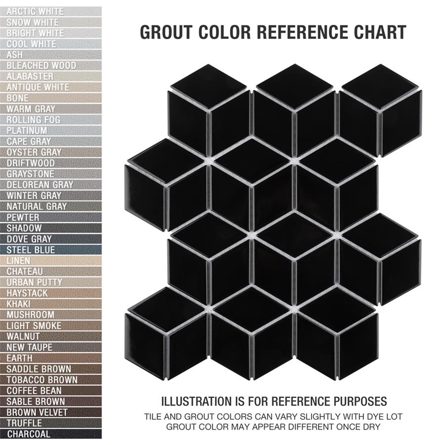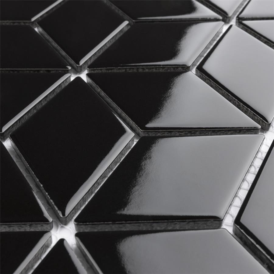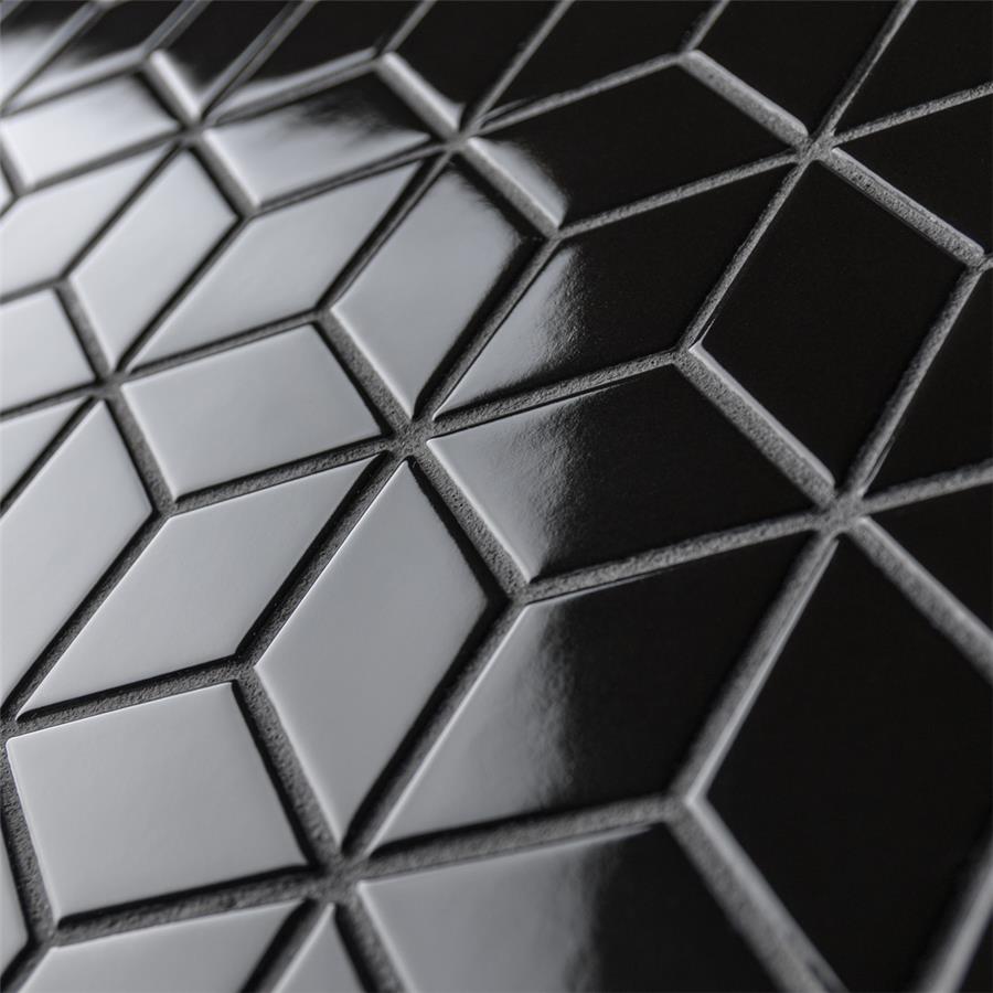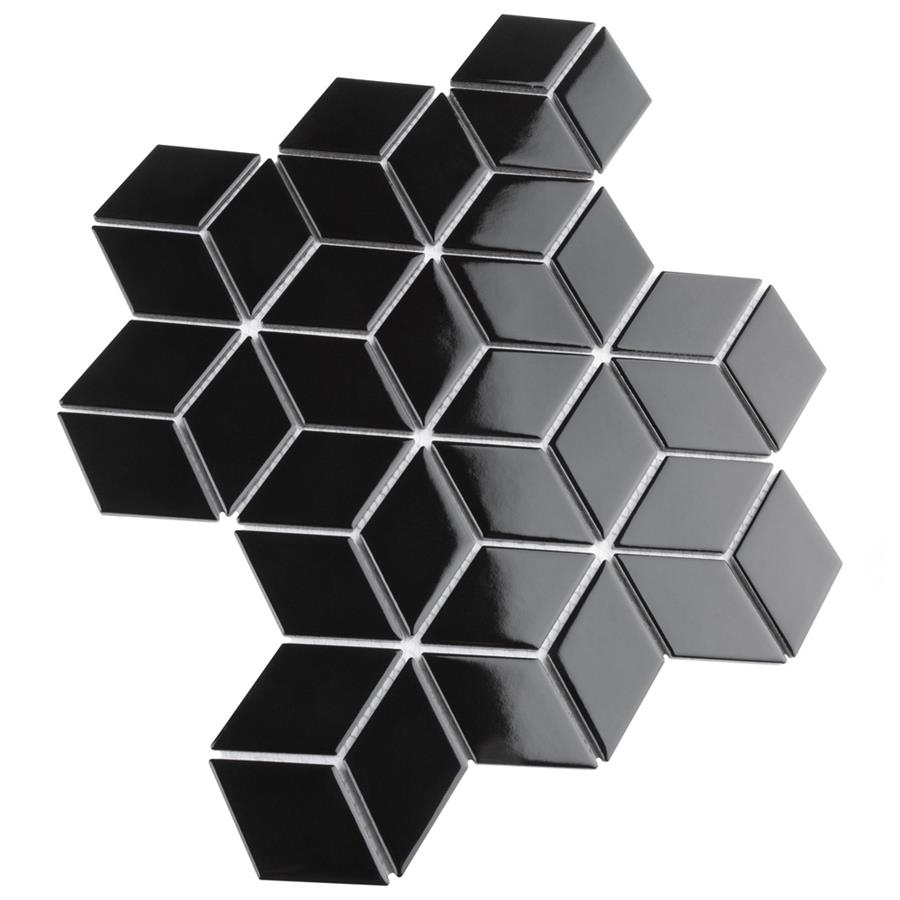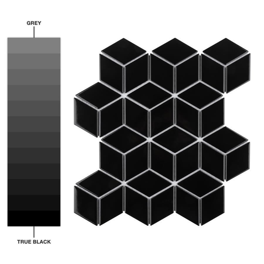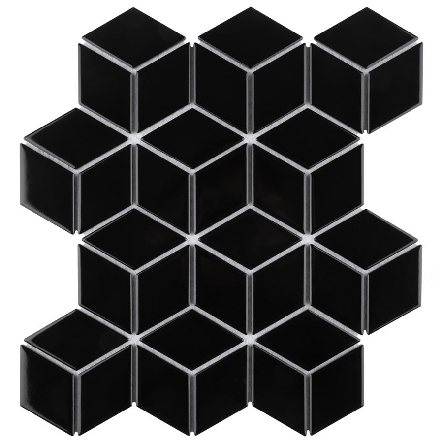 Our Metro Rhombus Glossy Black 10-1/2 in. x 12-1/8 in. Porcelain Mosaic Floor and Wall Tile instantly elevates spaces through a refreshing dose of geometric design. As an innovative twist on the classic mosaic, this product is comprised of diamond shaped chips in black with a smooth surface. Glossy diamonds are arranged on an interlocking mesh to create a seamless installation. This minimalistic geometric porcelain mosaic is unique yet simplistic enough to integrate into any design, ranging from traditional style renovations to modern home projects. Its impervious and frost-resistant features make this an ideal tile for both indoor and outdoor residential use, including backsplashes, bathrooms, showers and kitchens. This tile is a perfect choice on its own or paired with other products in the Metro Rhombus Collection.Tile is the better choice for your space. This tile is made from natural ingredients, making it a healthy choice as it is free from allergens, VOCs, formaldehyde and PVC.