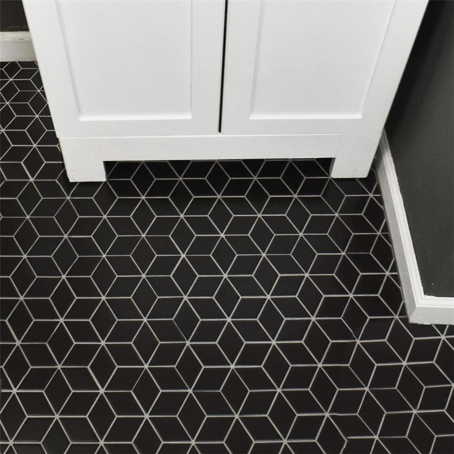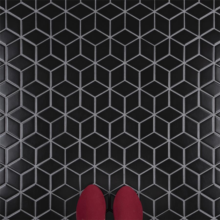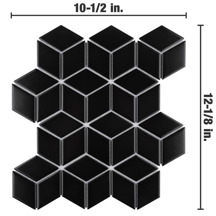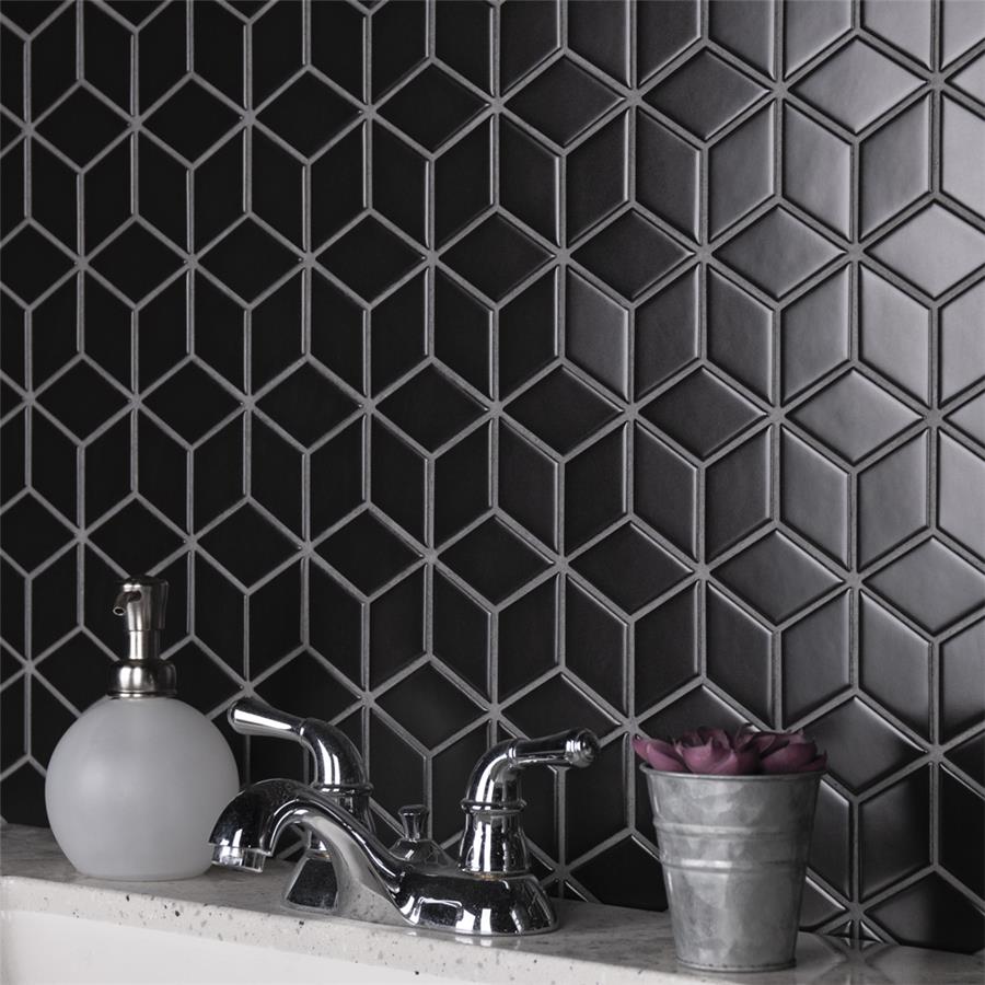 Our Metro Rhombus Matte Black 10-1/2 in. x 12-1/8 in. Porcelain Mosaic Floor and Wall Tile instantly elevates spaces through a refreshing dose of geometric design. As an innovative twist on the classic mosaic, this product is comprised of diamond shaped chips in black with a smooth surface. Matte diamonds are arranged on an interlocking mesh to create a seamless installation. This minimalistic geometric porcelain mosaic is unique yet simplistic enough to integrate into any design, ranging from traditional style renovations to modern home projects. Its impervious and frost-resistant features make this an ideal tile for both indoor and outdoor residential use, including backsplashes, bathrooms, showers and kitchens. This tile is a perfect choice on its own or paired with other products in the Metro Rhombus Collection.Tile is the better choice for your space. This tile is made from natural ingredients, making it a healthy choice as it is free from allergens, VOCs, formaldehyde and PVC.
