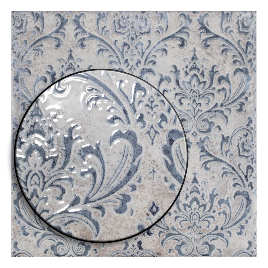 Our Milano Décor Daman Azul 7-7/8 in. x 7-7/8 in. Ceramic Wall Tile features decorative detailing consisting of flowing lines and curved edges, creating an art nouveau style. With distressed slate and powder blue floral patterns set on a chalky white glaze and a mixed finish, this tile has an aged yet elegant appearance. This wall only tile is an ideal choice for a variety of installations including, backsplashes, fireplaces and powder rooms. Tile is the better choice for your space. This tile is made from natural ingredients, making it a healthy choice as it is free from allergens, VOCs, formaldehyde and PVC.
