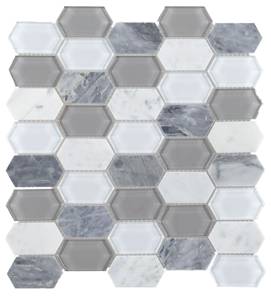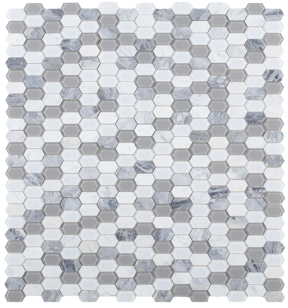Product Sold By The SheetElongated Hex Series: Montage Grey 12.5×13.25. A mix of Bardiglio Marble, Carrara White Marble and Glass in an elongated hexagon shape.Suggested Grout Color: Bostik Dimension Diamond H600WARNING: This product can expose you to chemicals including crystalline silica (airborne particles of respirable size) in dust created during fabrication/installation if the product is dry cut/ground or pulverized, which are known to the State of California to cause cancer. For more information, go to https://www.p65warnings.ca.gov/.