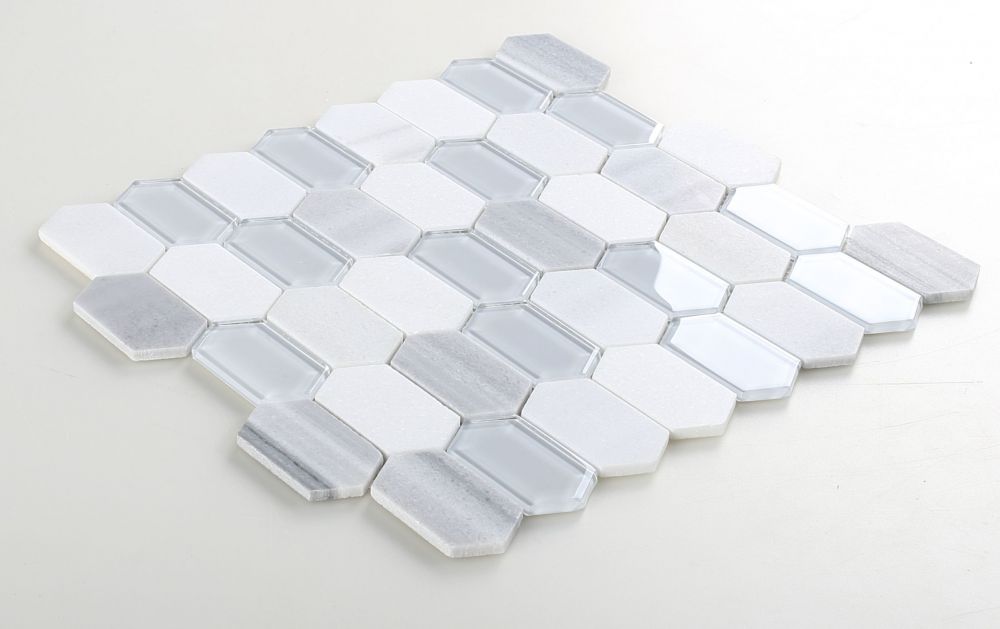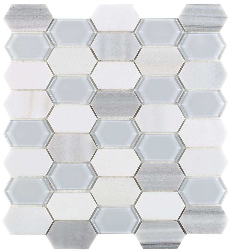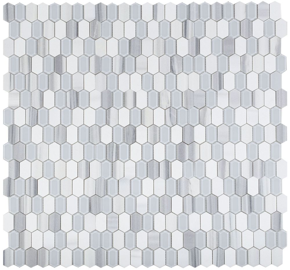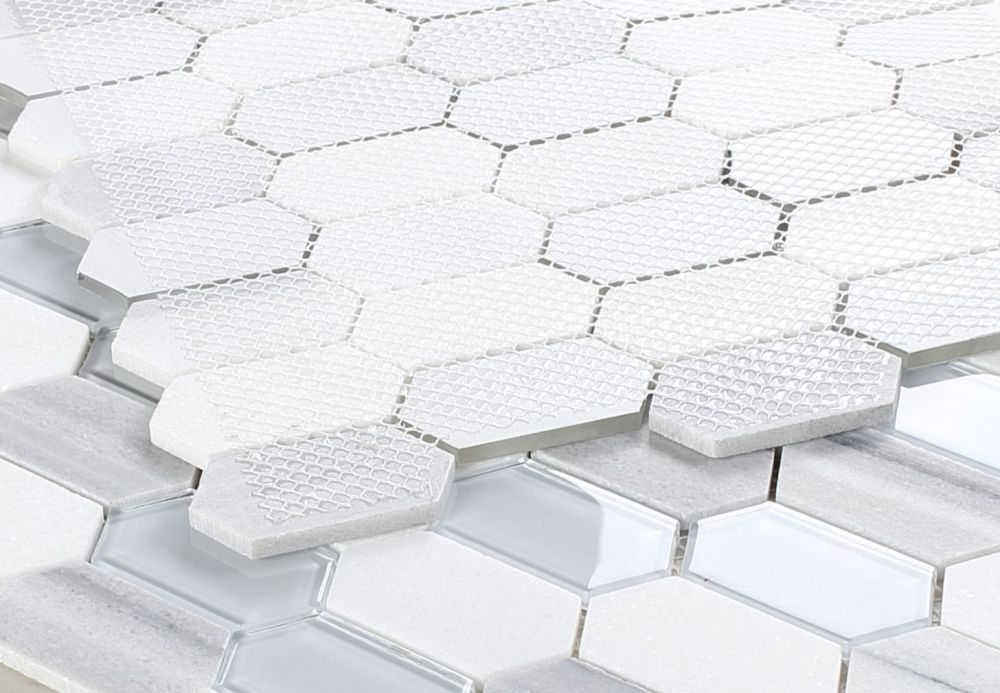 Product Sold By The SheetElongated Hex Series: Montage Light 12.5×13.25. A mix of White Thassos Marble, Marmala White Marble and Glass in an elongated hexagon shape.Suggested Grout Color: Bostik Dimension Diamond H600WARNING: This product can expose you to chemicals including crystalline silica (airborne particles of respirable size) in dust created during fabrication/installation if the product is dry cut/ground or pulverized, which are known to the State of California to cause cancer. For more information, go to https://www.p65warnings.ca.gov/.