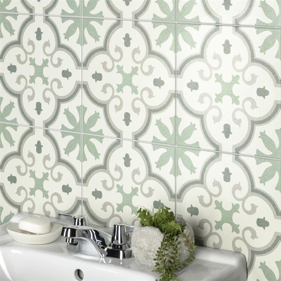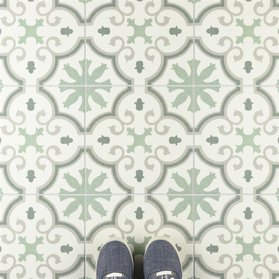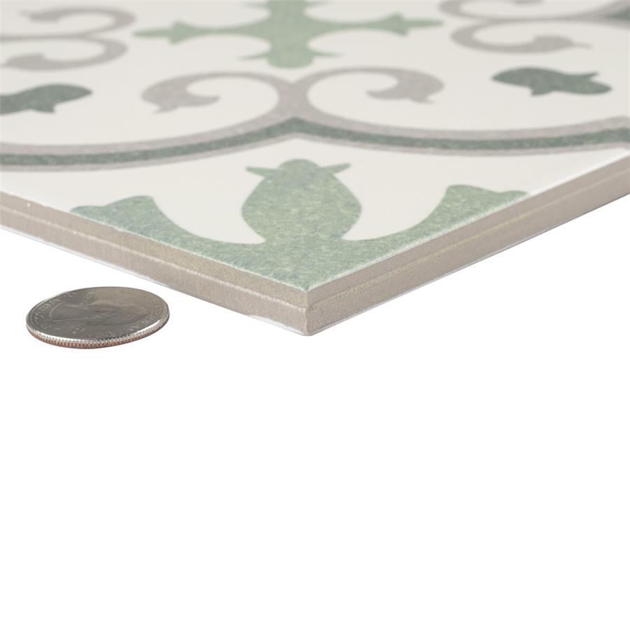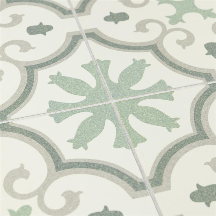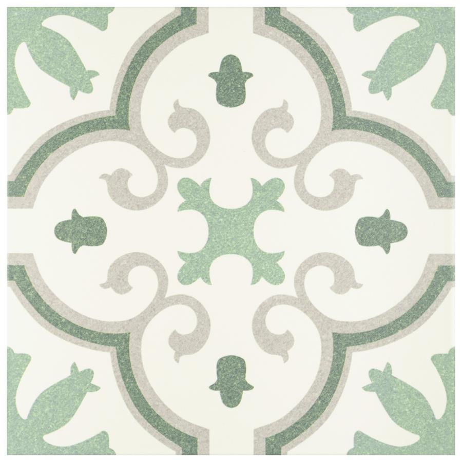 Capturing the beauty of artisanal cement tile, our Monteca Green 9-3/4 in. x 9-3/4 in. Porcelain Floor and Wall Tile is a gorgeous tribute to encaustic design. Set on an eggshell white base glaze, this tile features floral old-world patterns that frame dueling arcs at the center in varying shades of faded olive green, light green and light grey, offering contrast and dimension to the decoration. The smooth, satin surface features a weathered, speckled look, replicating the beauty of aged tile. The floral, geometric pattern blends into virtually any design theme, making this an exceptional product for modern installations and historic renovations. Its impervious and frost-resistant features make this tile and ideal choice for both indoor and outdoor commercial and residential installations, including kitchens, bathrooms, backsplashes and patios.Tile is the better choice for your space. This tile is made from natural ingredients, making it a healthy choice as it is free from allergens, VOCs, formaldehyde and PVC.