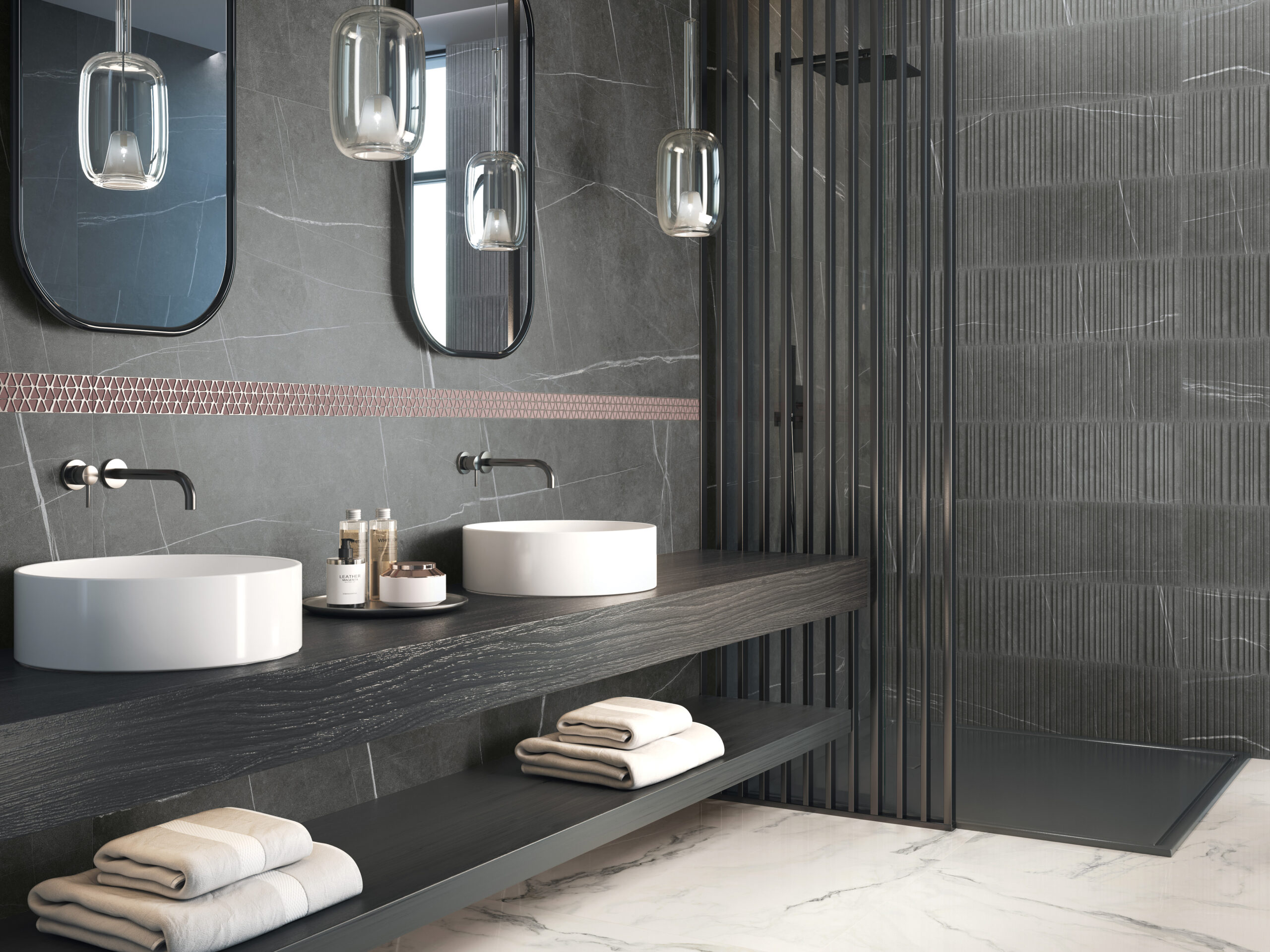 Create a bold and dramatic space with the Nomade collection – a unique selection of glazed porcelain tile with the look of natural stone. Glazed porcelain is smooth, stain-resistant, water-resistant, damage-resistant, and requires little maintenance. It is the perfect selection of tile for indoor and outdoor use. The tiles in this collection are available in 28” x 48” Field Tile and Deco Tile, 3” x 24” Bullnose trim, and 1” x 4” Straight Set Mosaic that comes in 12” x 12” sheets. Each size is offered in neutral Bone, Argent, and Noir shades with a matte finish. The Nomade Collection is made in Spain.Images and product samples are representative of a product’s potential characteristics. There is no guarantee that the sample product or images will 100% match the product received. Field and trim tile may not be an exact match. We reserve the right to make changes to product specifications at any time without notice. Tiles are subject to variations in color, shade, sizing, surface texture and finish. Prior to installation, installer must blend tiles from several different boxes to achieve an even distribution of color range. Installer must conduct a dry mock layout under proper lighting conditions prior to installation. It is the consumer’s responsibility to inspect the product prior to installation to ensure satisfaction. Once installed, the product is deemed accepted. Reference the most current TCNA Handbook, ANSI, manufacturer’s specifications, and the Bedrosians® Care & Maintenance guide for installation, outdoor use, care and maintenance information. Improper installation, application, and/or use voids warranty. Please visit www.bedrosians.com for current product information.POLISHED/HONED CERAMIC & PORCELAINFor installation of all polished ceramic/porcelain, polished glazed ceramic/porcelain, and all honed ceramic/porcelain tiles, Manufacturer requires use of a grout release or sealer prior to grouting. Manufacturer also requires use of a grout color that matches the predominant color of the tile. Do not use acidic cleaners on polished ceramic/porcelain, polished glazed ceramic/porcelain, or honed ceramic/porcelain tiles.FLOOR APPLICATIONThe maximum allowable installation offset is 33%. Minimum grout joint must be 3/16 inch. Please refer to the most current TCNA Handbook. Manufacturer strongly recommends use of a leveling system during installation. DO NOT INSTALL IN POOLS, SPAS/HOT TUBS, AND/OR SUBMERGED APPLICATIONS UNLESS OTHERWISE INDICATED.