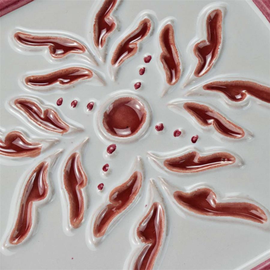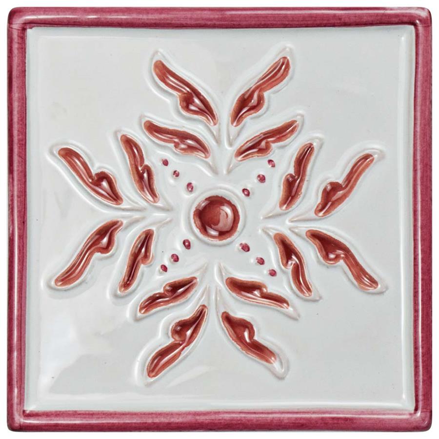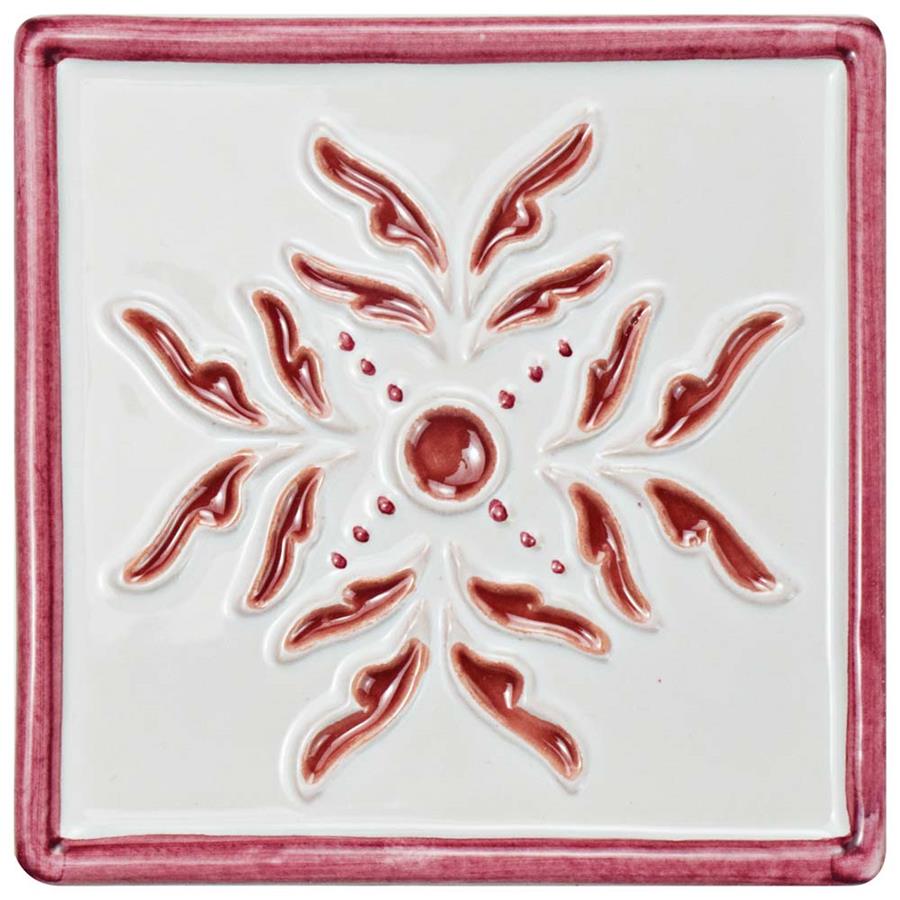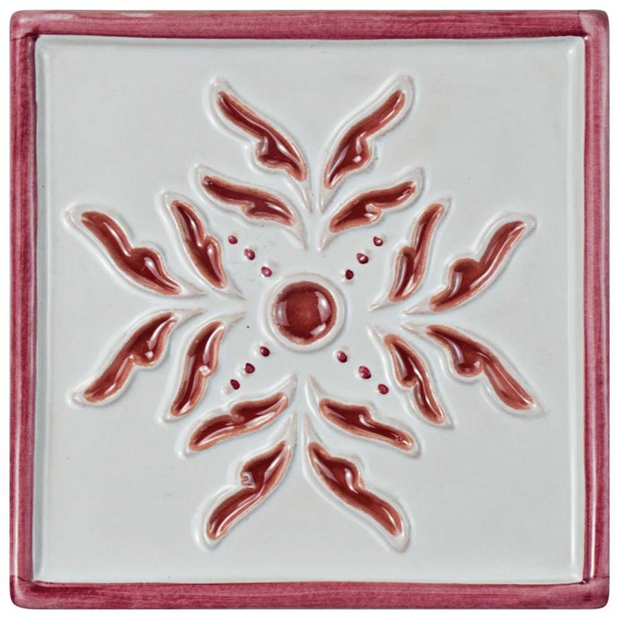 Capture a handcrafted, artisan appearance that is inspired by twentieth-century Spain with our Novecento Taco Evoli Burdeos 5-1/8 in. x 5-1/8 in. Ceramic Wall Tile. Set on a milky hand-painted white glaze, the center floral design is sunken into the surface and has a crackle finish, giving it a dimensional feel. Spots of the red ceramic peek through the bisque glaze on the elevated designs, creating the authentic artisan look. The burnt brick color seen throughout has a watercolor, hand-painted design offering a great accent for your wall installation. This glossy old-world tile is great for accenting other items in the Novecento program. Intended for interior wall use, this tile is an excellent selection to accent your backsplash, shower wall, fireplace facade or accent wall. It is necessary that you seal this tile before grouting to prevent the absorption of staining agents over time. Tile is the better choice for your space. This tile is made from natural ingredients, making it a healthy choice as it is free from allergens, VOCs, formaldehyde and PVC.