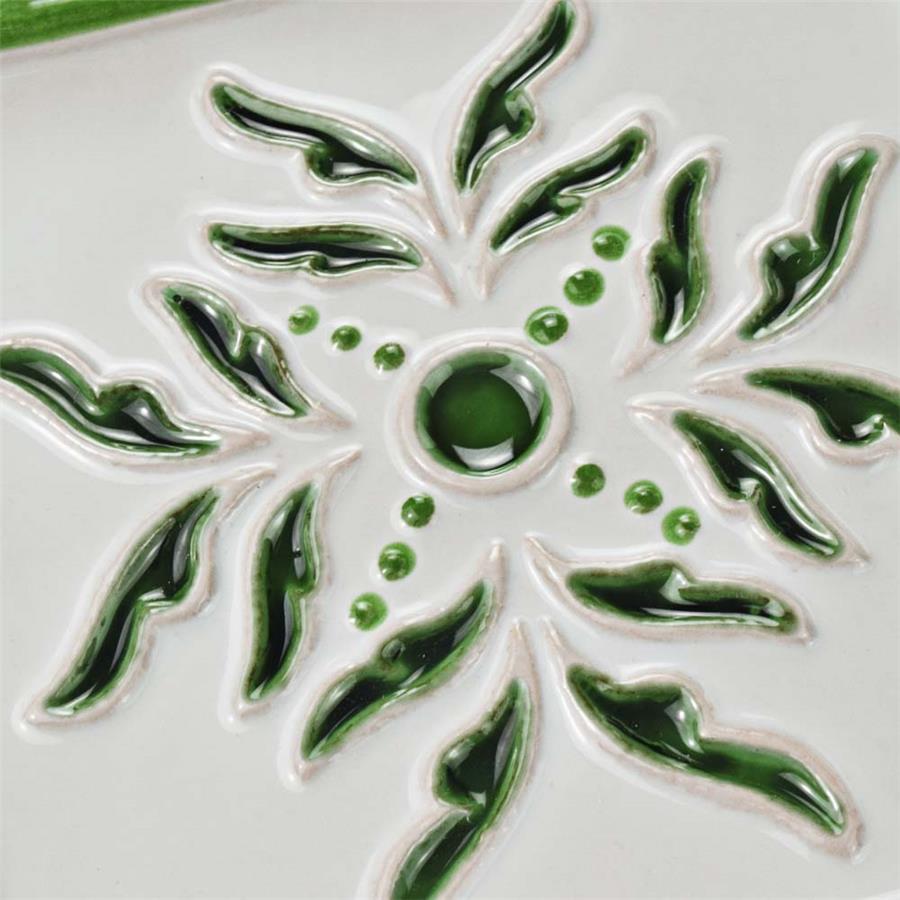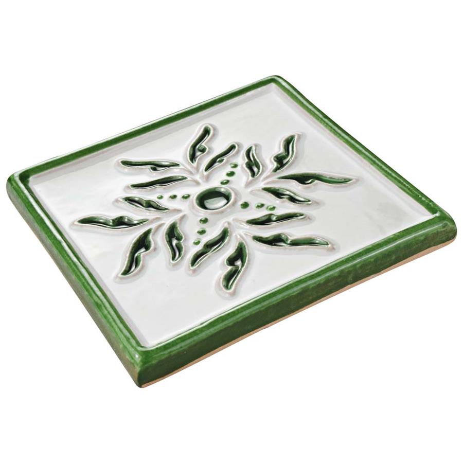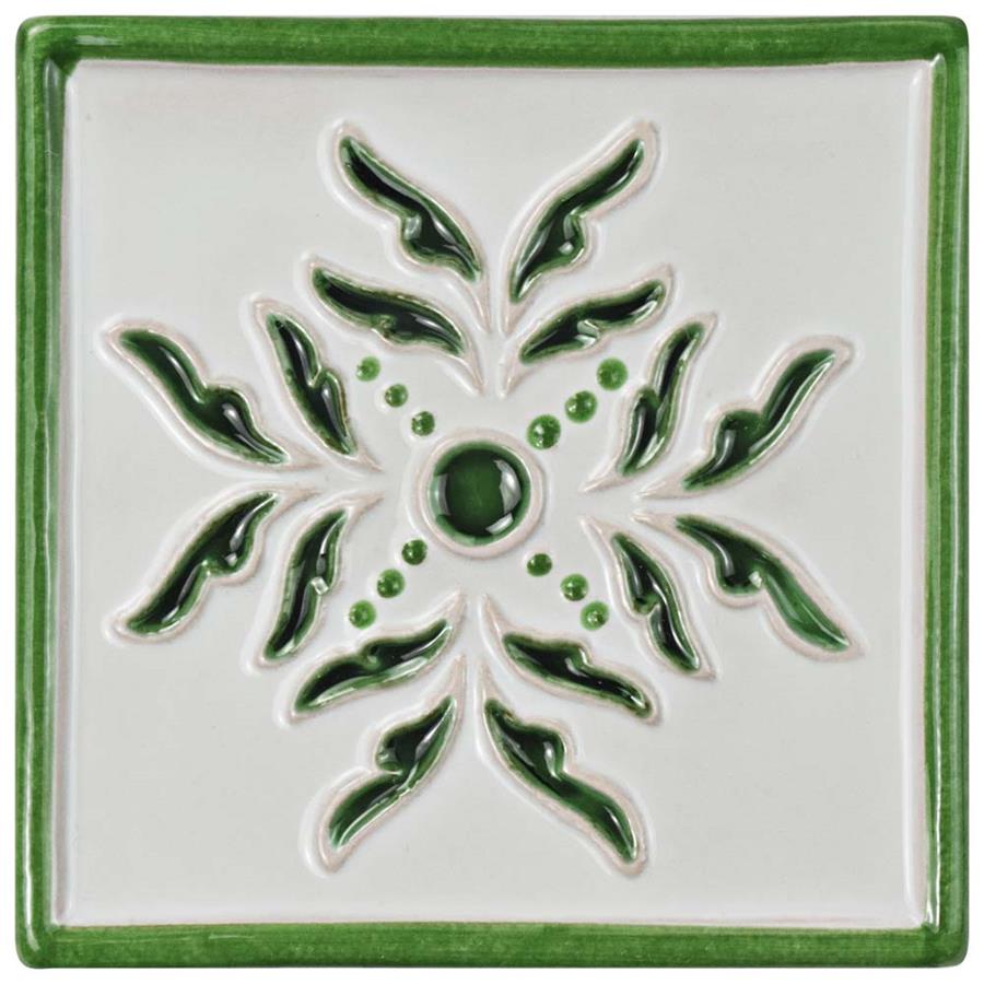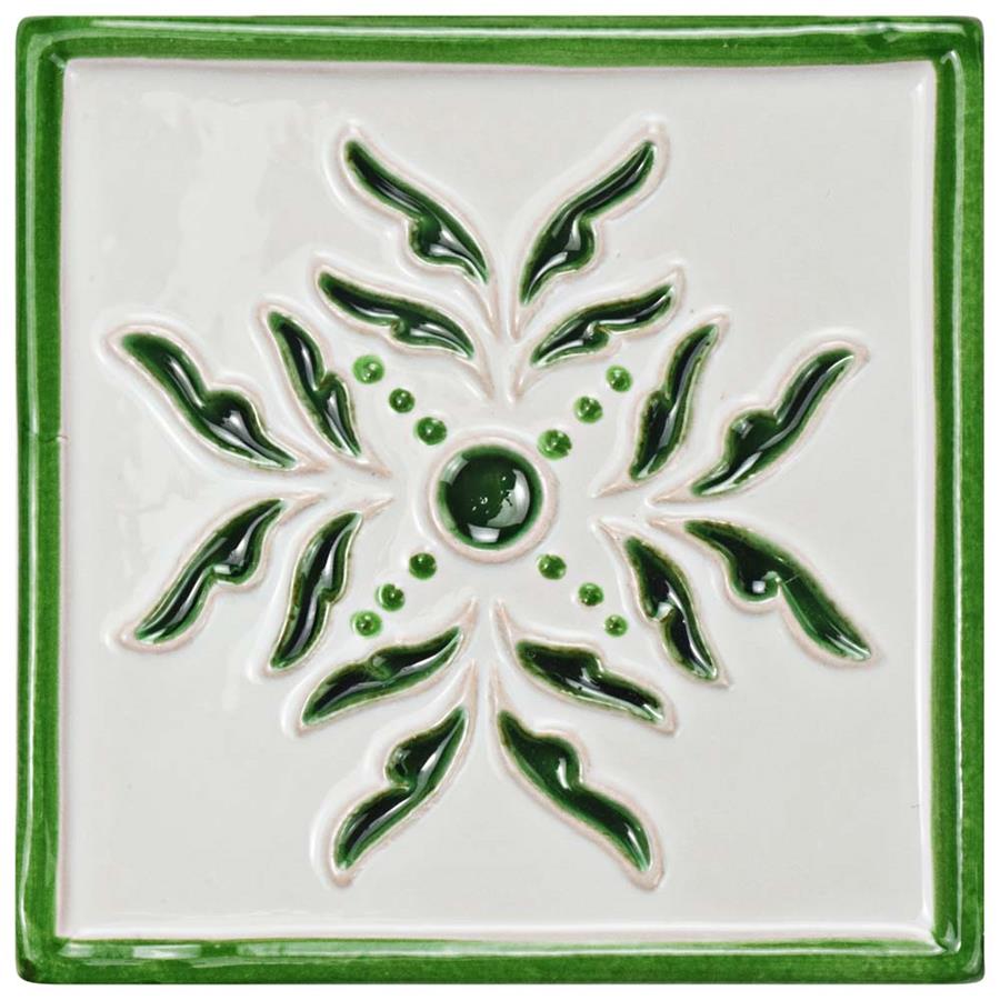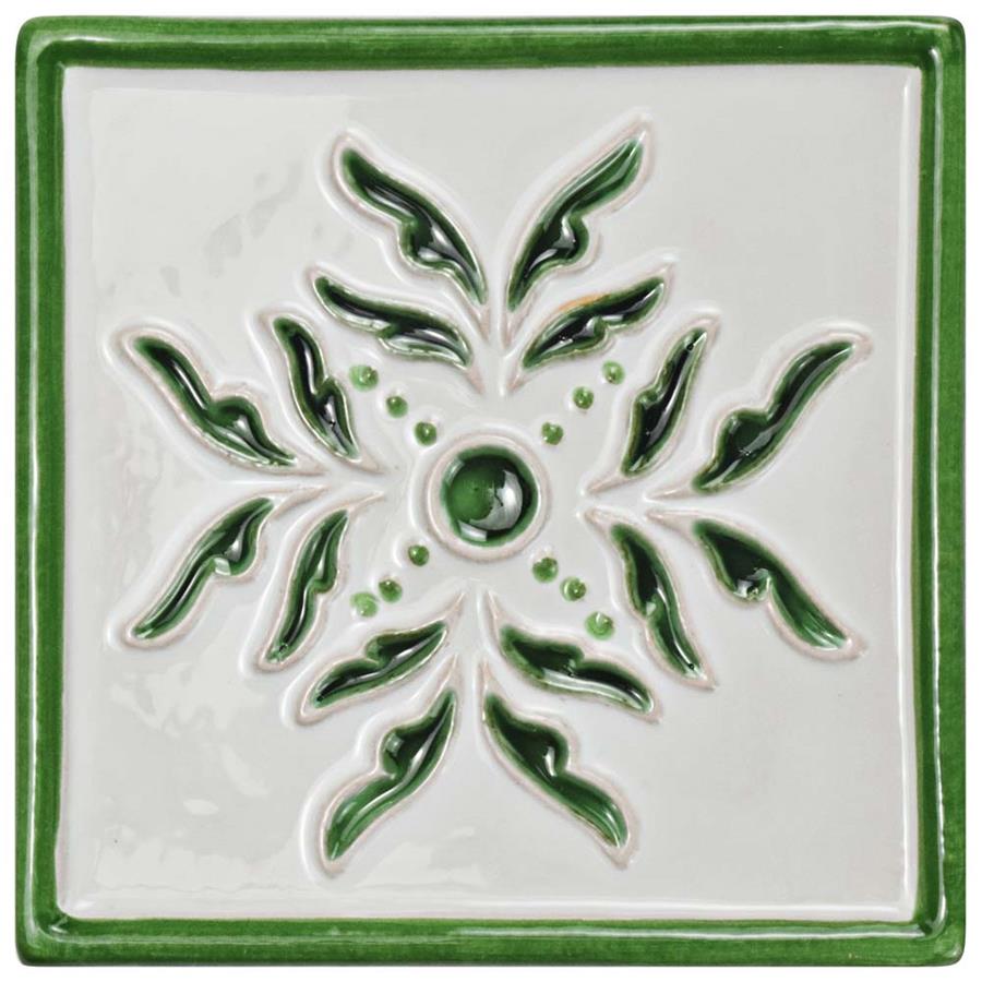 Capture a handcrafted, artisan appearance that is inspired by twentieth-century Spain with our Novecento Taco Evoli Verdin 5-1/8 in. x 5-1/8 in. Ceramic Wall Tile. Set on a milky hand-painted white glaze, the center floral design is sunken into the surface and has a crackle finish, giving it a dimensional feel. Spots of the red ceramic peek through the bisque glaze on the elevated designs, creating the authentic artisan look. The forest green color seen throughout has a watercolor, hand-painted design offering a great accent for your wall installation. This glossy old-world tile is great for accenting other items in the Novecento program. Intended for interior wall use, this tile is an excellent selection to accent your backsplash, shower wall, fireplace facade or accent wall. It is necessary that you seal this tile before grouting to prevent the absorption of staining agents over time. Tile is the better choice for your space. This tile is made from natural ingredients, making it a healthy choice as it is free from allergens, VOCs, formaldehyde and PVC.