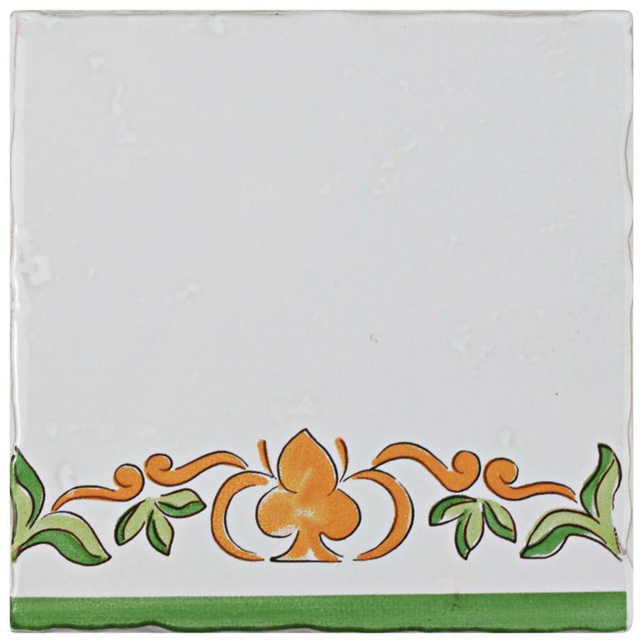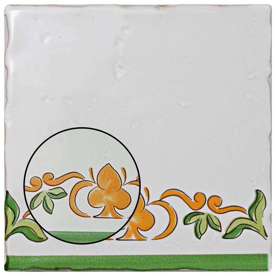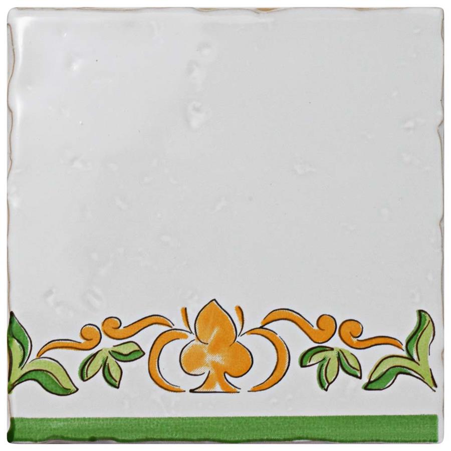 Capture a handcrafted, artisan appearance that is inspired by twentieth-century Spain with our Novecento Tira Paterna Deco 5-1/8 in. x 5-1/8 in. Ceramic Wall Tile. Set on a milky white glaze, a top-bordering golden flourishing hand-painted design is accented by hand-painted dainty leaves. Asymmetrical edges and a smooth surface with varying indentations throughout this glossy trim piece fashion a handmade appearance. Due to its partially handmade process, each tile could offer slight size variation. This old-world tile is great for acting as an accent for the other items in the Novecento program. Intended for interior wall use, this tile is an excellent selection to accent your backsplash, shower wall, fireplace facade or accent wall. Tile is the better choice for your space. This tile is made from natural ingredients, making it a healthy choice as it is free from allergens, VOCs, formaldehyde and PVC.