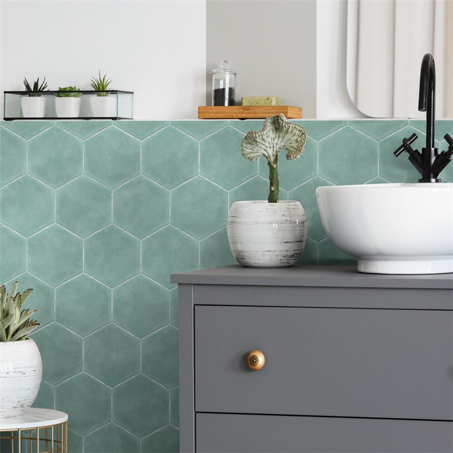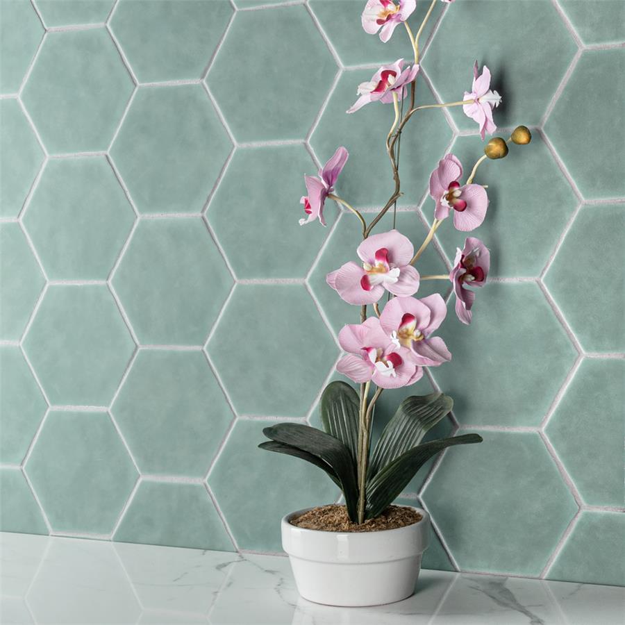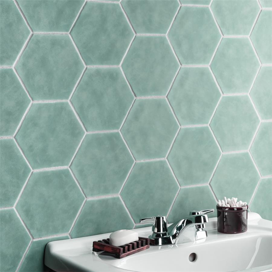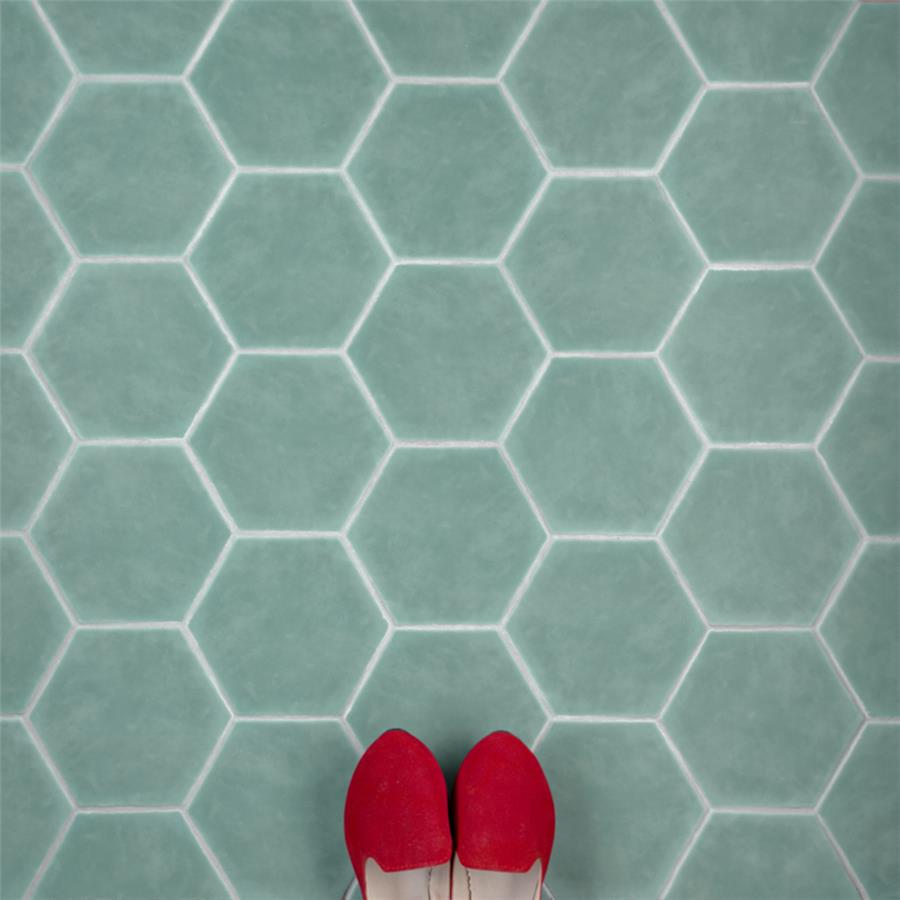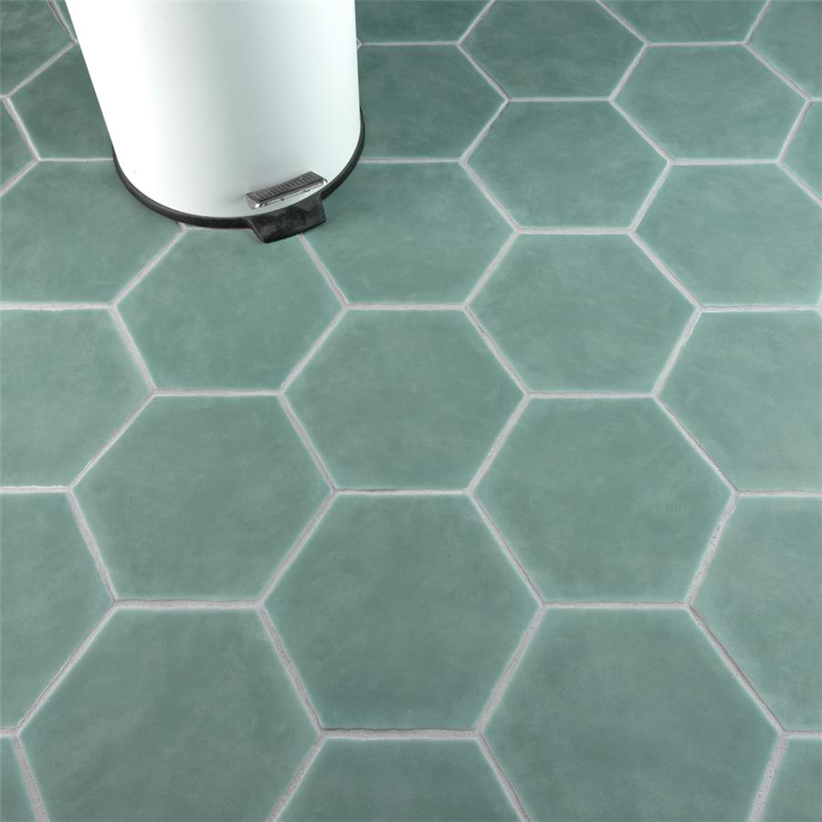 Capturing the simplicity of mid-century modern design, Our Palm Hex Turquoise 6” x 7” Porcelain Floor and Wall Tile is a subtle infusion of soft color and shape. This hexagon shaped tile creates stunning visual effects through a soft pastel turquoise glaze that has subtle variations that are meant to replicate genuine hydraulic tiles. This dynamic display of geometric shape is visually appealing and versatile. To add further contrast and dimension to the design, this matte floor and wall tile features slight surface undulation and subtle edge irregularities, offering an organic handcrafted appearance. Its ADA-compliant, impervious, frost-resistant and durable features make this an ideal choice for both commercial and residential indoor and outdoor installations including, kitchens, bathrooms, backsplashes, showers, hallways, entryways, patios and fireplace facades. Tiles in our Palm Collection are