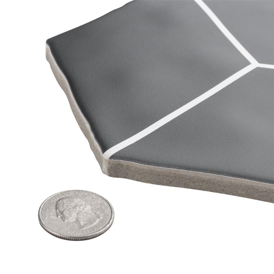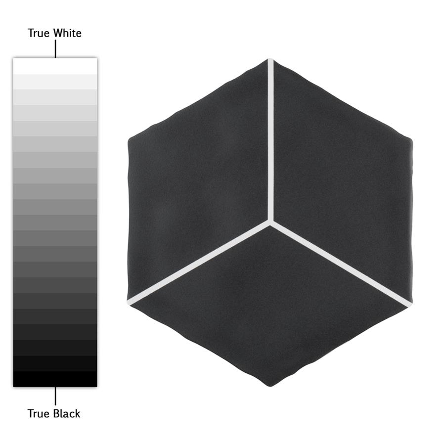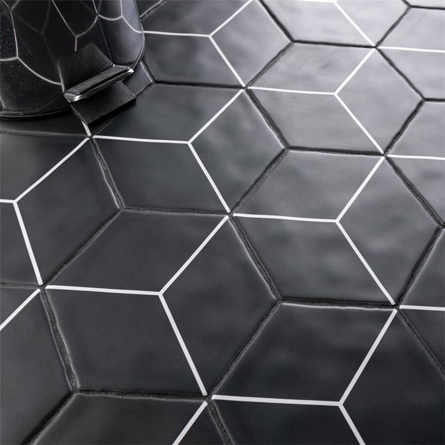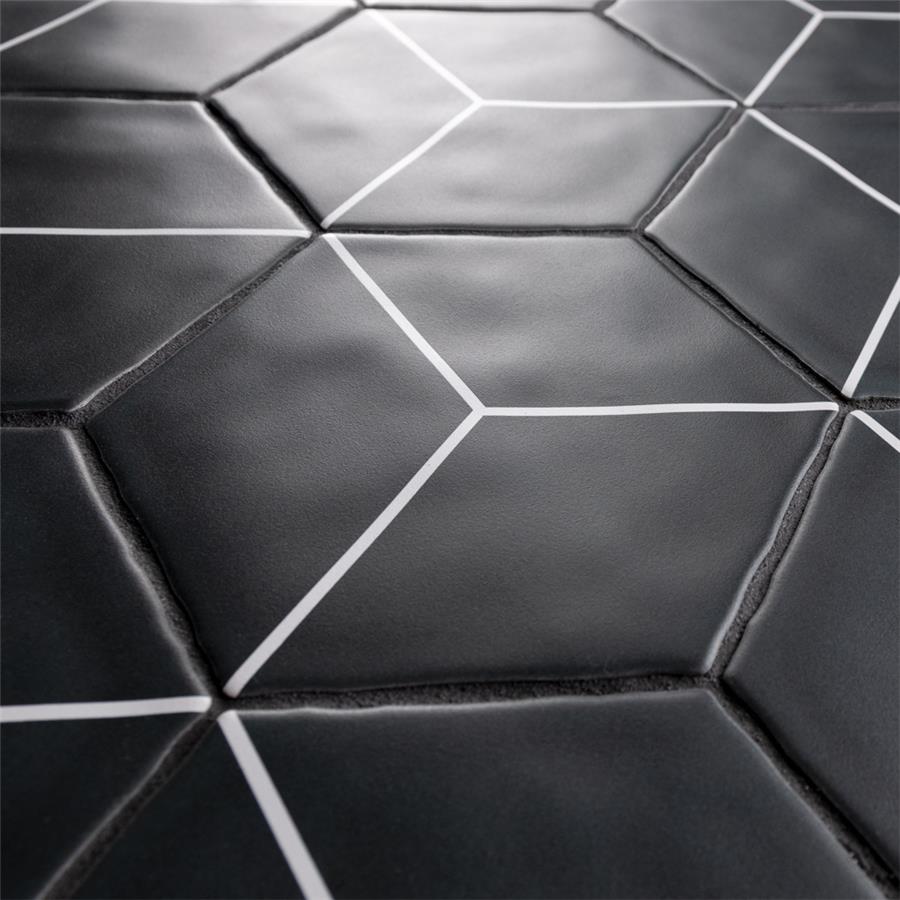Featuring a sleek black and white monochromatic design, our Palm Rombo Hex Black 6” x 7” Porcelain Floor and Wall Tile radiates mid-century modern design. This hexagon shaped tile creates captivating 3D visual effects through linear rhombus patterns that extend across the surface. Bright white lines are set amongst a charcoal black backdrop that has subtle variations that are meant to replicate genuine hydraulic tiles. This dynamic display of geometric pattern is visually appealing and versatile, and can redefine spaces through a graphic aesthetic. To add further contrast and dimension to the design, this matte floor and wall tile features slight surface undulation and subtle edge irregularities, offering an organic handcrafted appearance. Its ADA-compliant, impervious, frost-resistant and durable features make this an ideal choice for both commercial and residential indoor and outdoor installations including, kitchens, bathrooms, backsplashes, showers, hallways, entryways, patios and fireplace facades. Tiles in our Palm Collection are bicottura or double-fired, which ensures each tile is precisely calibrated to allow for installation consistency and the use of tighter grout joints. The second firing of the tile creates a stunning rich glazing effect that cannot be achieved with a single fire process. These tiles are also mono-color, meaning the colors remain consistent between production runs. Tile is the better choice for your space. This tile is made from natural ingredients, making it a healthy choice as it is free from allergens, VOCs, formaldehyde and PVC.Try out our grout test below to determine which grout color suits your design preferences.