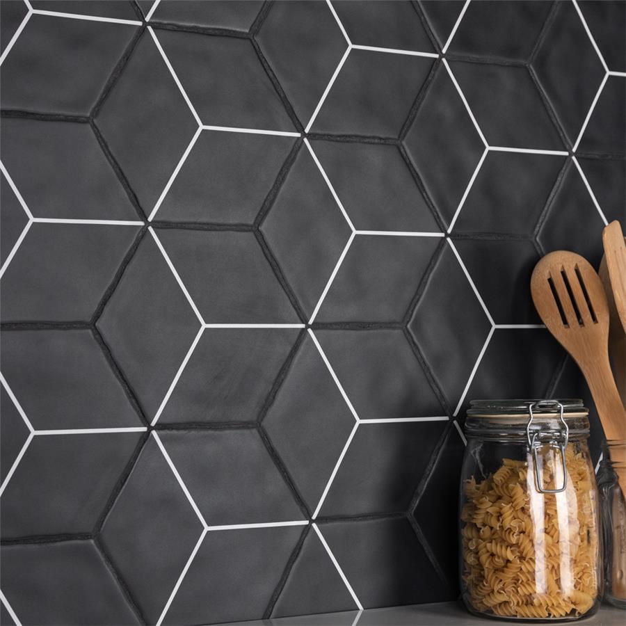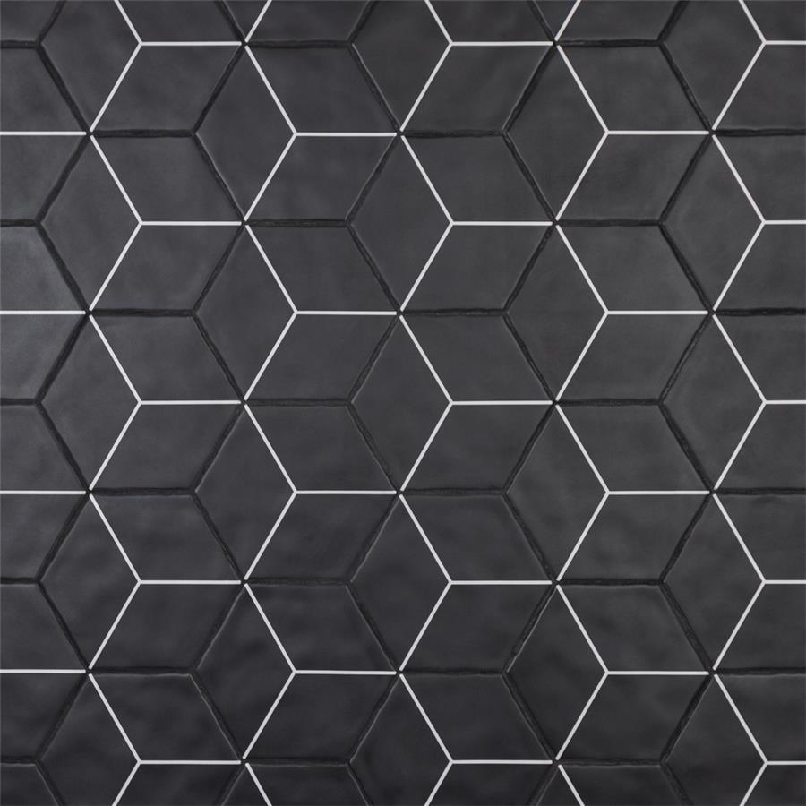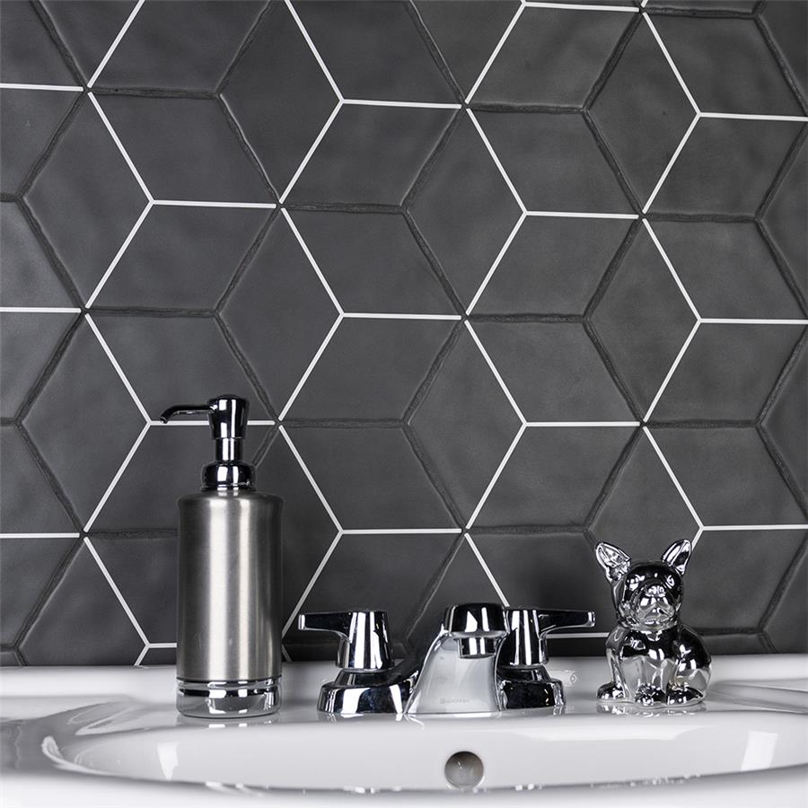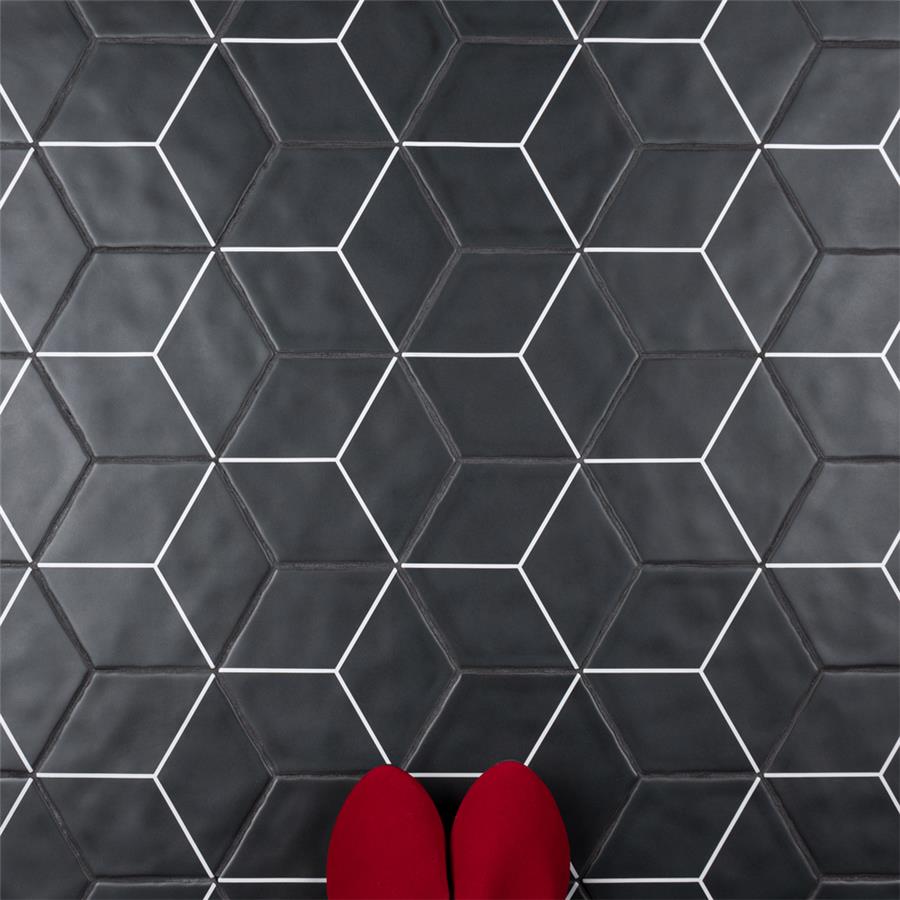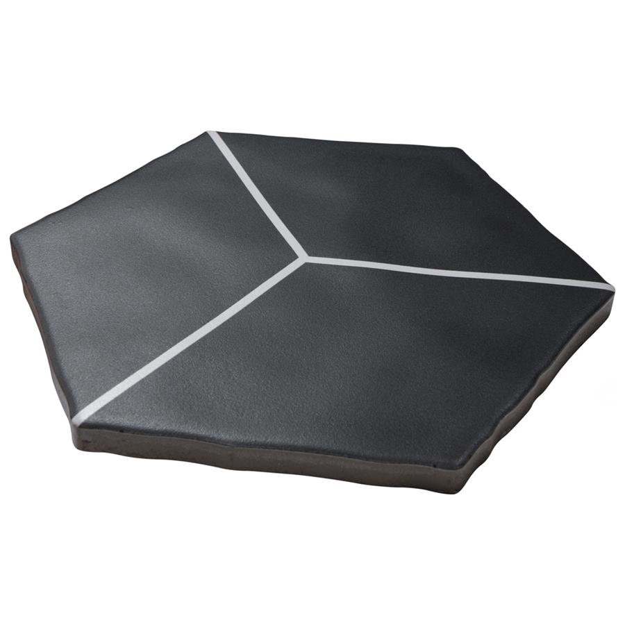 Featuring a sleek black and white monochromatic design, our Palm Rombo Hex Black 6” x 7” Porcelain Floor and Wall Tile radiates mid-century modern design. This hexagon shaped tile creates captivating 3D visual effects through linear rhombus patterns that extend across the surface. Bright white lines are set amongst a charcoal black backdrop that has subtle variations that are meant to replicate genuine hydraulic tiles. This dynamic display of geometric pattern is visually appealing and versatile, and can redefine spaces through a graphic aesthetic. To add further contrast and dimension to the design, this matte floor and wall tile features slight surface undulation and subtle edge irregularities, offering an organic handcrafted appearance. Its ADA-compliant, impervious, frost-resistant and durable features make this an ideal choice for both commercial and residential indoor and outdoor installations including, kitchens, bathrooms, backsplashes, showers, hallways, entryways, patios and fireplace facades. Tiles in our Palm Collection are bicottura or double-fired, which ensures each tile is precisely calibrated to allow for installation consistency and the use of tighter grout joints. The second firing of the tile creates a stunning rich glazing effect that cannot be achieved with a single fire process. These tiles are also mono-color, meaning the colors remain consistent between production runs. Tile is the better choice for your space. This tile is made from natural ingredients, making it a healthy choice as it is free from allergens, VOCs, formaldehyde and PVC.Try out our grout test below to determine which grout color suits your design preferences.