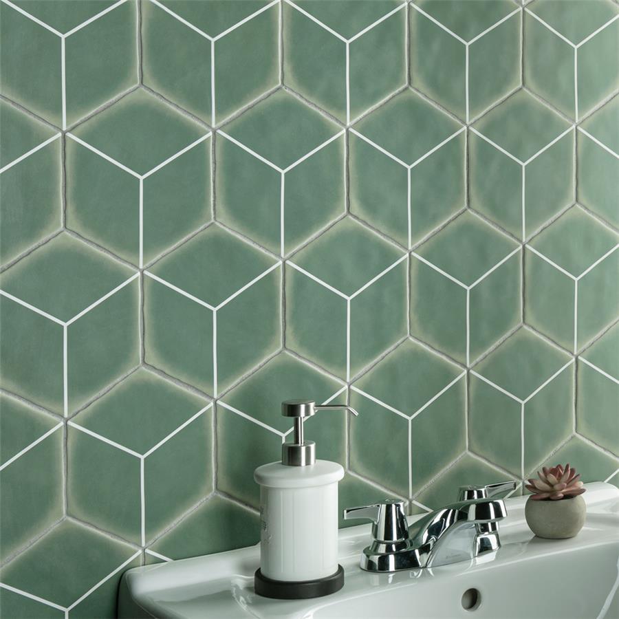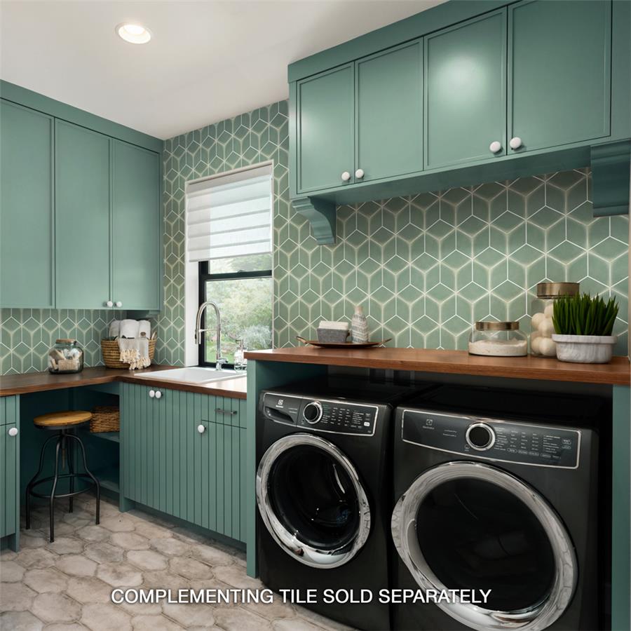 Featuring a blend of soft colors, shapes and lines, our Palm Rombo Hex Green 6” x 7” Porcelain Floor and Wall Tile radiates mid-century modern design. This hexagon shaped tile creates captivating 3D visual effects through linear rhombus patterns that extend across the surface. Bright white lines are set amongst a soft pastel green backdrop that has subtle variations that are meant to replicate genuine hydraulic tiles. This dynamic display of geometric pattern is visually appealing and versatile, and can redefine spaces through a graphic aesthetic. To add further contrast and dimension to the design, this matte floor and wall tile features slight surface undulation and subtle edge irregularities, offering an organic handcrafted appearance. Its ADA-compliant, impervious, frost-resistant and durable features make this an ideal choice for both commercial and residential indoor and outdoor installations including, kitchens, bathrooms, backsplashes, showers, hallways, entryways, patios and fireplace facades. Tiles in our Palm Collection arebicottura or double-fired, which ensures each tile is precisely calibrated to allow for installation consistency and the use of tighter grout joints. The second firing of the tile creates a stunning rich glazing effect that cannot be achieved with a single fire process. These tiles are also mono-color, meaning the colors remain consistent between production runs. Tile is the better choice for your space. This tile is made from natural ingredients, making it a healthy choice as it is free from allergens, VOCs, formaldehyde and PVC.Try out our grout test below to determine which grout color suits your design preferences.