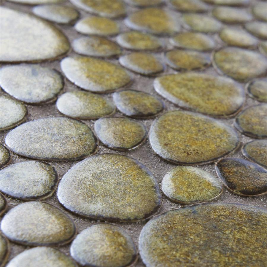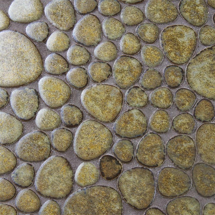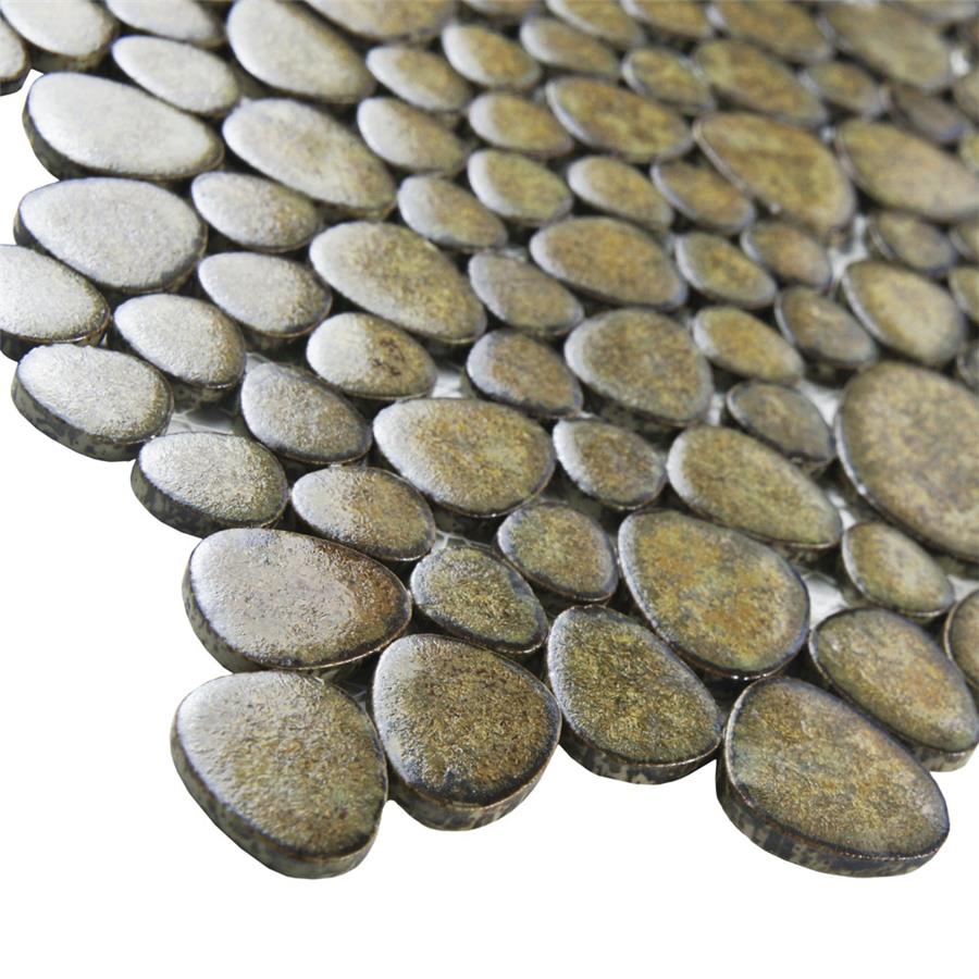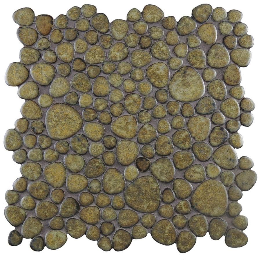 The nature-inspired SomerTile Pebble Brownstone 11 in. x 11 in. x 6 mm Porcelain Mosaic Tile incorporates organic shapes and randomly sized pebble-shaped tiles to create an exciting aesthetic touch. This tile features a glazed surface and features a mix of brown and gold tones to create a look that complements a variety of design schemes. The strong mesh backing material makes for easy installation and the durable porcelain material and impervious water absorption rating make this tile a great choice for indoor and outdoor applications.Tile is the better choice for your space. This tile is made from natural ingredients, making it a healthy choice as it is free from allergens, VOCs, formaldehyde and PVC.