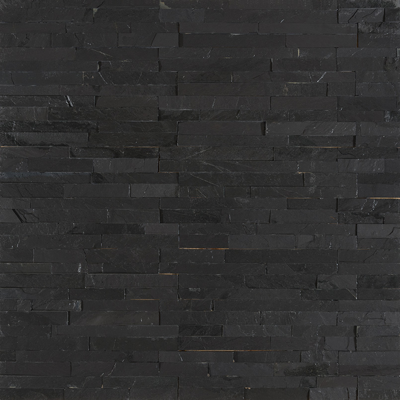 Premium Black Mini Stacked Stone Panels feature a stunning blend of black hues for a look that runs traditional to contemporary. A petite version of our traditional stacked stone panels, these 4.5×16 split face slate panels are perfectly sized for easy backsplash installation. This backsplash tile is also a wonderful choice for features walls, accent borders, niches—or nearly any vertical space where a touch of natural beauty is welcomed, even outdoors.Featuring stepped cut ends, they fit together quickly and easily for seamless alignment, and no grout is required. Giving your space a fresh new look has never been easier.