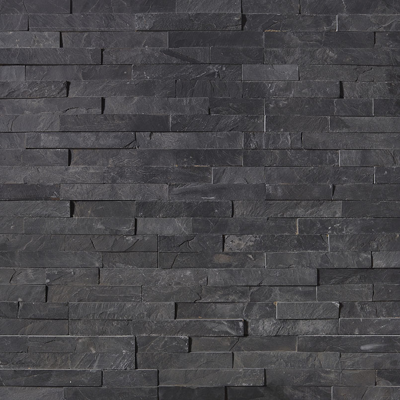 Premium Black Stacked Stone is a solid deep black, low variation durable slate. Use to create a unique slate backsplash or accent wall. This backsplash tile is perfect for both interior and exterior usage.