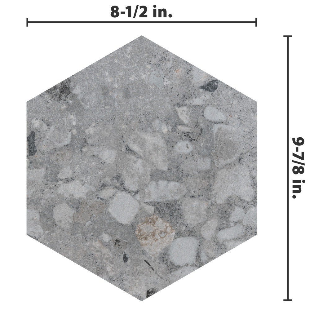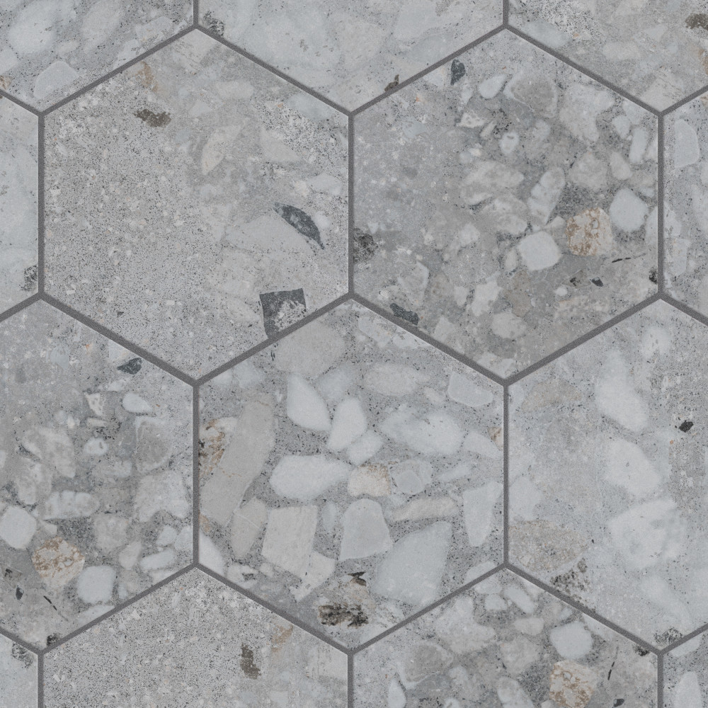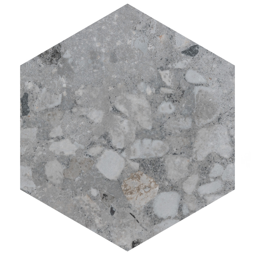 Replicating a terrazzo look, our Recycle Hex River White Porcelain Floor and Wall Tile features a medium textured, mixed finish, making it a great choice for your space. With its impervious, frost-resistant features, this gray hexagon tile is an ideal selection for both indoor and outdoor commercial and residential installations, including kitchens, bathrooms, backsplashes, showers, hallways, entryways, patios and fireplace facades. This tile is a perfect choice on its own or paired with other products in the Recycle Hex River Collection. Tile is the better choice for your space!